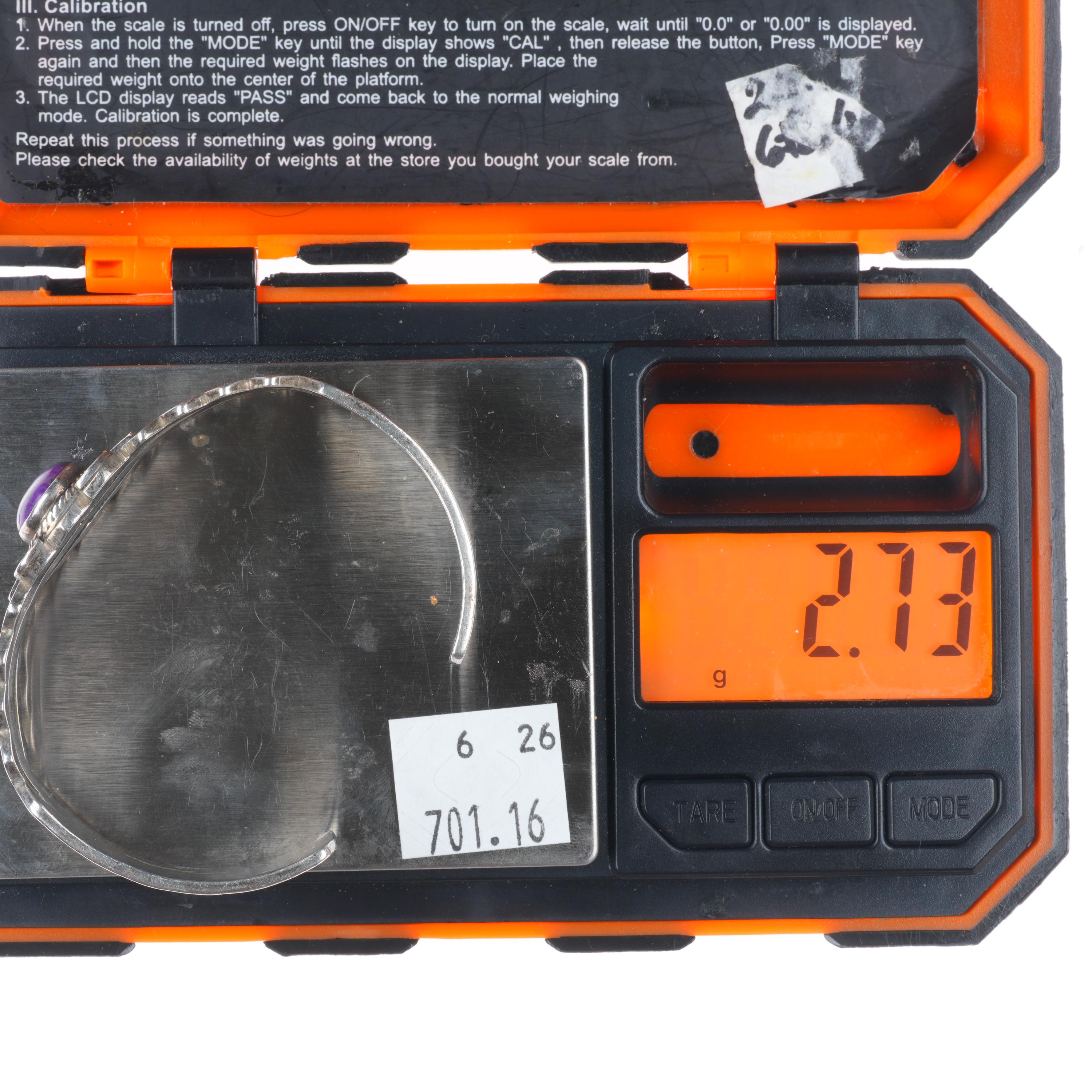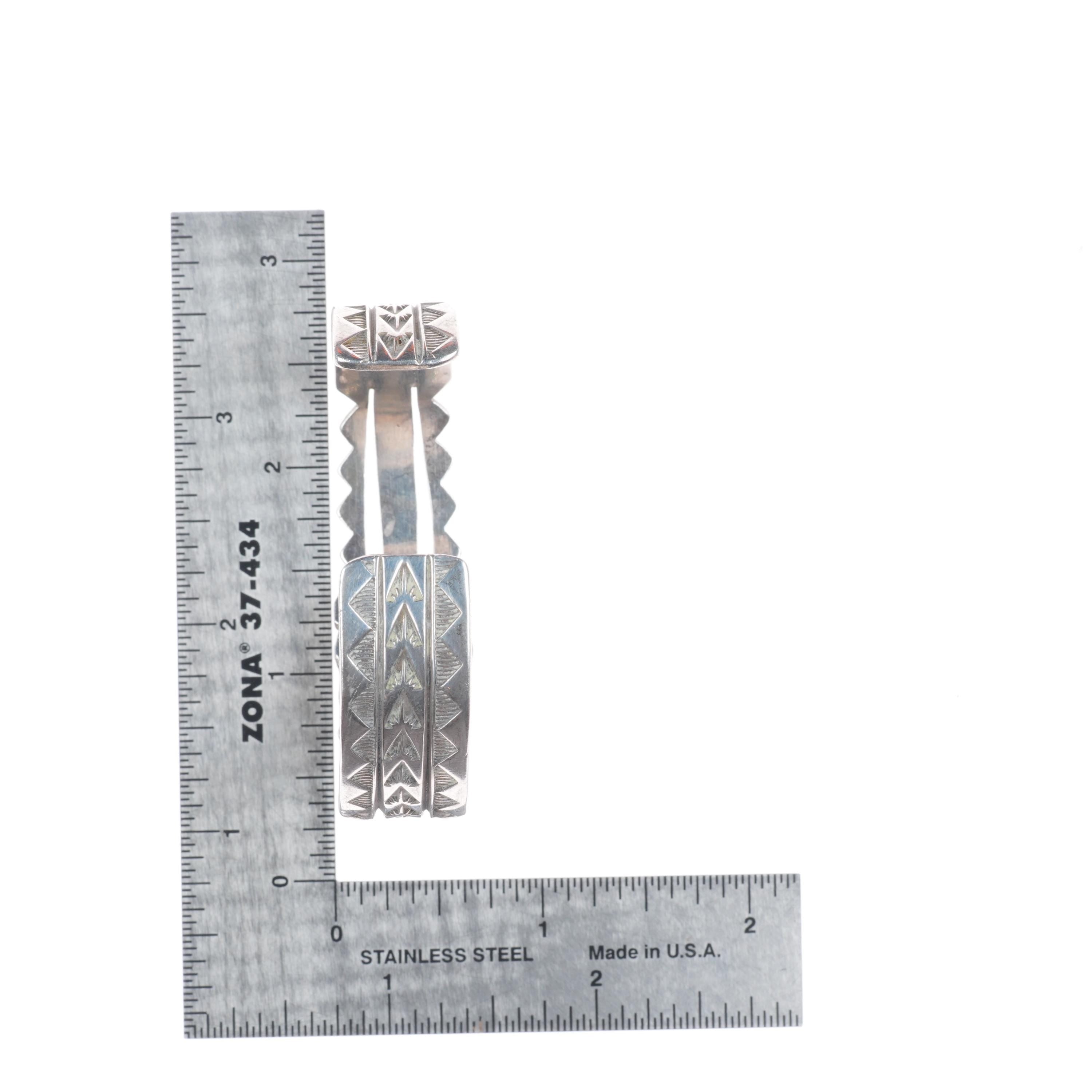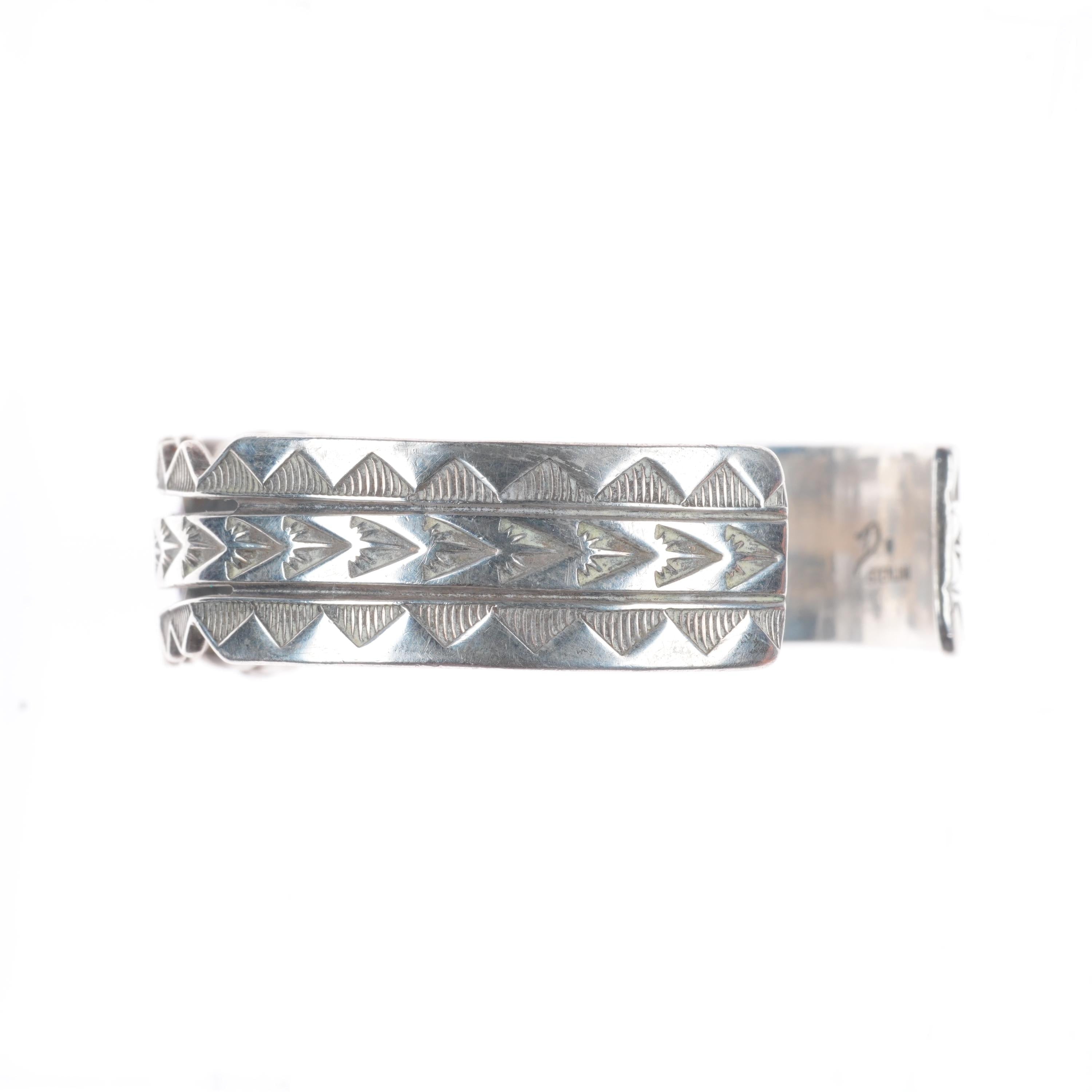 6.4" Vintage Navajo sterling silver sugilite deep stamped cuff bracelet. Tested and guaranteed solid sterling silver with weight and measurements in pictures. Great condition with age appropriate wear, circa last quarter of the 20th century. Illegible artists mark with shop mark, scale pic is wrong, approximately 25-30 grams.
