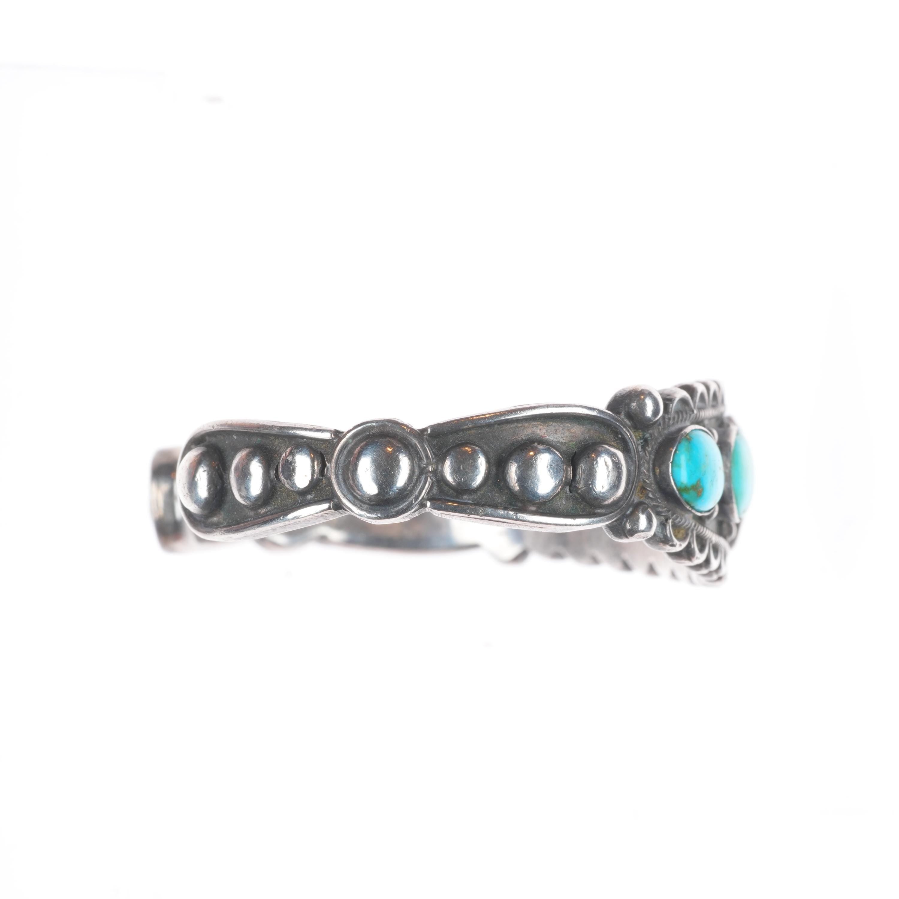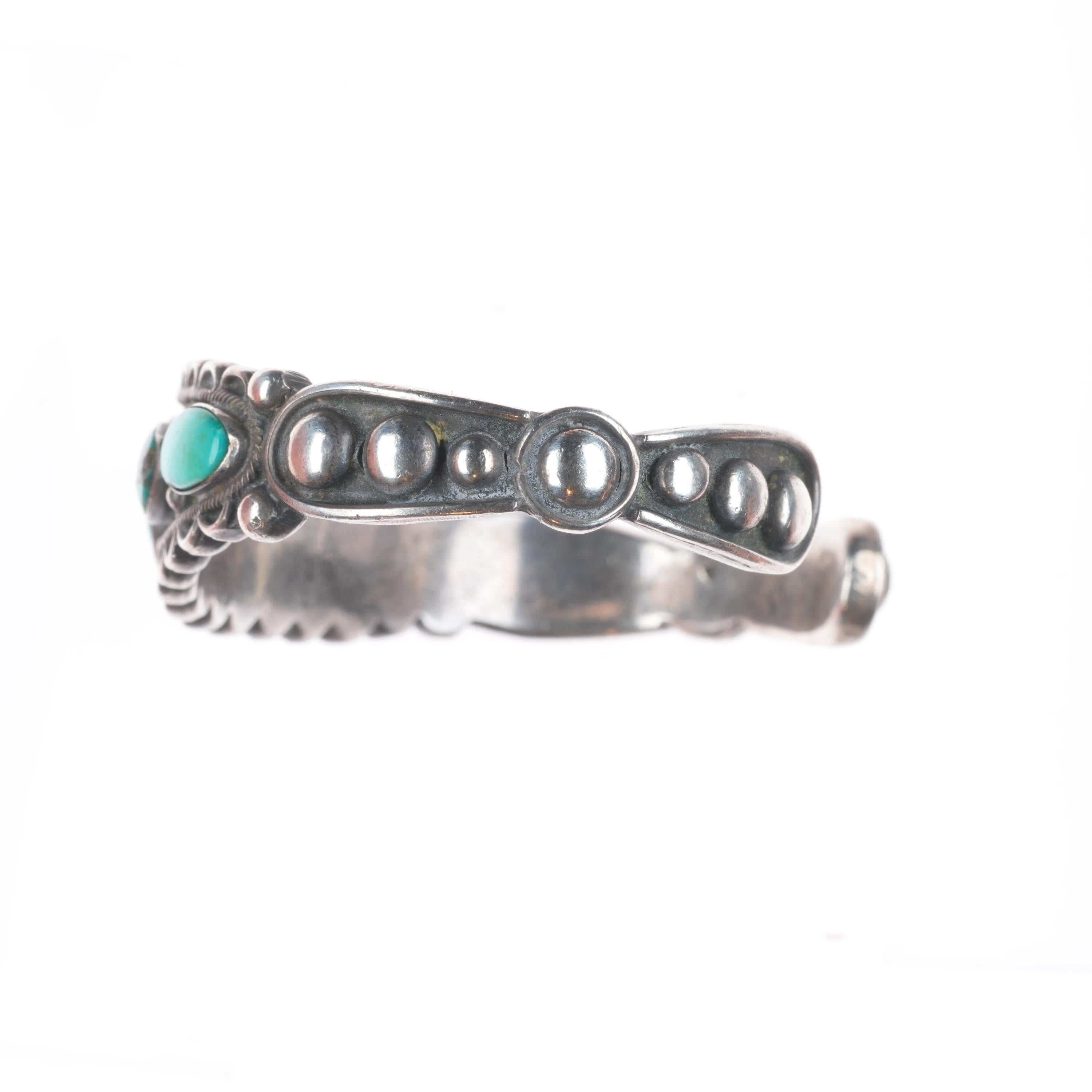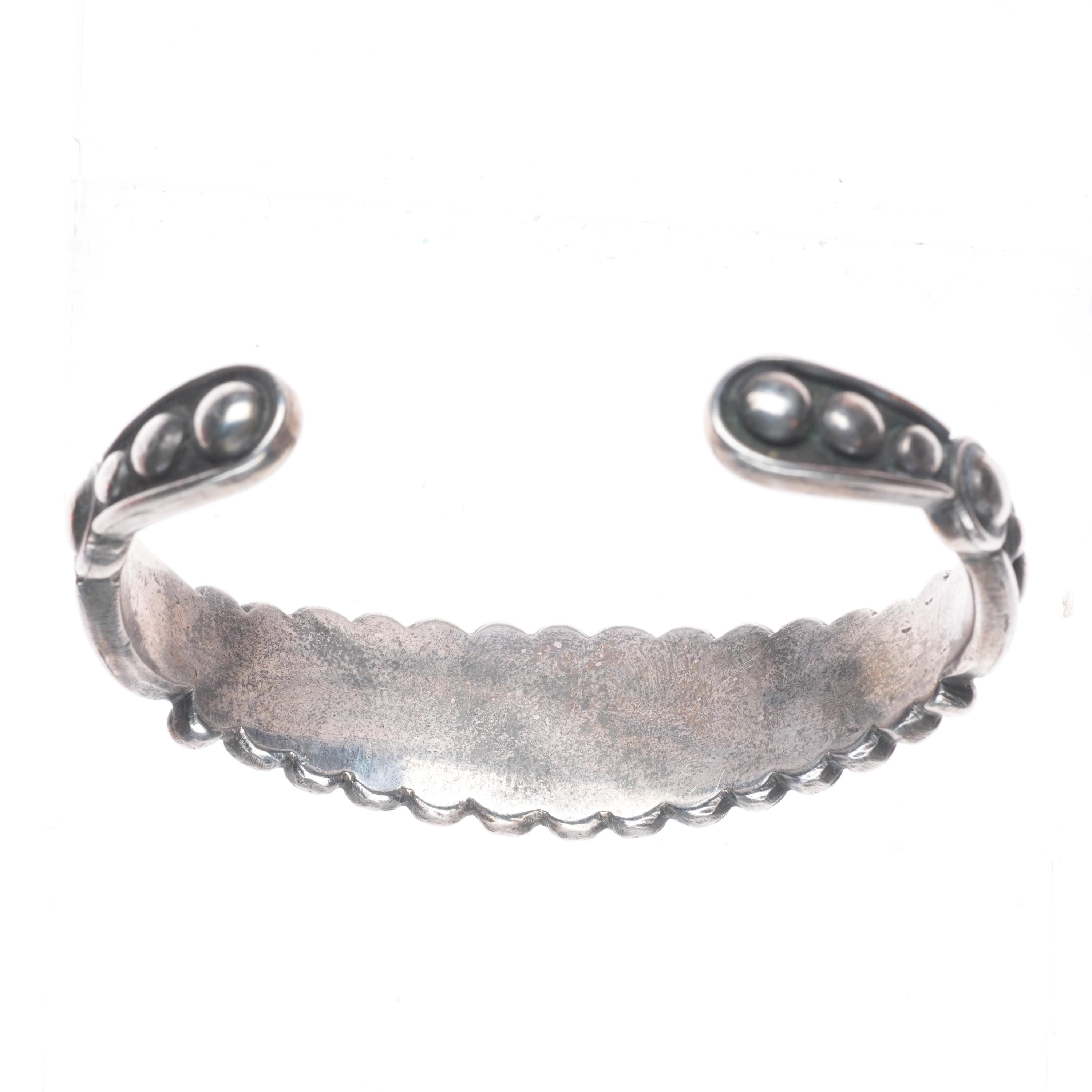 6.5" 1930's Navajo Ingot silver row cuff bracelet with ornate accents. Tested and guaranteed solid sterling silver with weight and measurements in pictures. Great condition with age appropriate wear, circa second quarter of the 20th century. Old/stable fractures in some stones. Scale pic is off, it's 45-50 grams.