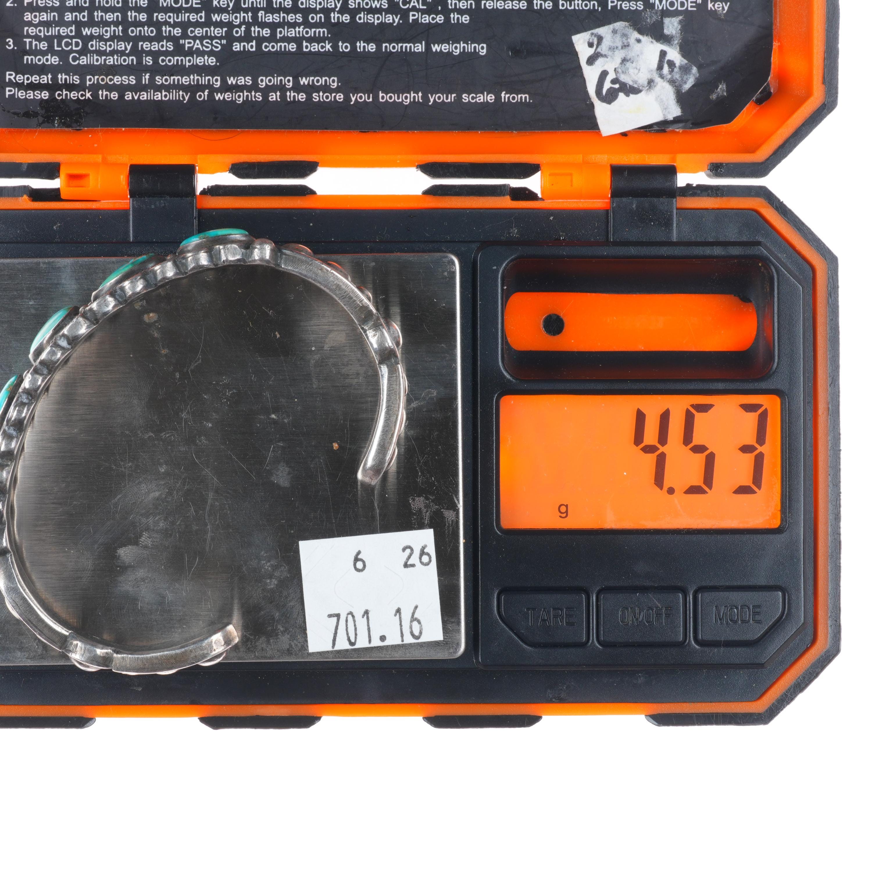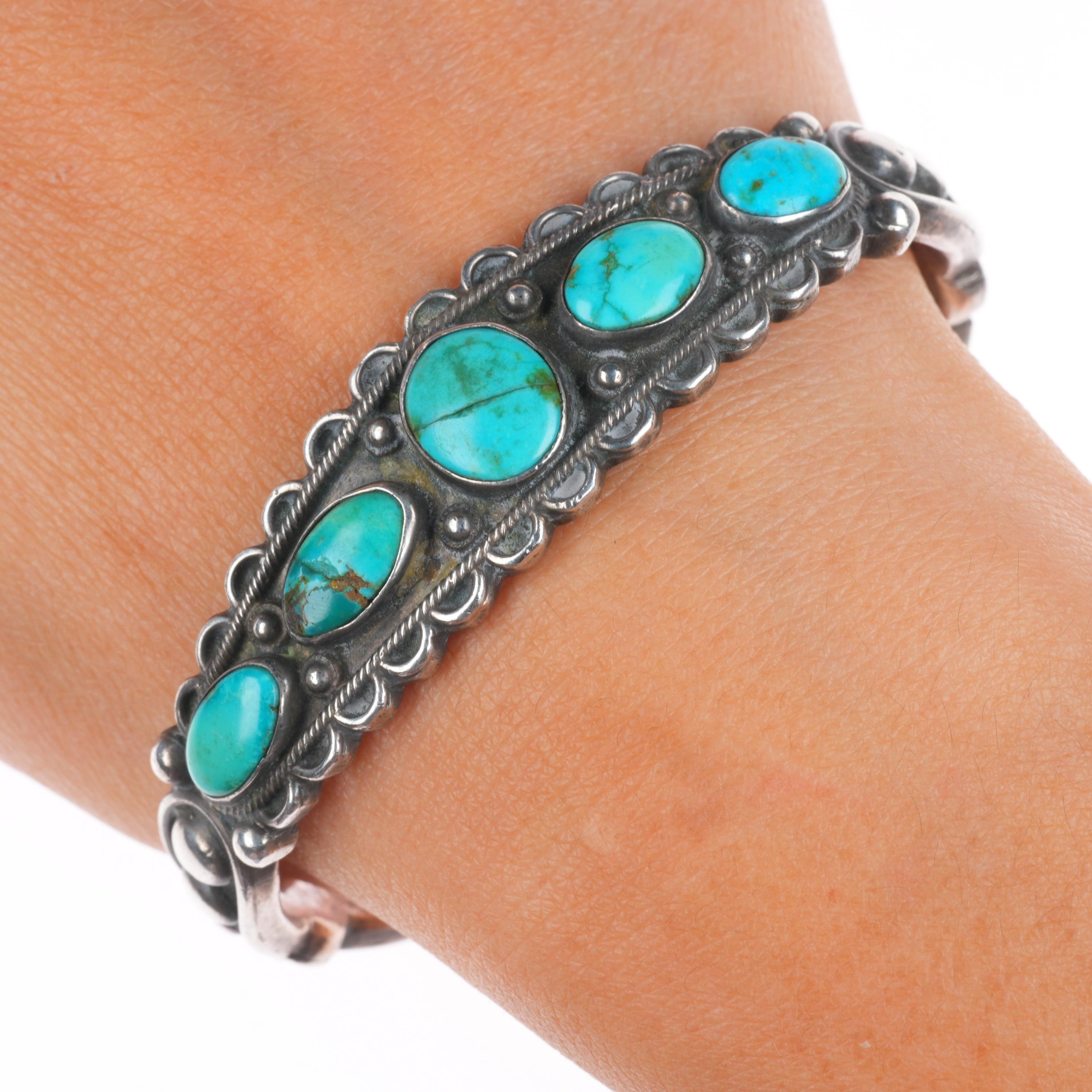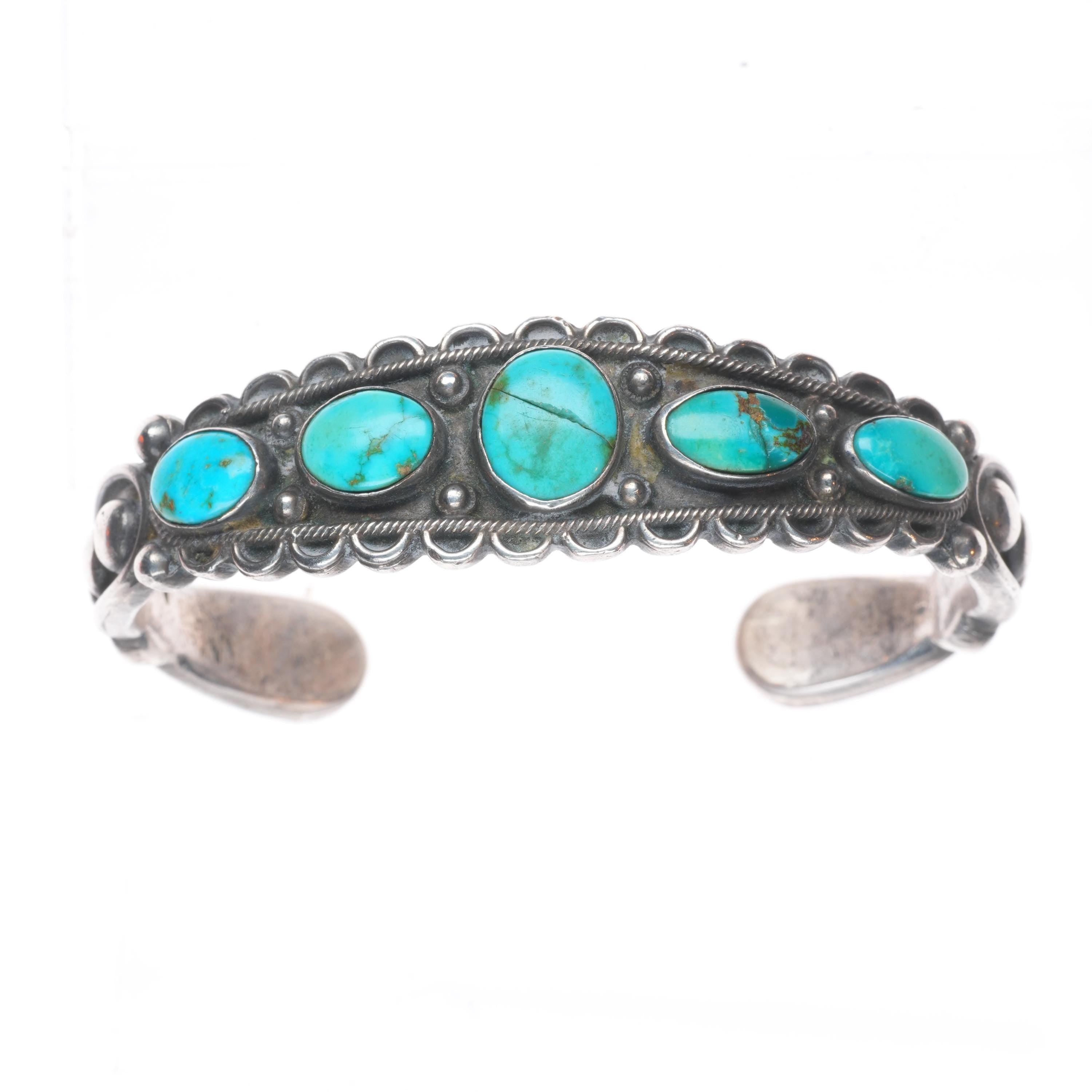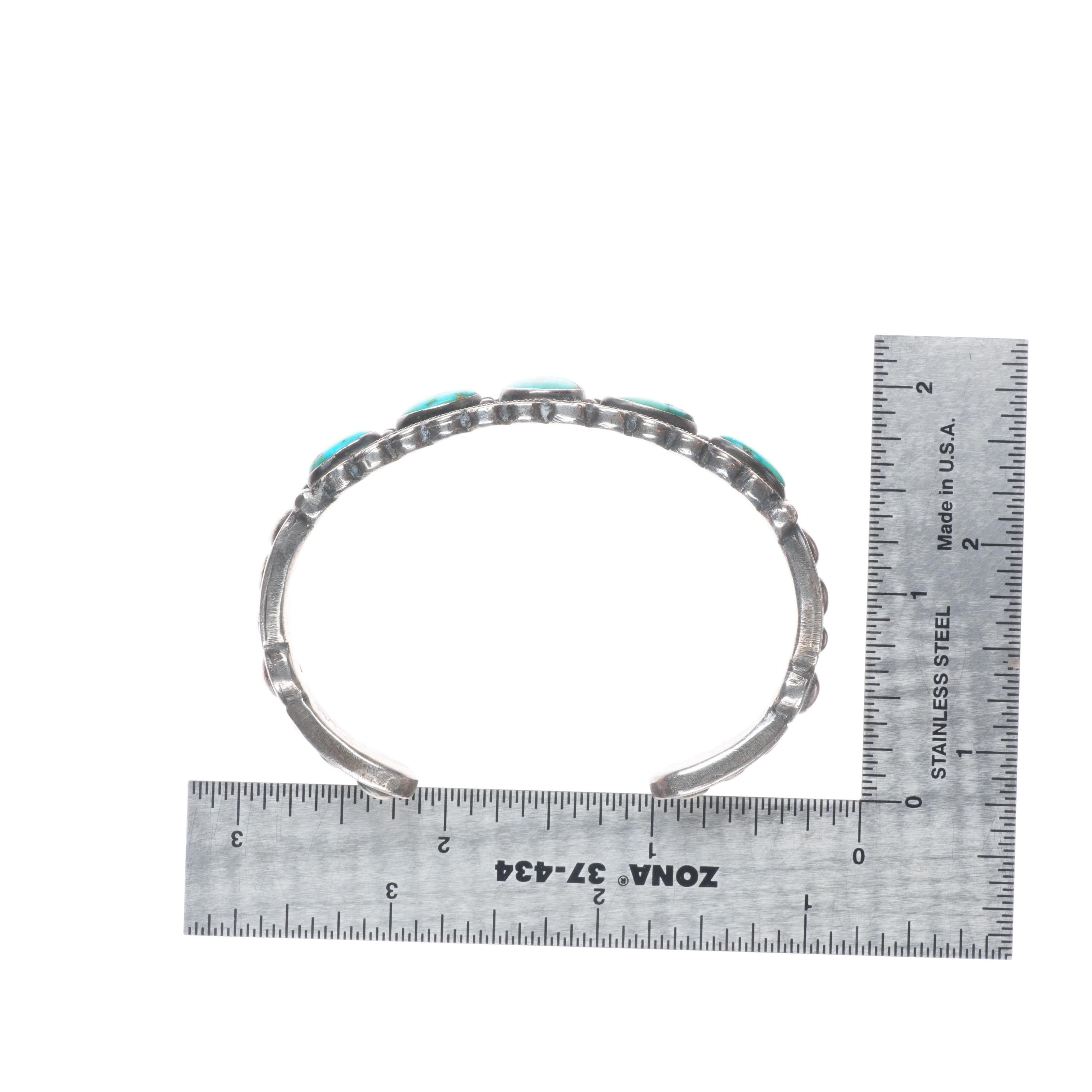6.5" 1930's Navajo Ingot silver row cuff bracelet with ornate accents. Tested and guaranteed solid sterling silver with weight and measurements in pictures. Great condition with age appropriate wear, circa second quarter of the 20th century. Old/stable fractures in some stones. Scale pic is off, it's 45-50 grams.