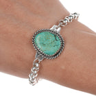 6 5/8 Vintage Native American sterling and turquoise ring turned bracelet. Nice ring from third quarter of the 20th century with more recent sterling chain added.