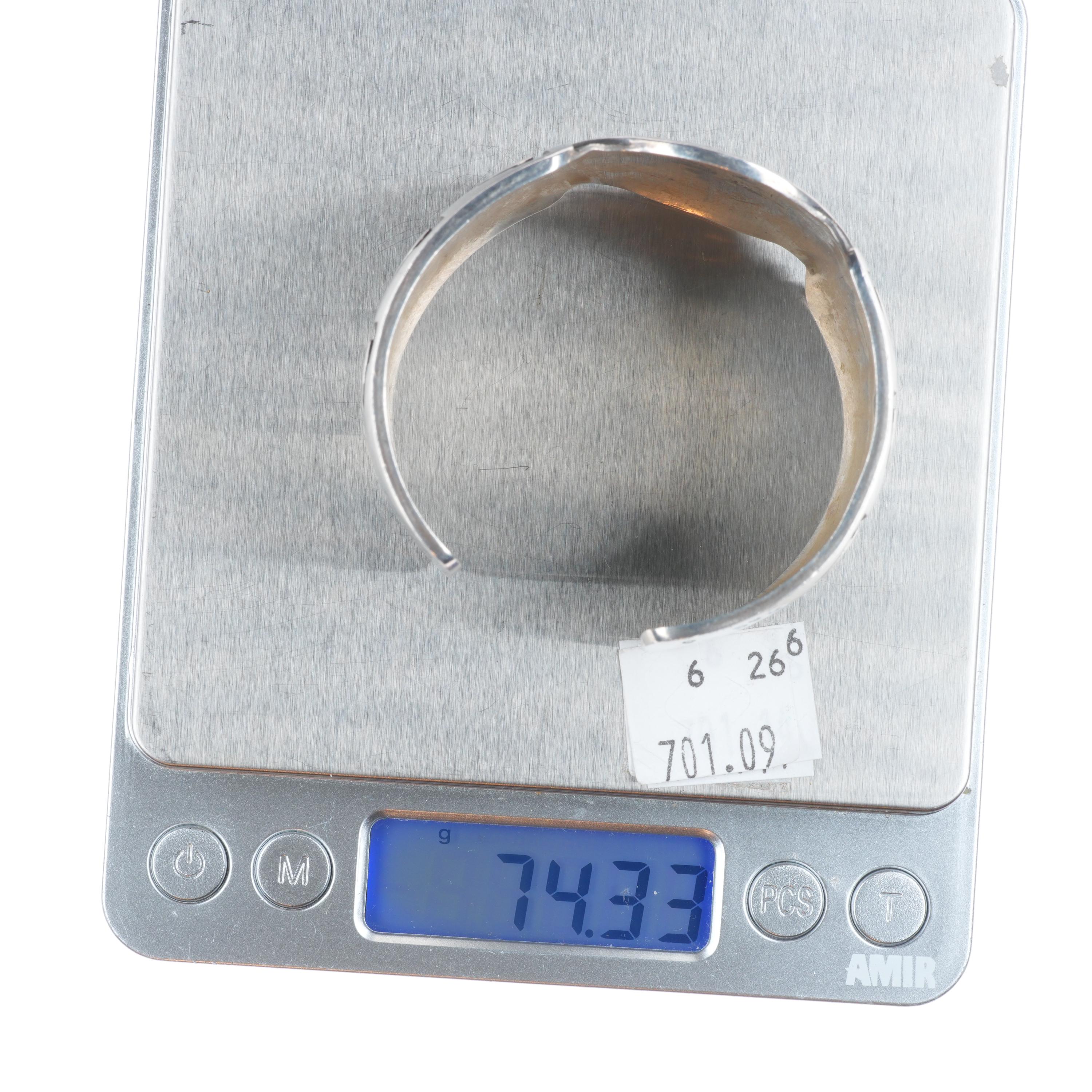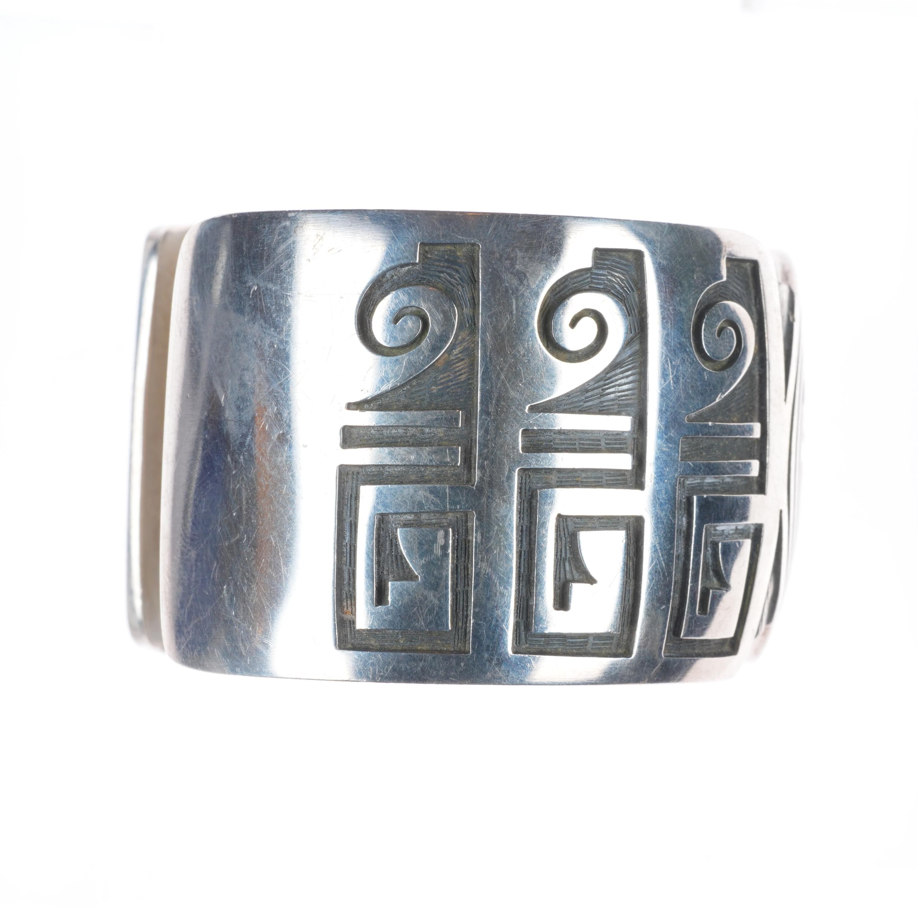 6.5" Harold Lomayaktewa Hopi overlay heavy sterling silver man in the maze cuff bracelet. Tested and guaranteed solid sterling silver with weight and measurements in pictures. Great condition with age appropriate wear, circa early fourth quarter of the 20th century.