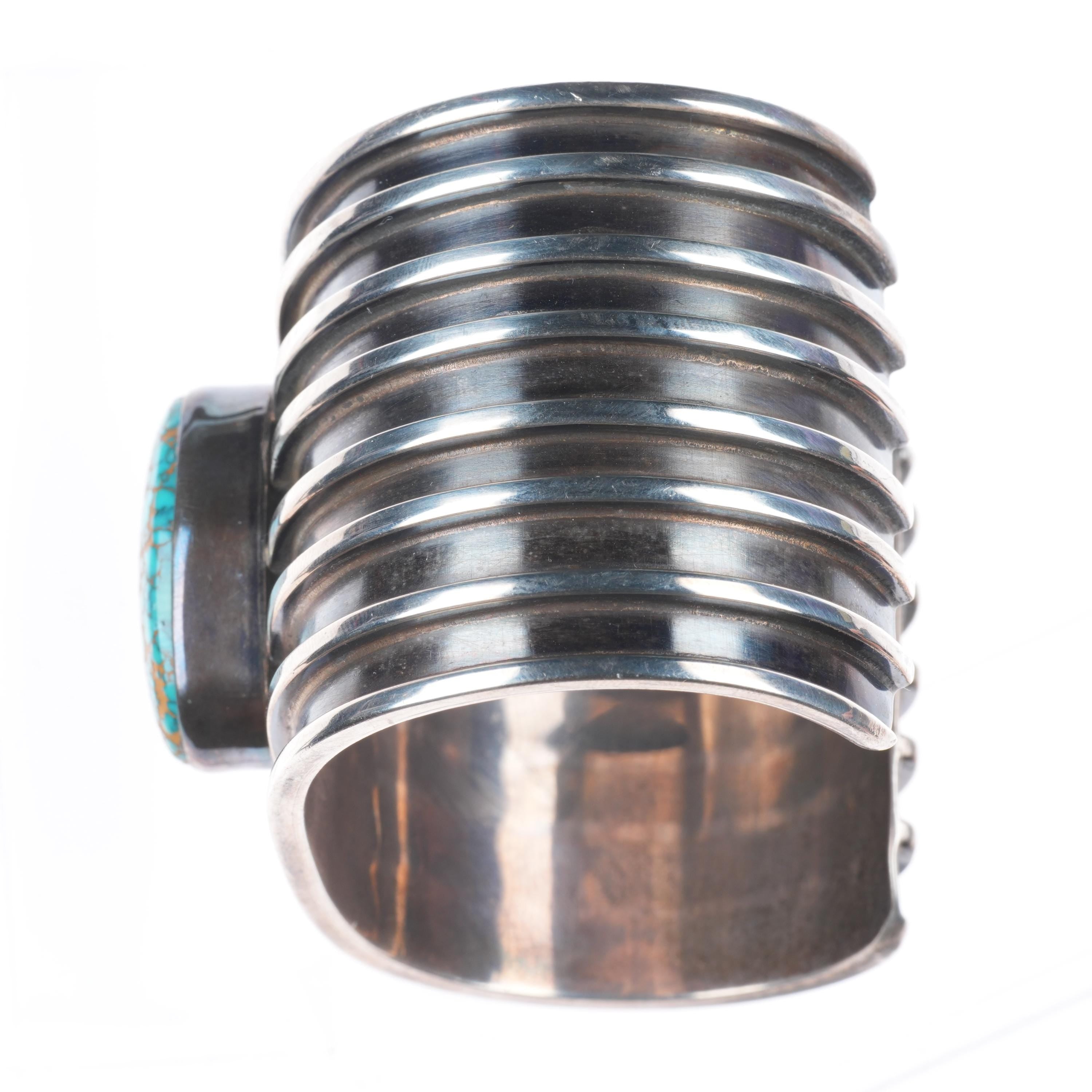 6.5" Indian Mountain Turquoise sterling silver cuff bracelet Tony Sanchez Isleta. Tested and guaranteed solid sterling silver, with weight and measurements in pictures, circa last quarter of the 20th century. Very high grade natural Indian Mountain turquoise from Nevada.