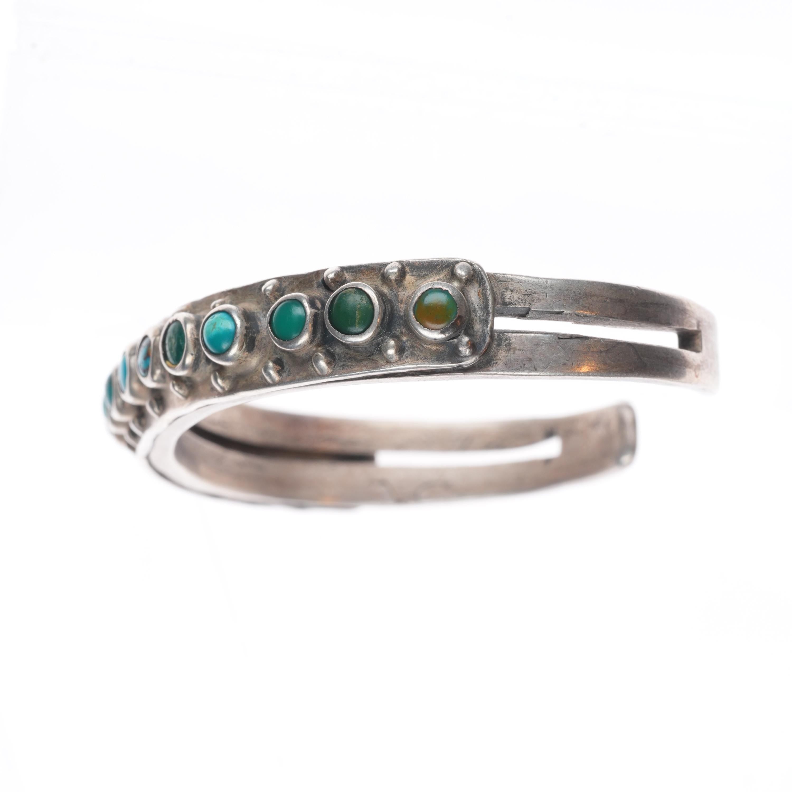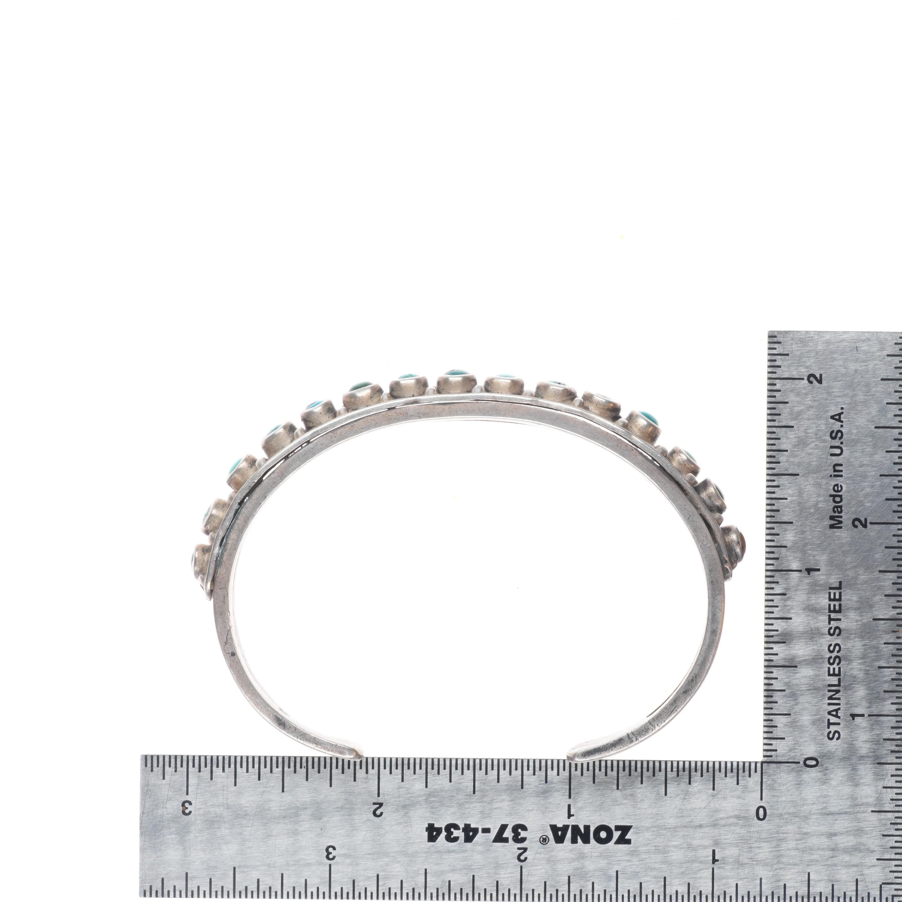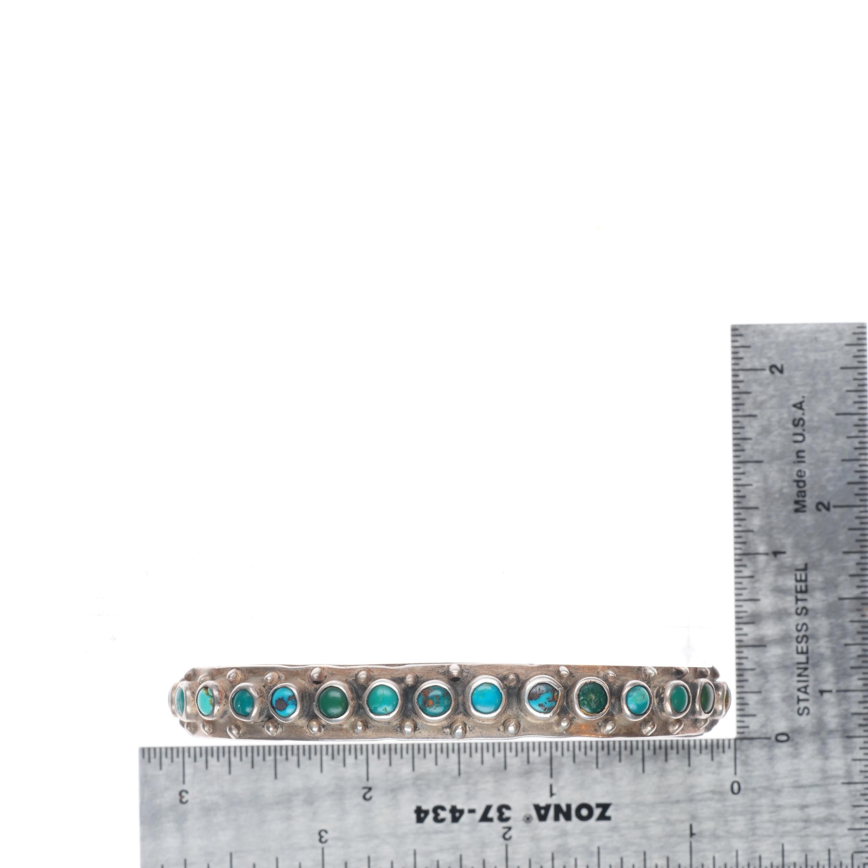 6.6" c1920‘s Antique Zuni ingot silver snake eye turquoise row cuff bracelet. Tested and guaranteed solid sterling silver with weight and measurements in pictures. Circa first quarter to early second quarter of the 20th century. Fits up to a 6.6" wrist without adjustment, though .25" or more adjustment is typically very simple. Any adjustment will change the gap size of course which is shown in the pictures.