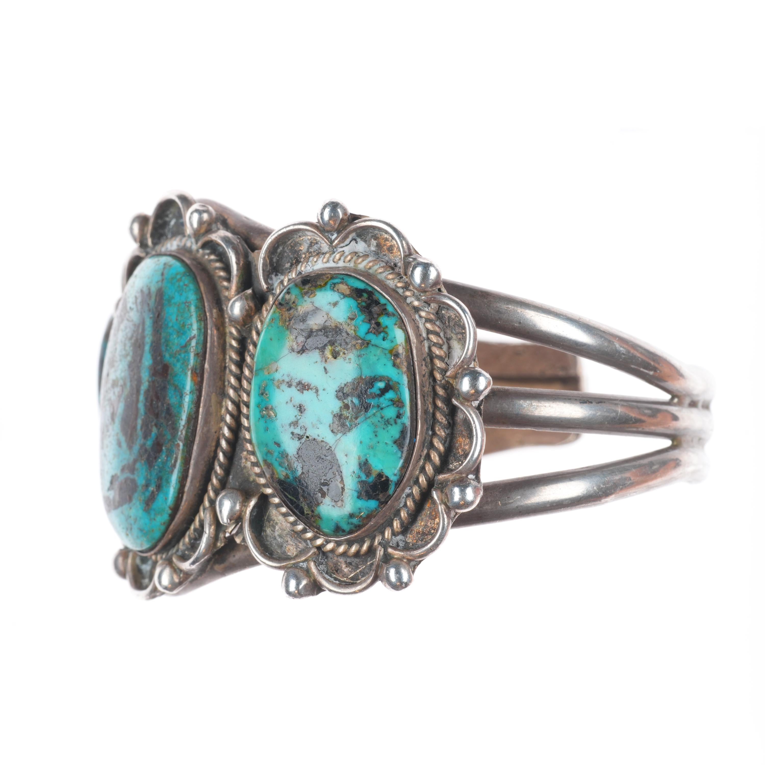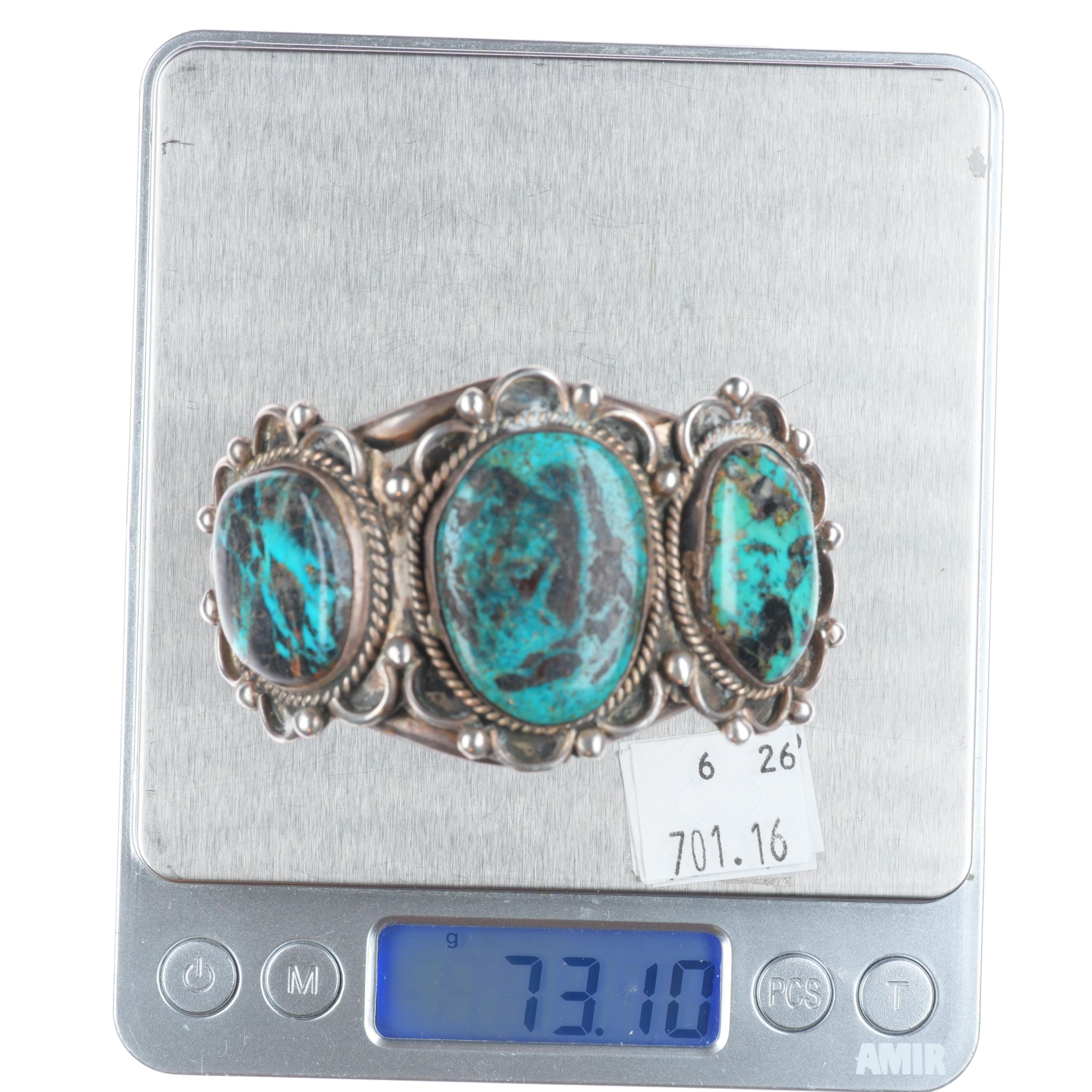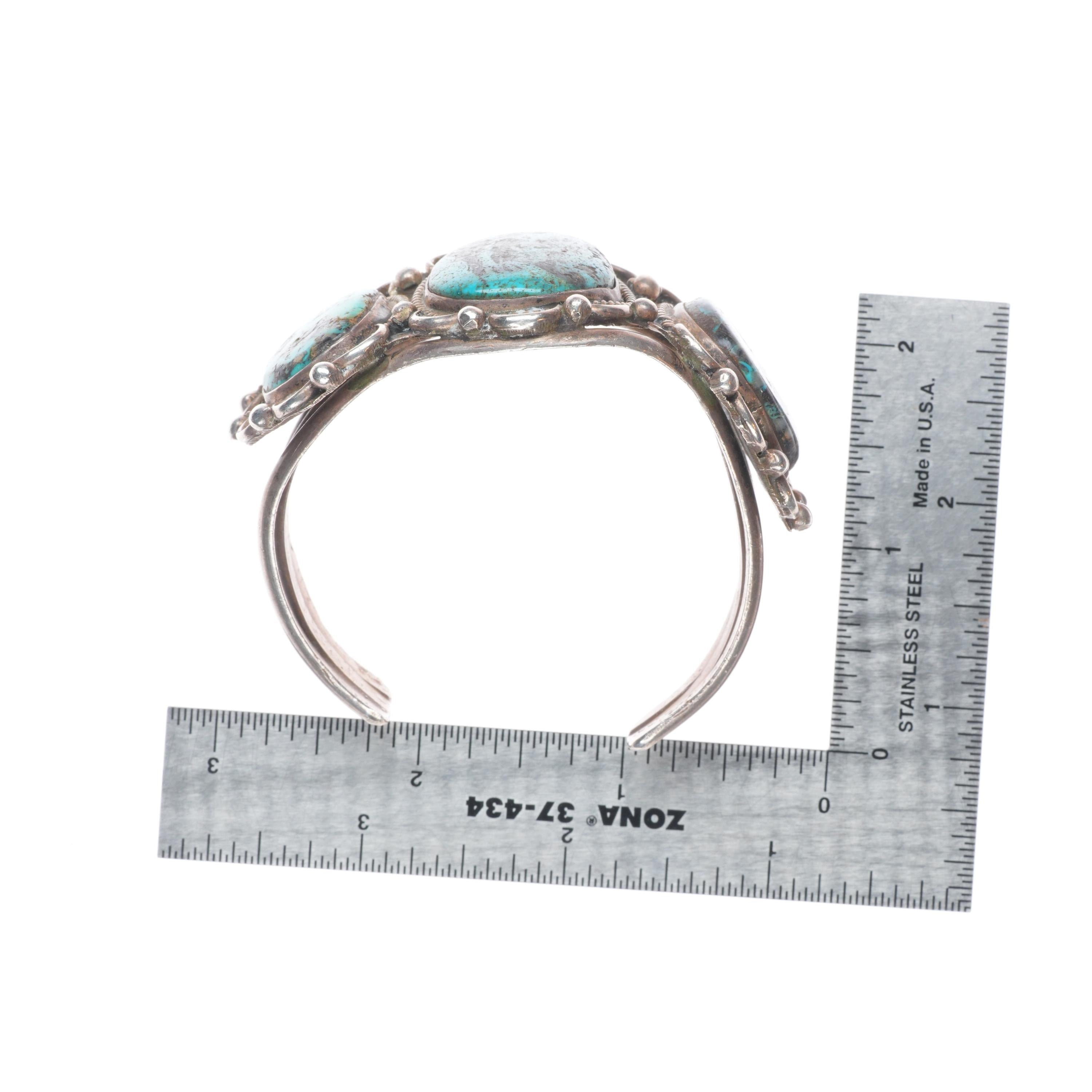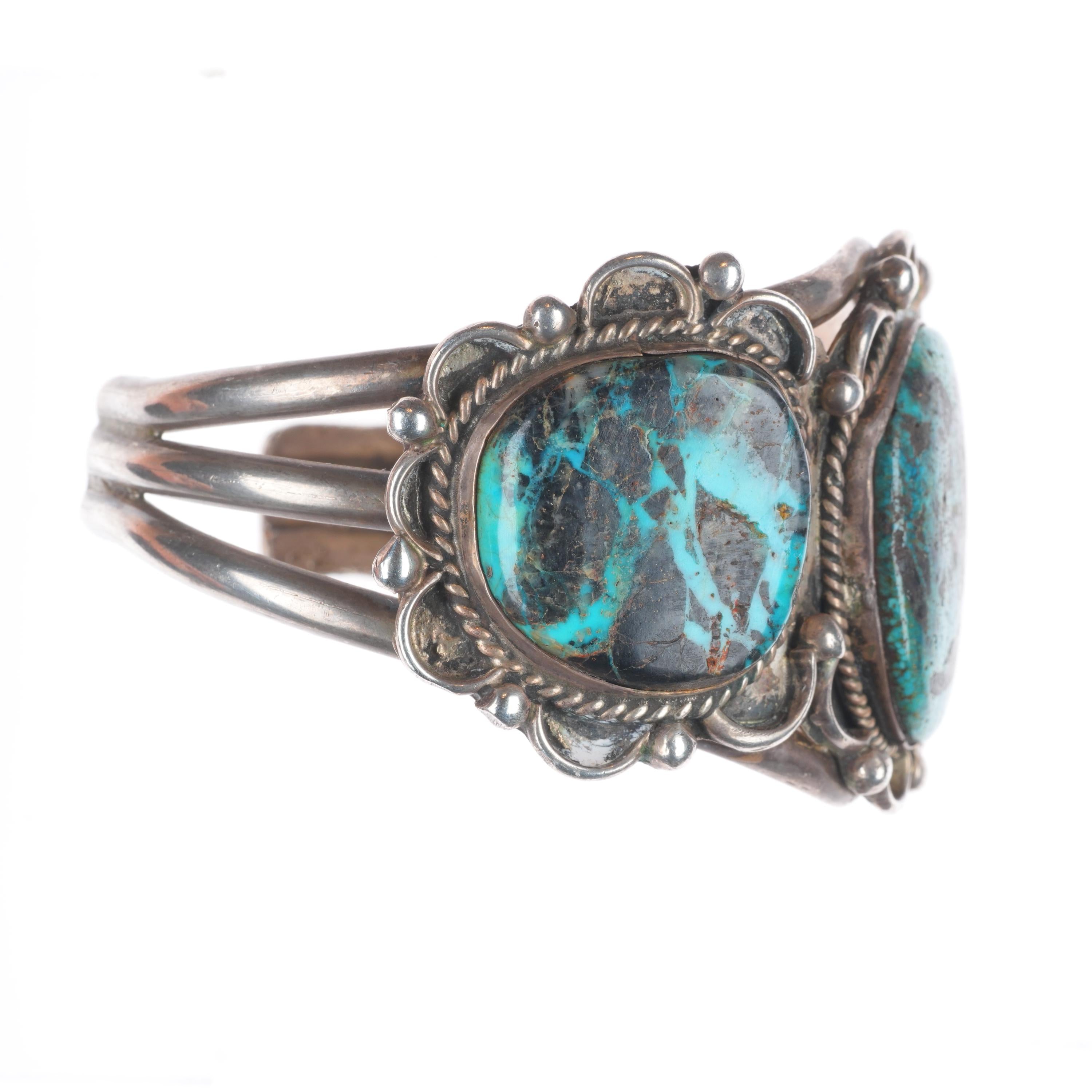 6.6" Vintage Blue Diamond turquoise Navajo sterling silver cuff bracelet. Tested and guaranteed solid sterling silver with weight and measurements in pictures. Great condition with age appropriate wear, circa third quarter of the 20th century.