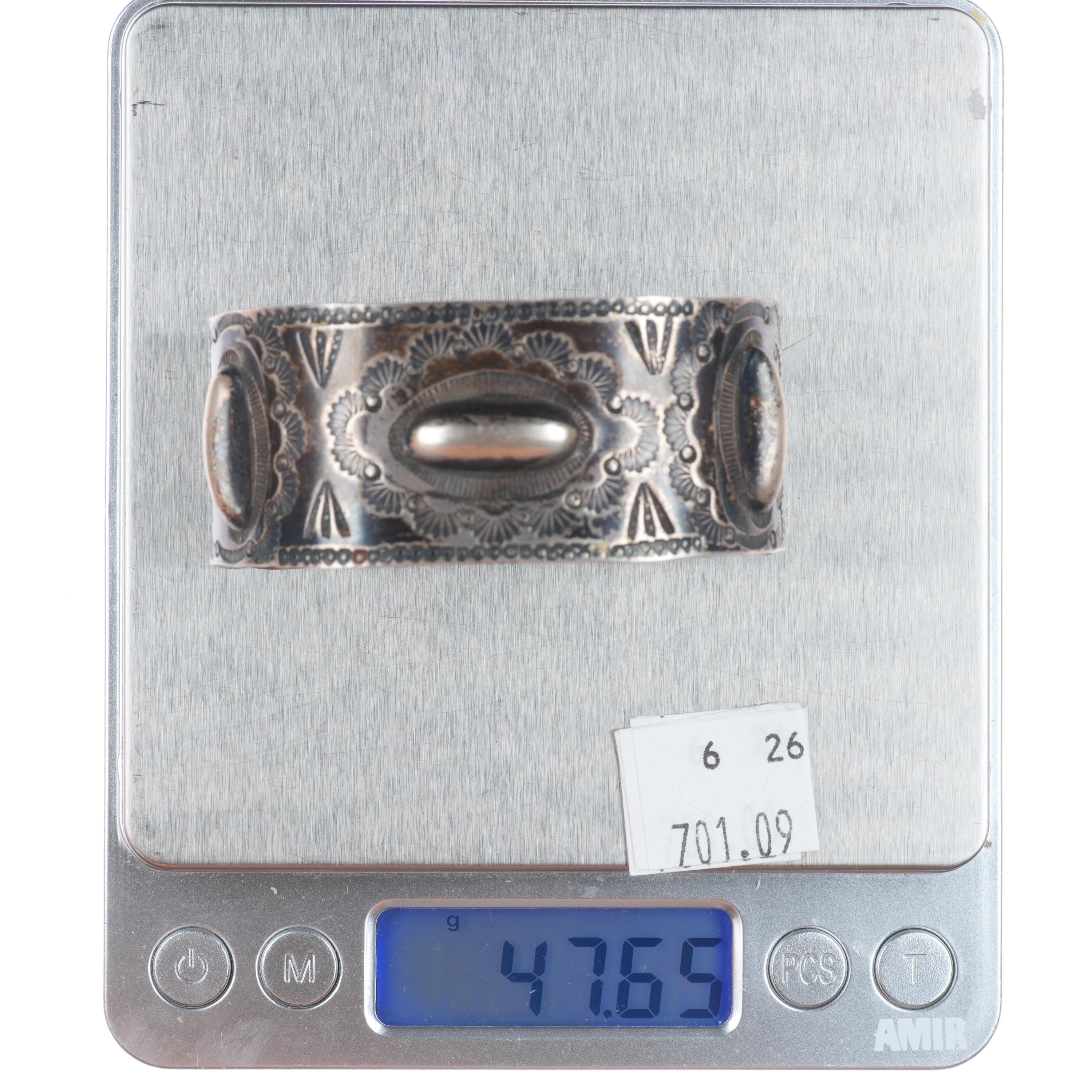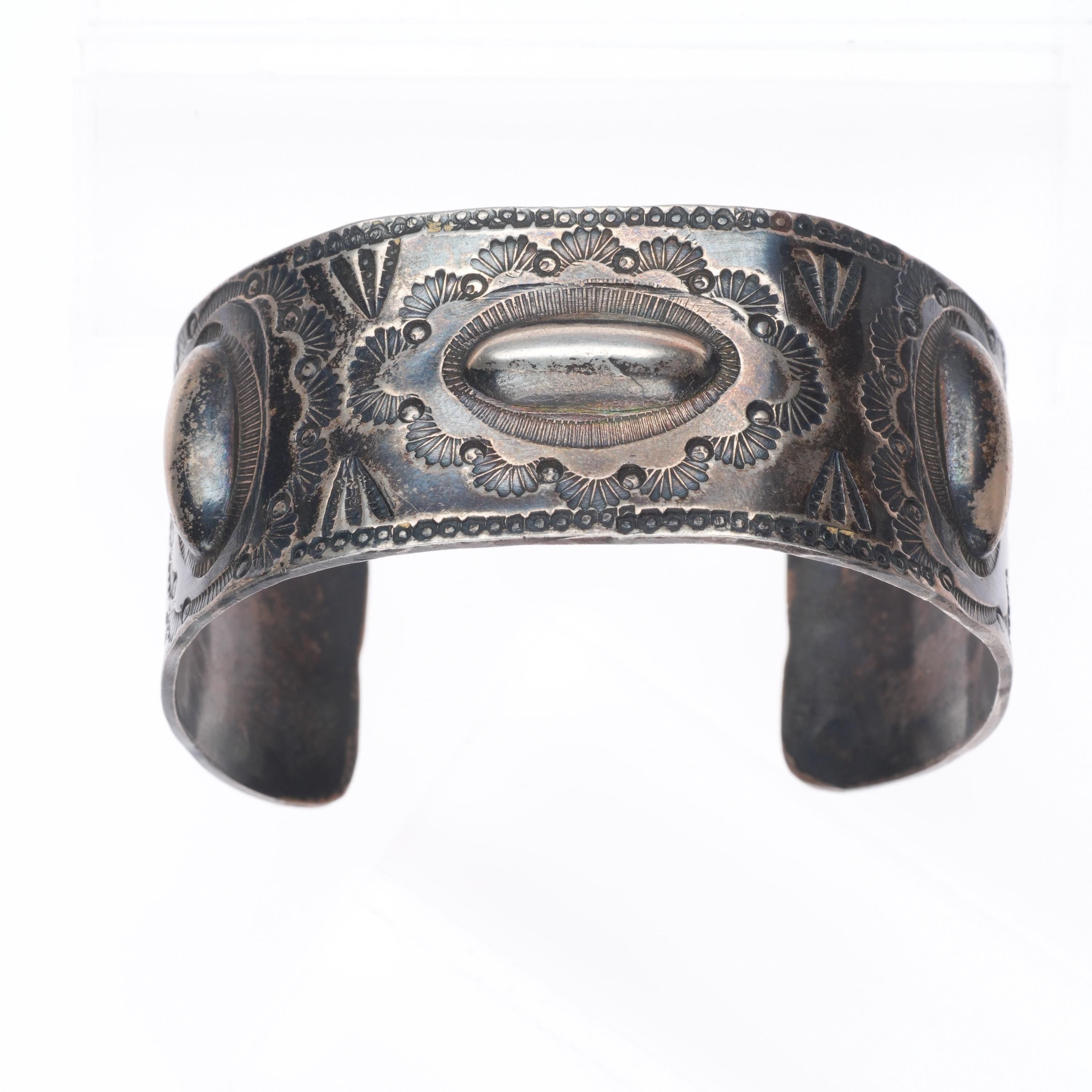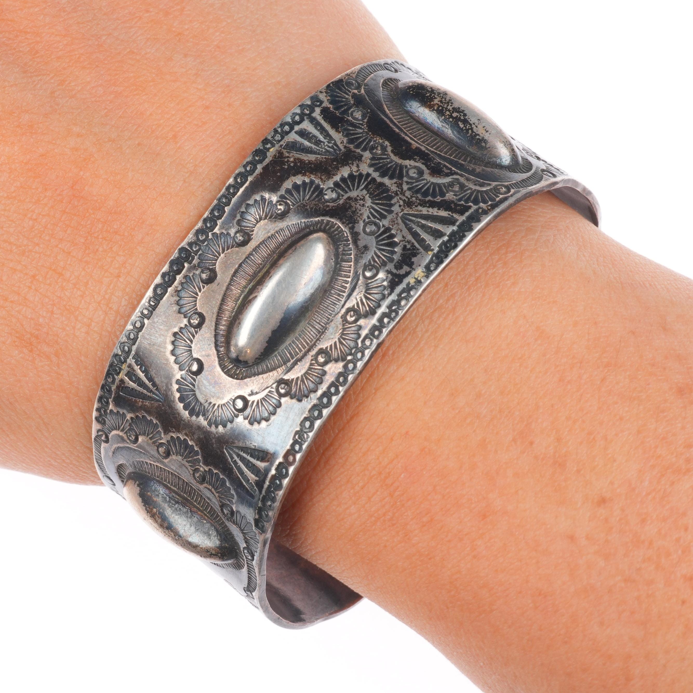 6.6" Vintage Navajo heavy stamped/repousse sterling silver wide cuff bracelet Share WhatsApp Facebook X Pin it Messenger Email Product form $1,200.00 Excl. VAT 1 in stock Quantity Add to cart This item is a recurring or deferred purchase. By continuing, I agree to the cancellation policy and authorize you to charge my payment method at the prices, frequency and dates listed on this page until my order is fulfilled or I cancel, if permitted.