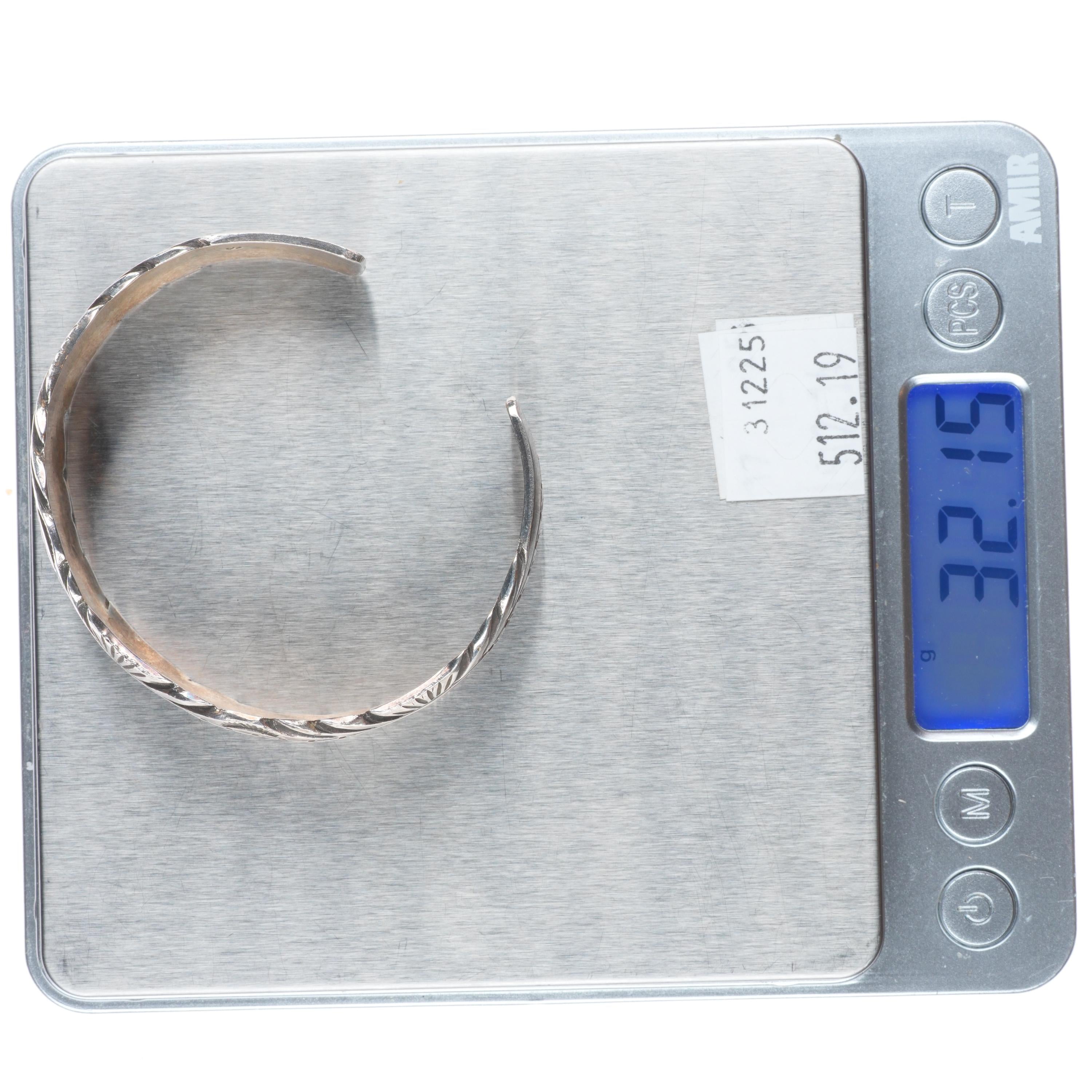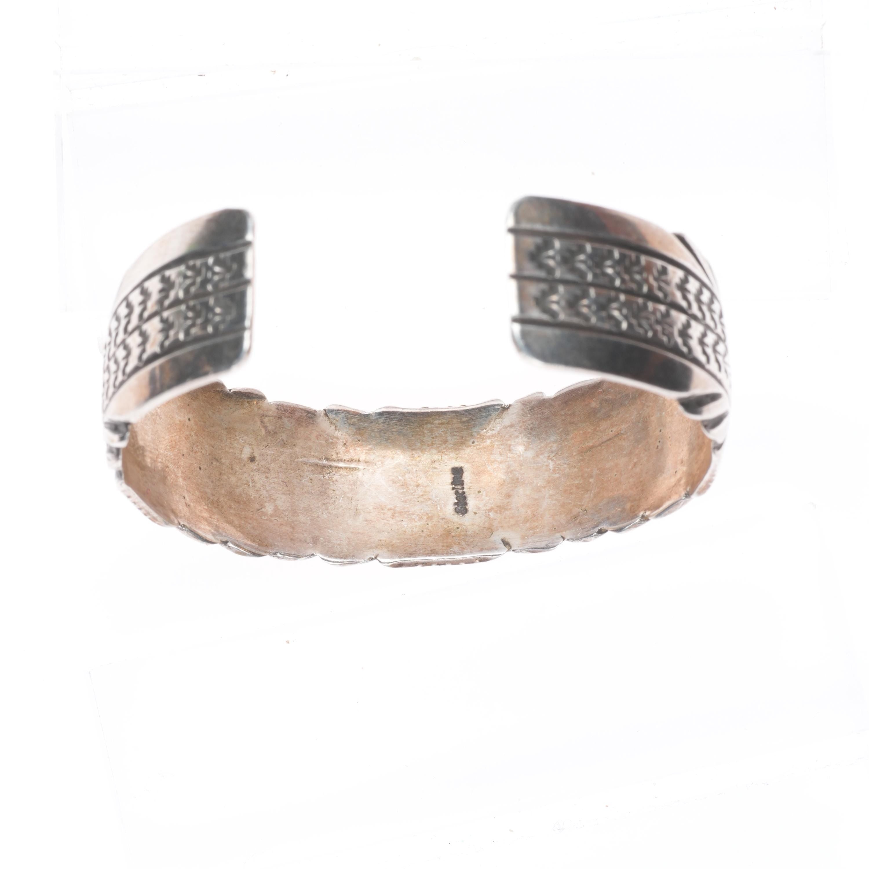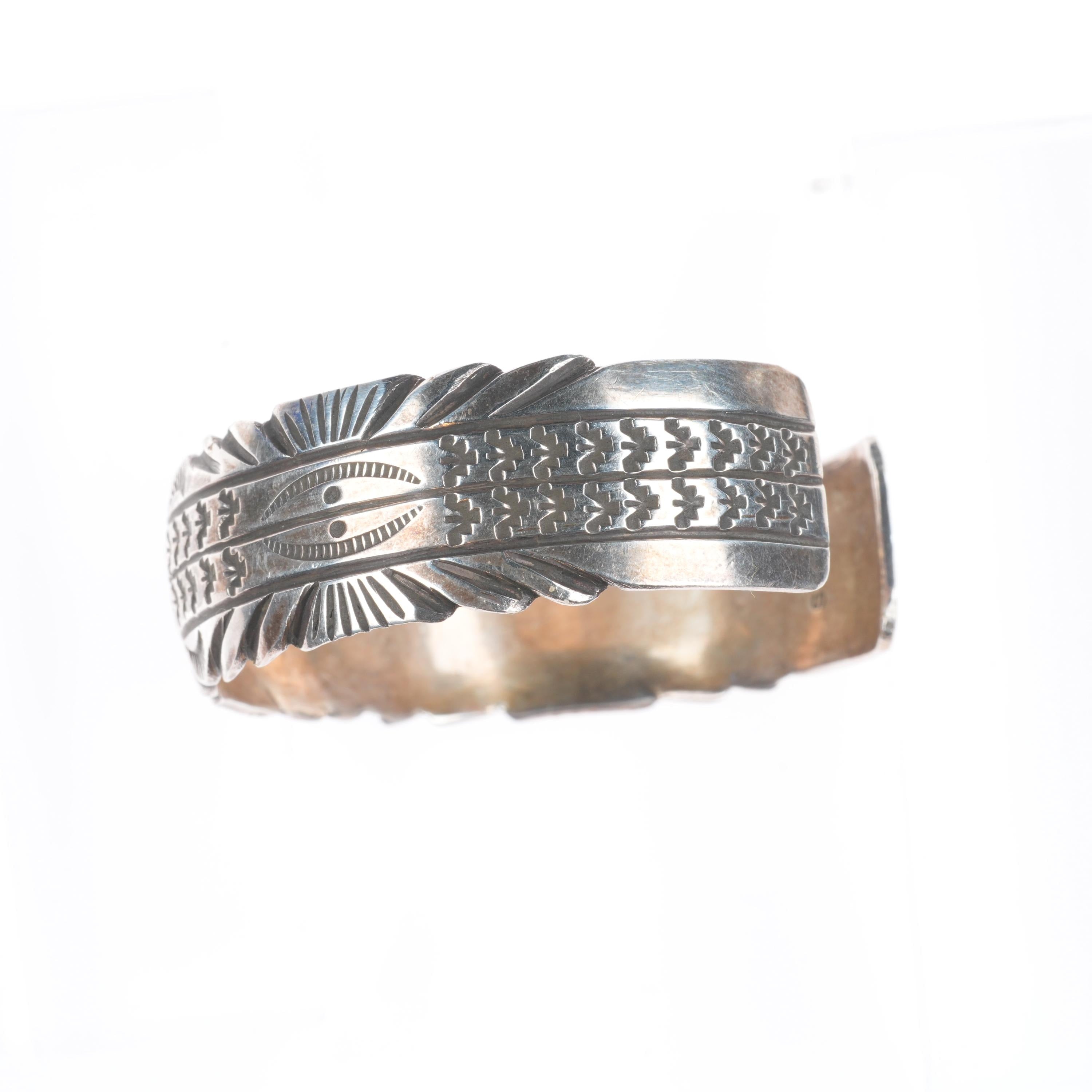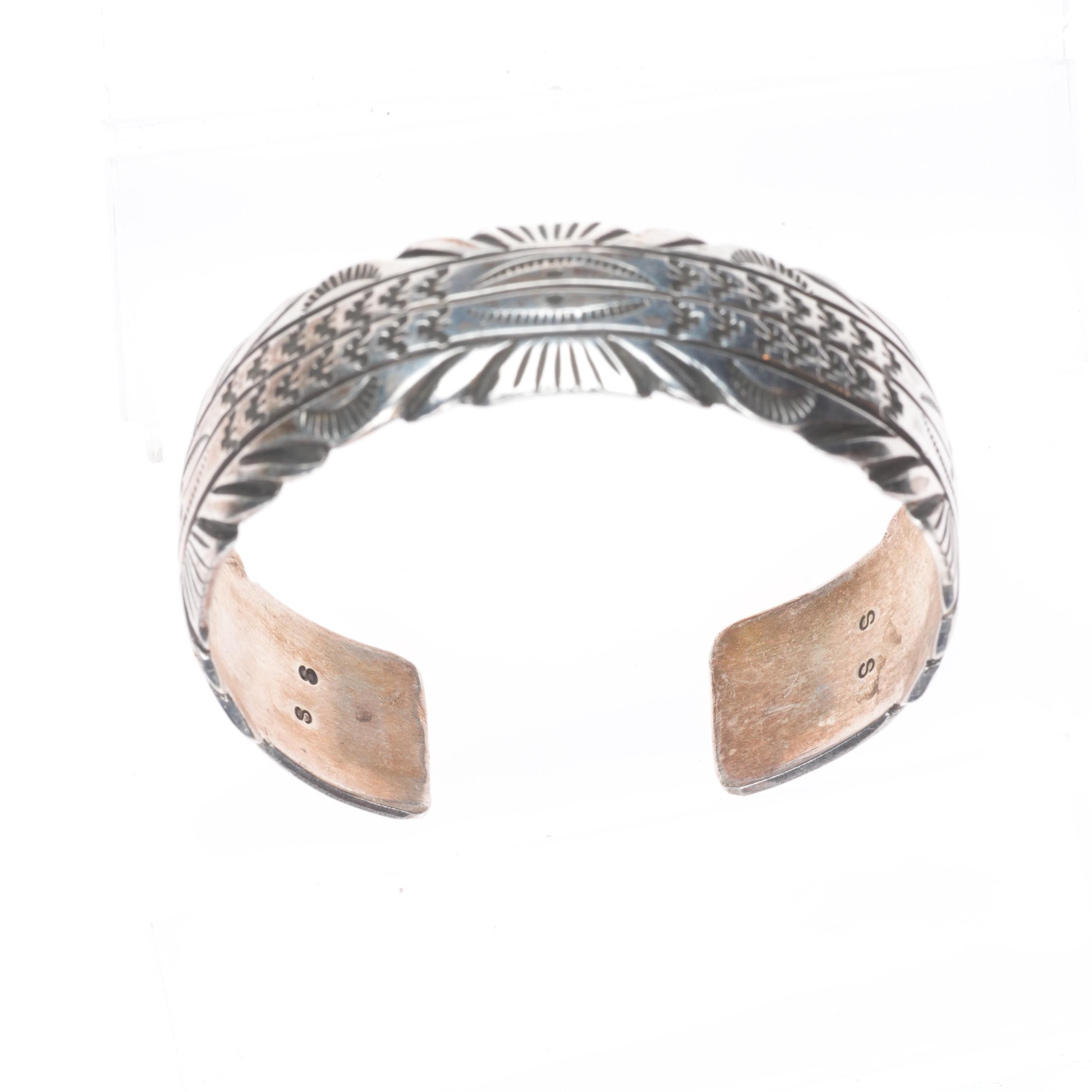 6.6" vintage Navajo sterling silver SS hand stamped cuff bracelet. Tested and guaranteed solid sterling silver with weight and measurements in pictures. Great condition with age appropriate wear, circa last quarter of the 20th century.