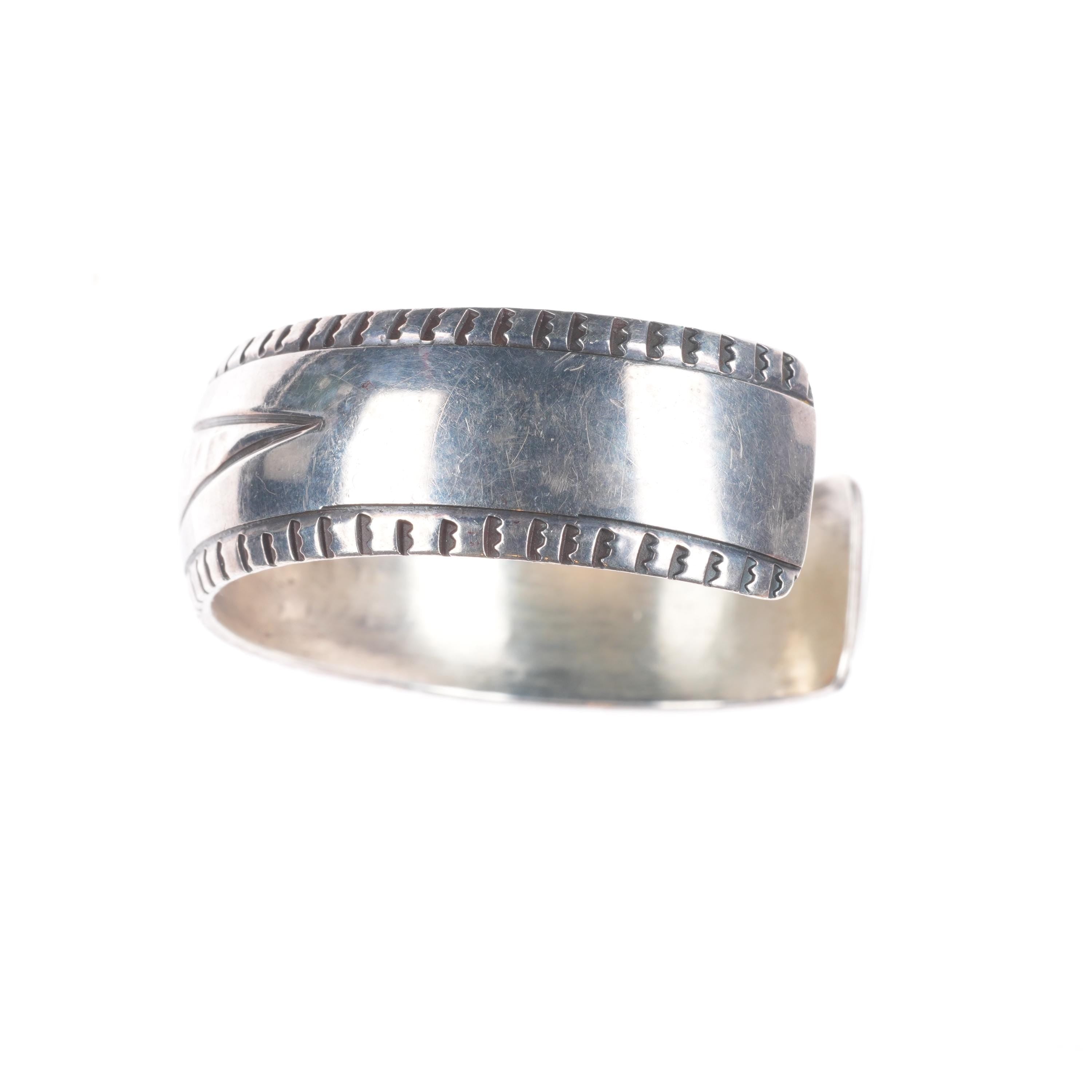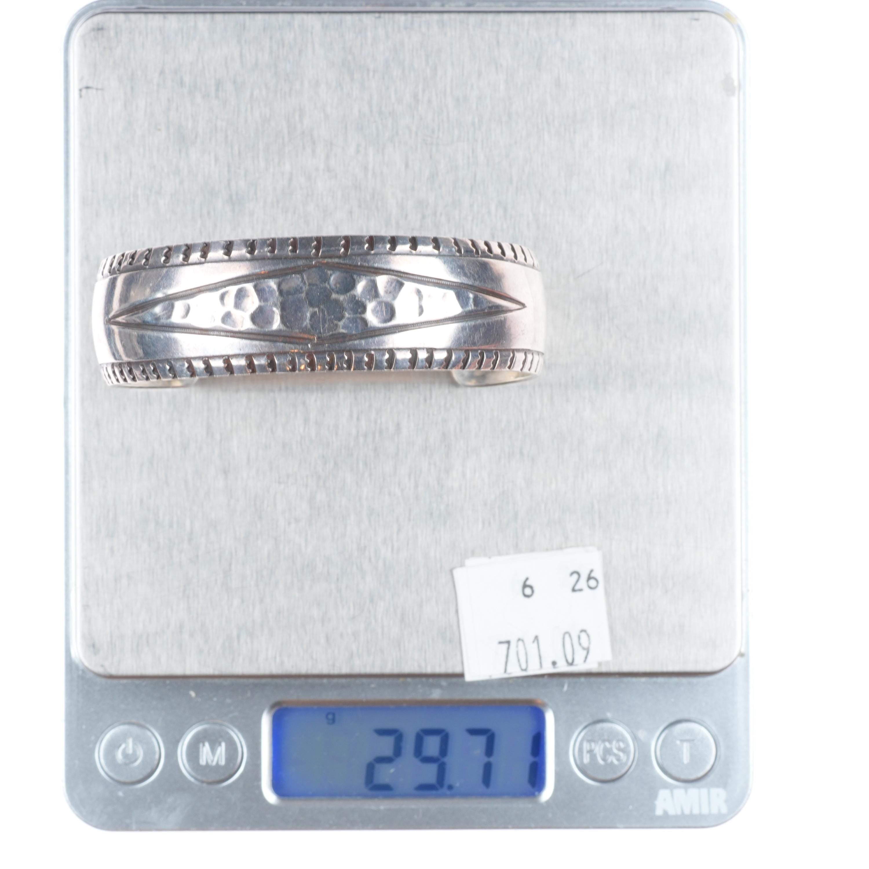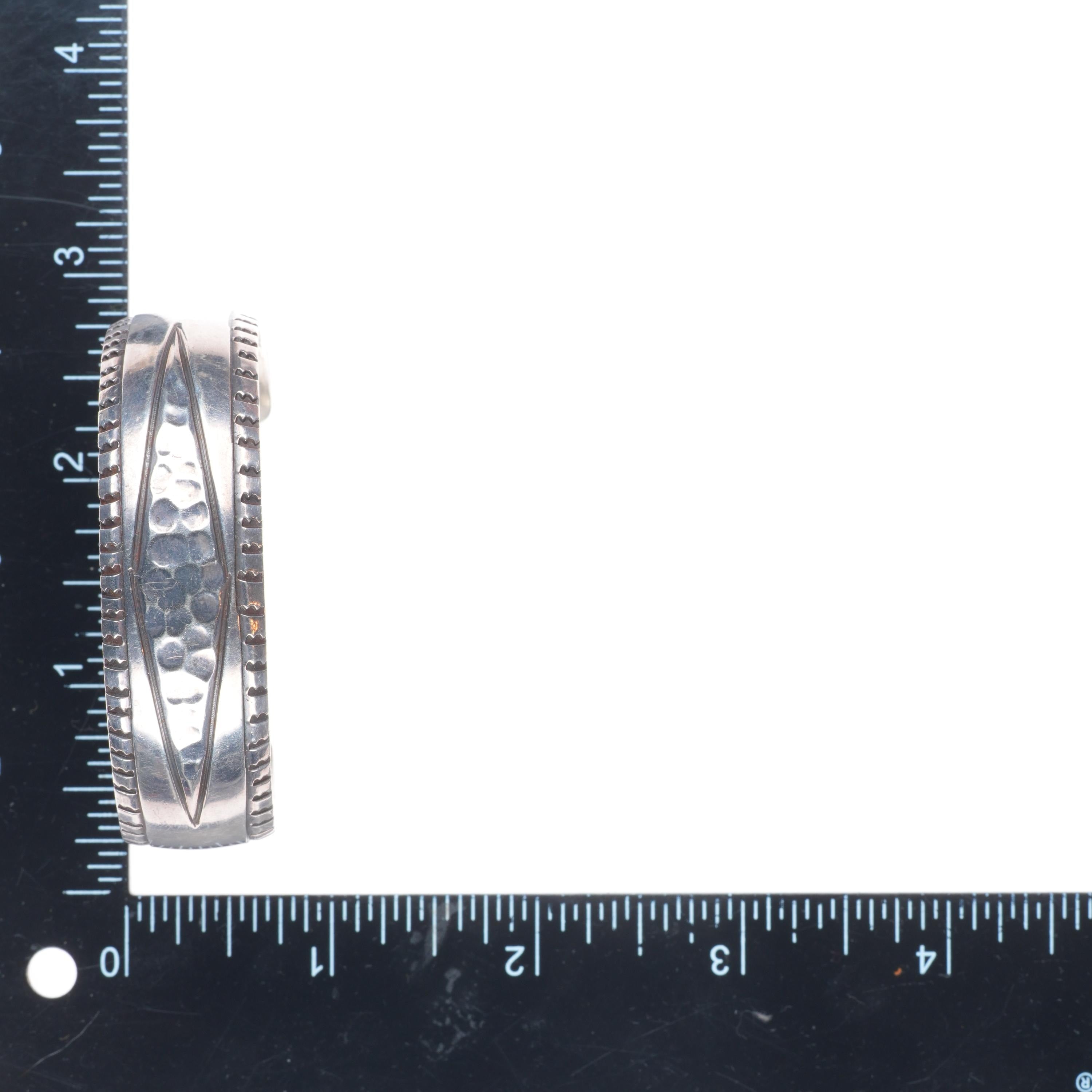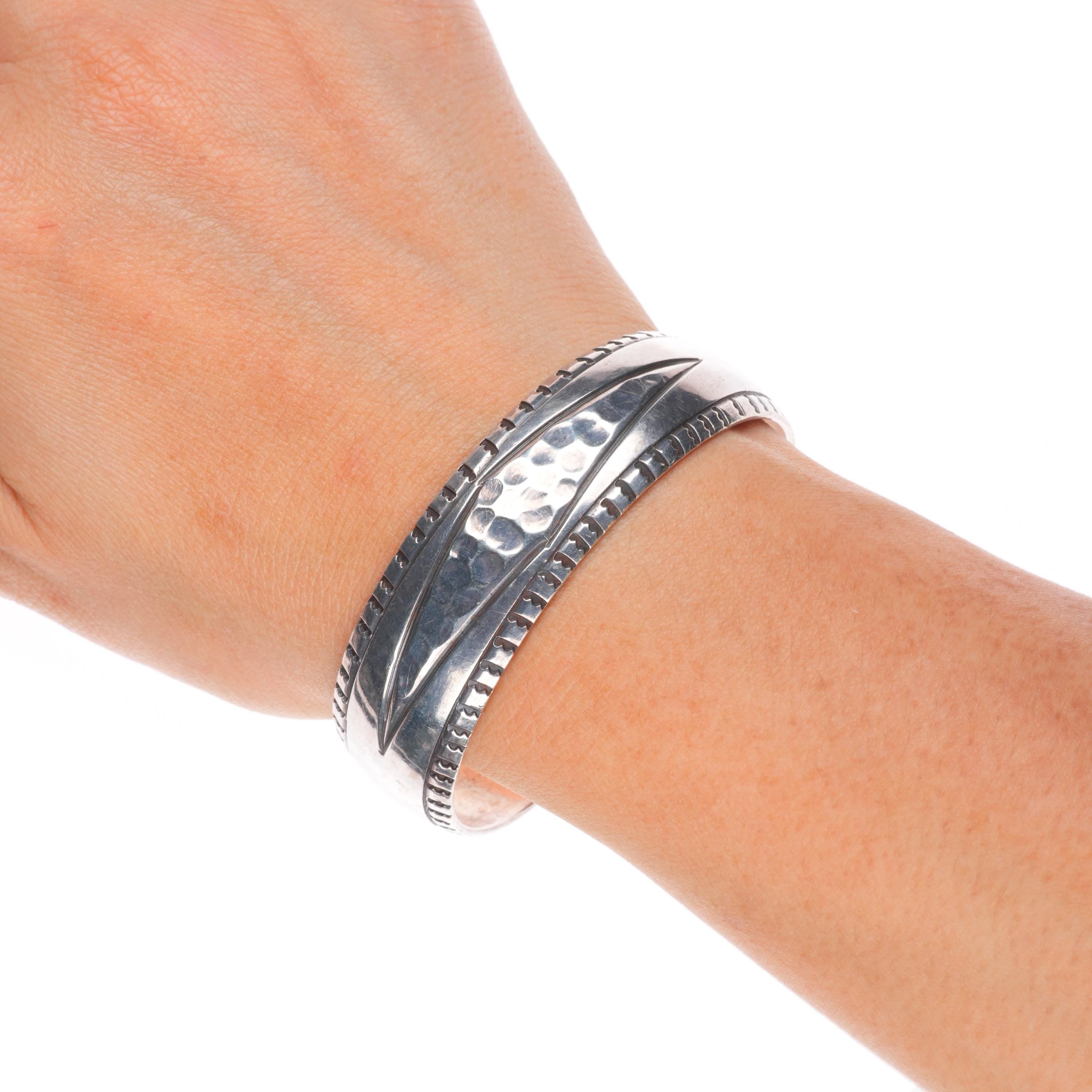 6.7" Vintage Navajo sterling silver hammered/chiseled domed cuff bracelet. Tested and guaranteed solid sterling silver with weight and measurements in pictures. Great condition with age appropriate wear, circa third quarter of the 20th century.