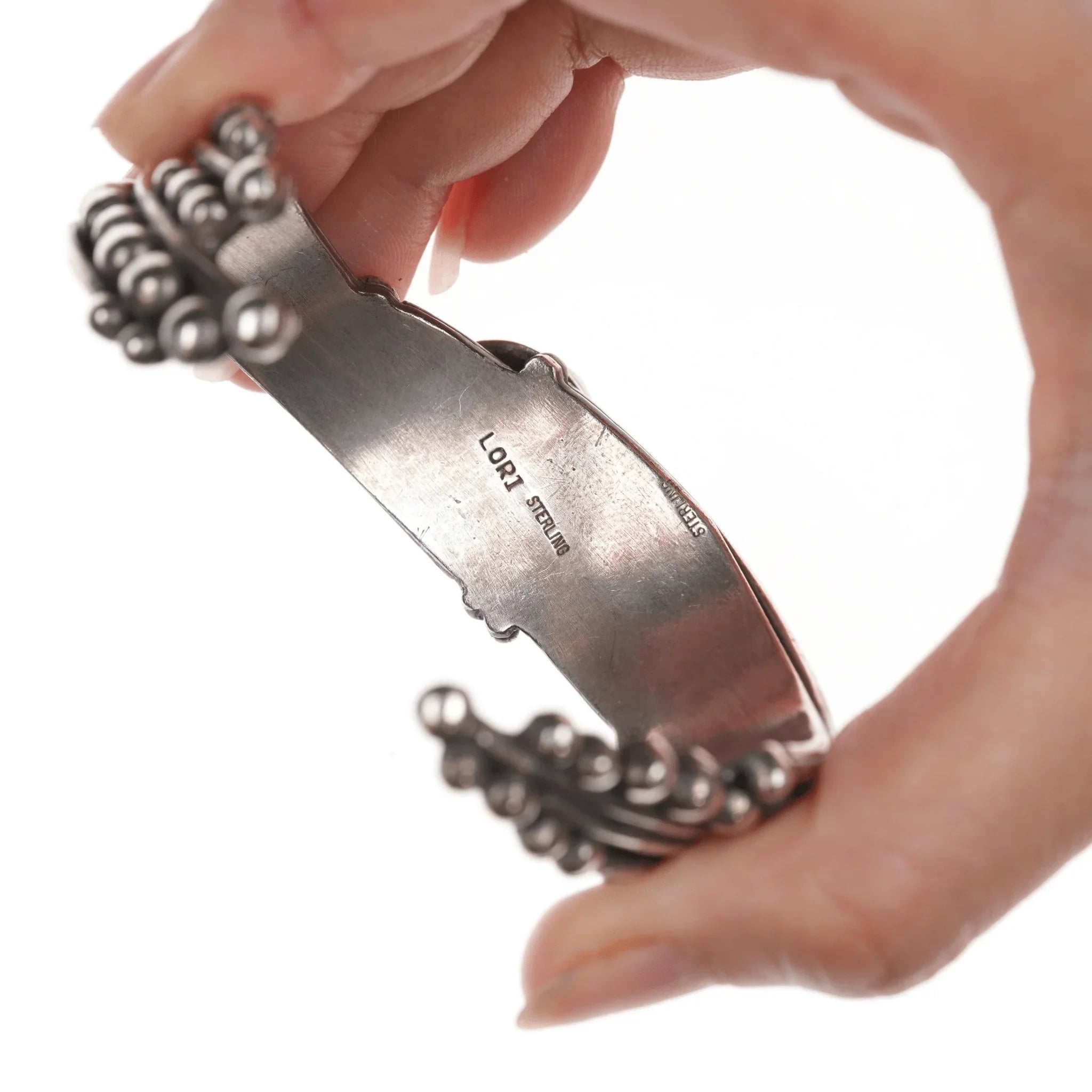 6.75" Lori Carved Turquoise Southwestern modernist sterling cuff bracelet. High quality, handmade, one of a kind, sturdy, carved turquoise. This isn't Lori Bonn, not sure who Lori is or was but she did good work. Hand carved stone like Zuni work.