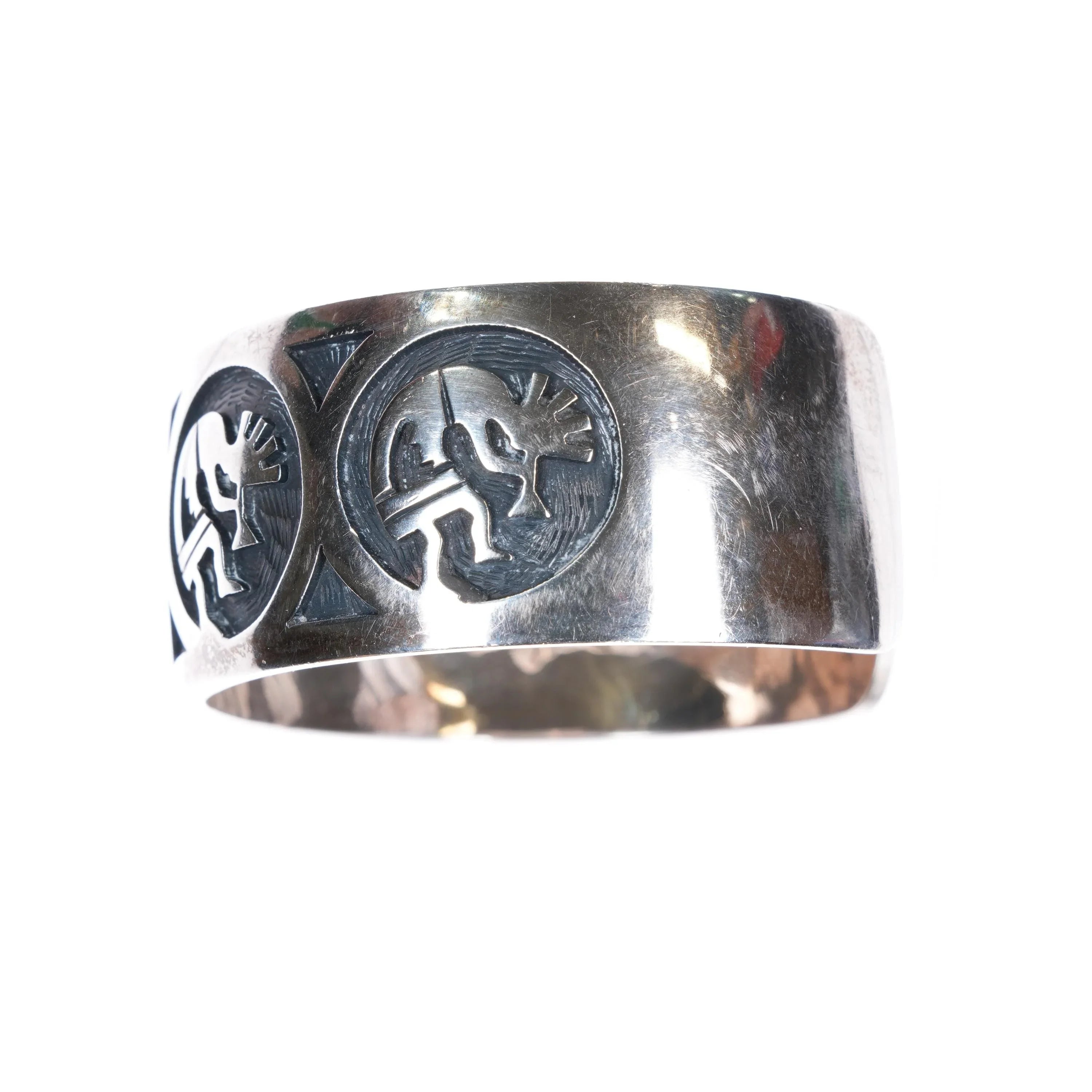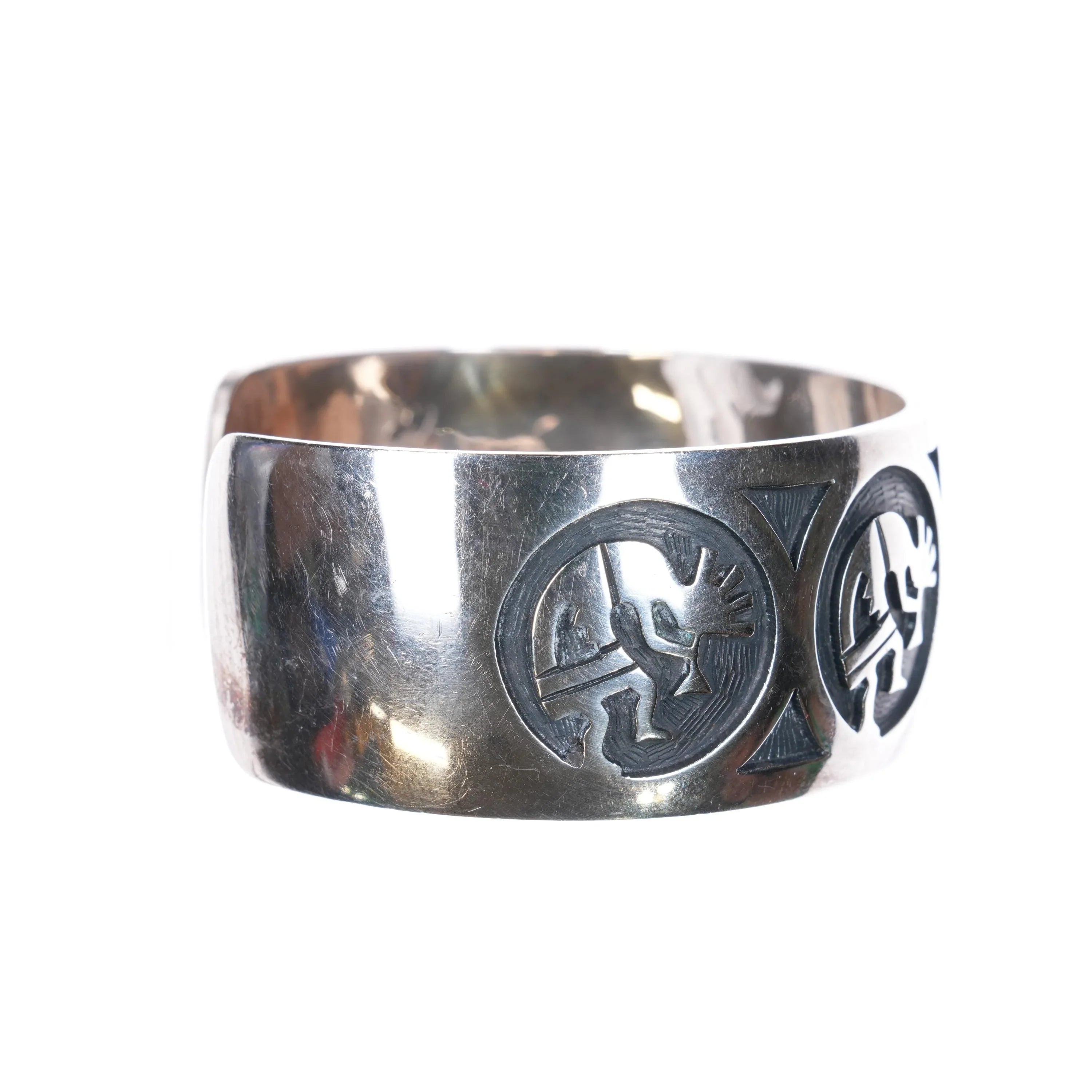 6.75" Mark Tawahongva Hopi Overlay Kokopelli cuff bracelet sterling silver. Tested and guaranteed solid sterling silver with markings shown. Weight and measurements in pictures. Some expected wear, no cracks or breaks. Circa last quarter of the 20th century.