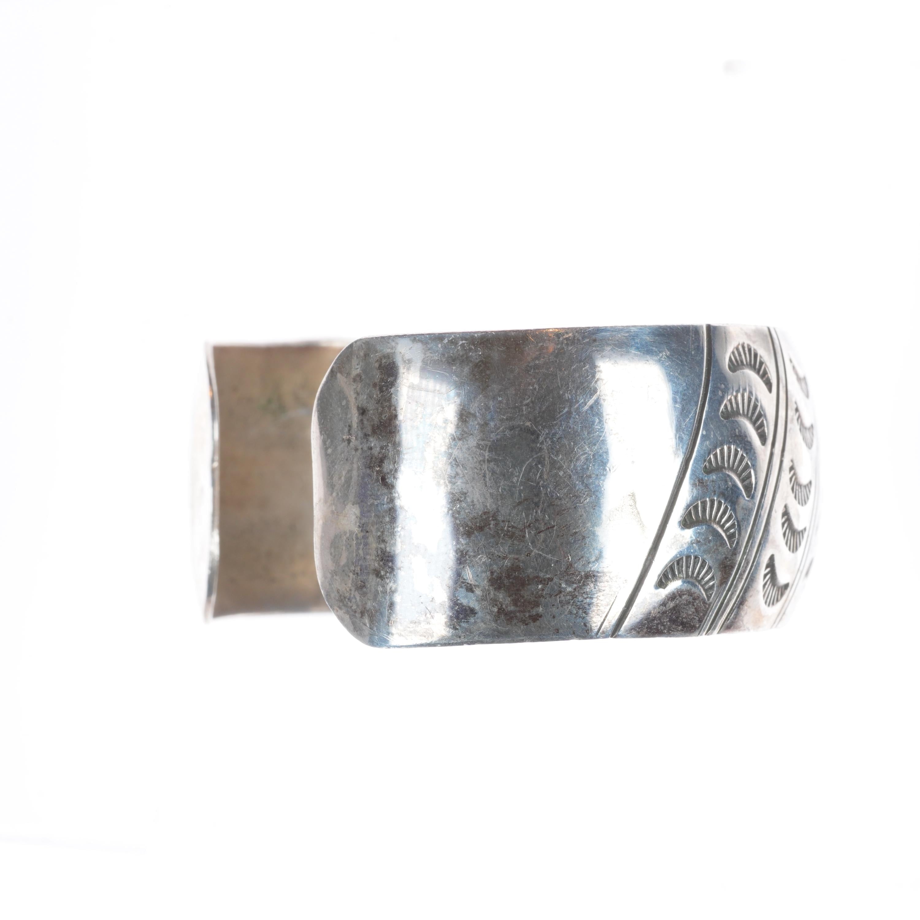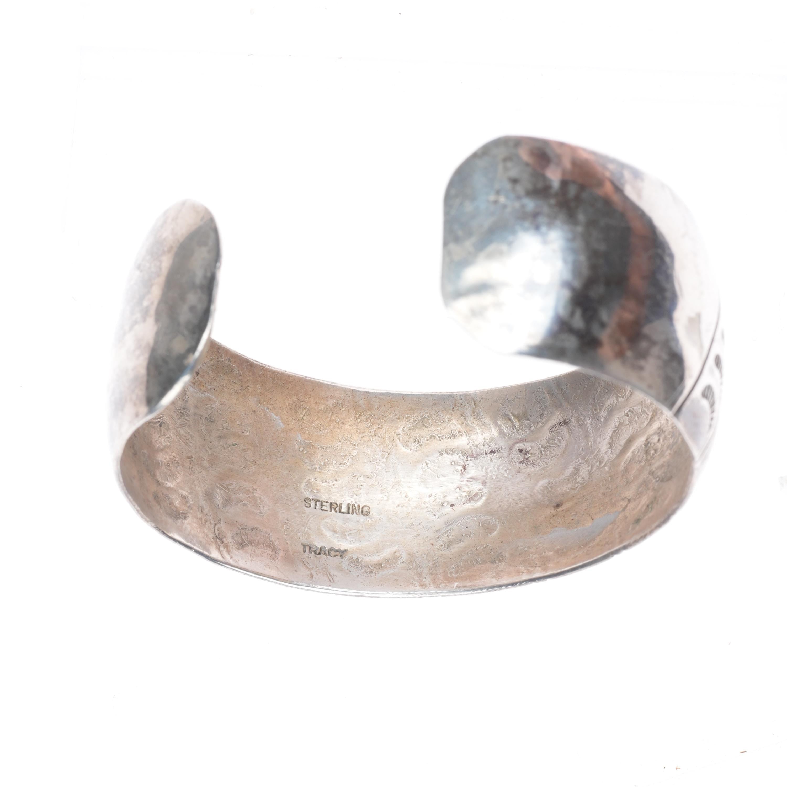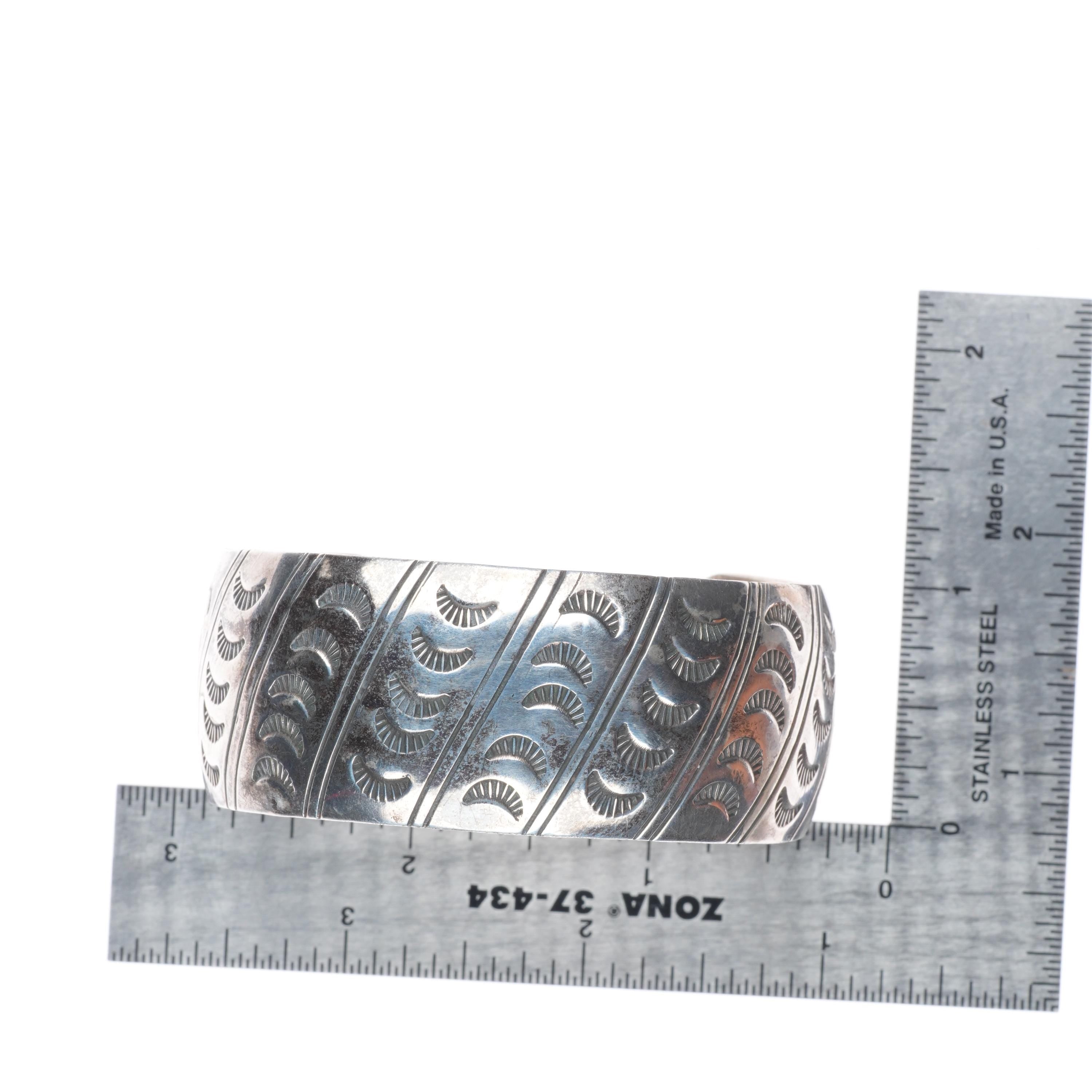 6.75" Tracy Navajo hand stamped domed sterling silver cuff bracelet. Tested and guaranteed solid sterling silver with weight and measurements in pictures. Great condition with age appropriate wear, circa early fourth quarter of the 20th century.