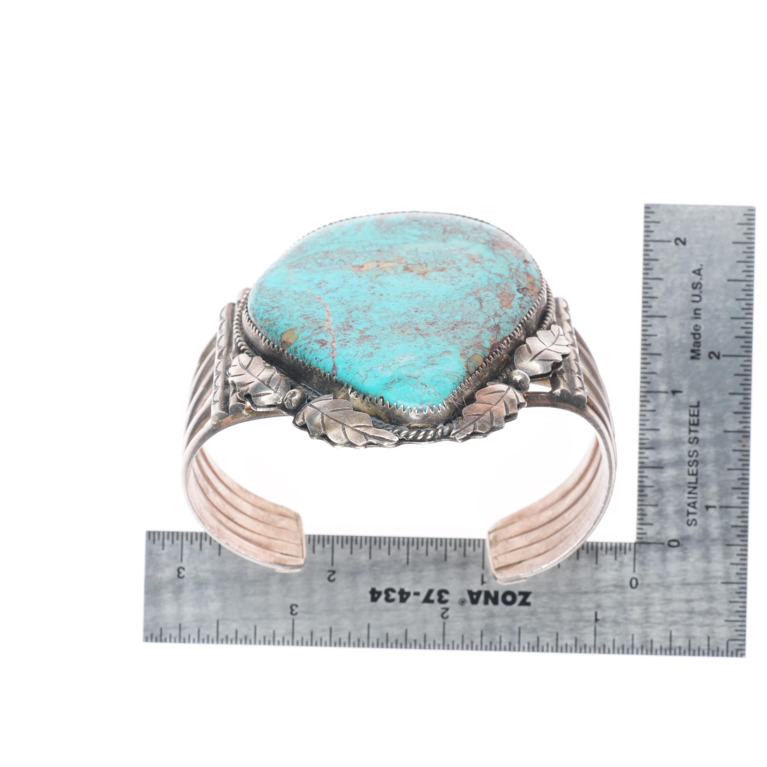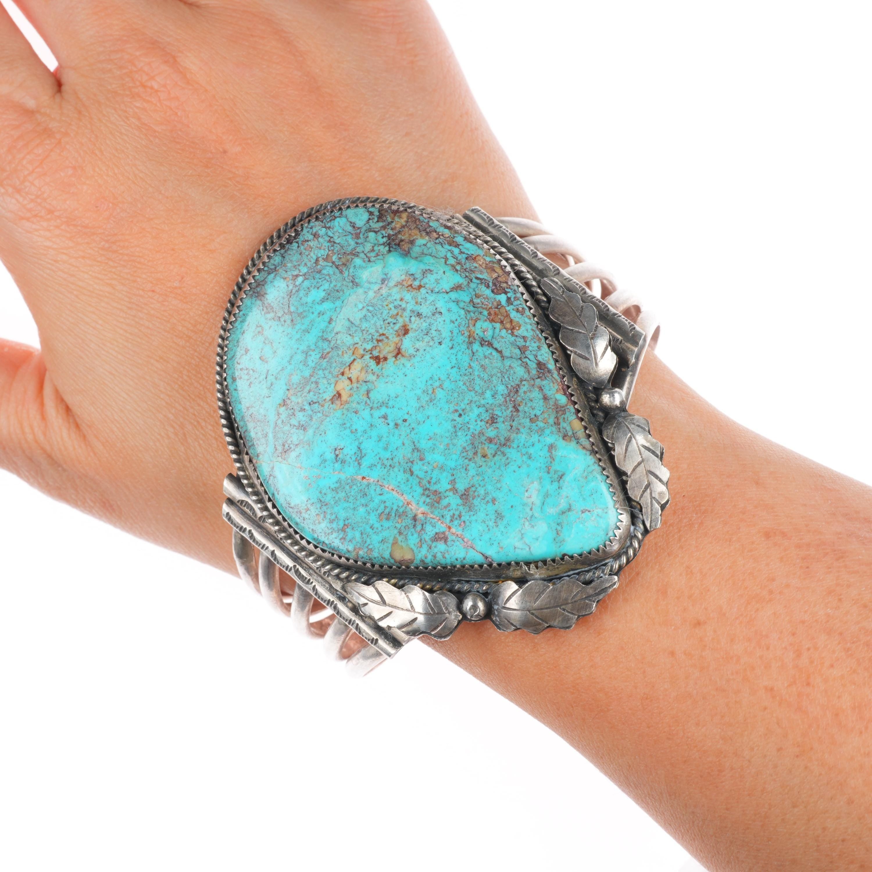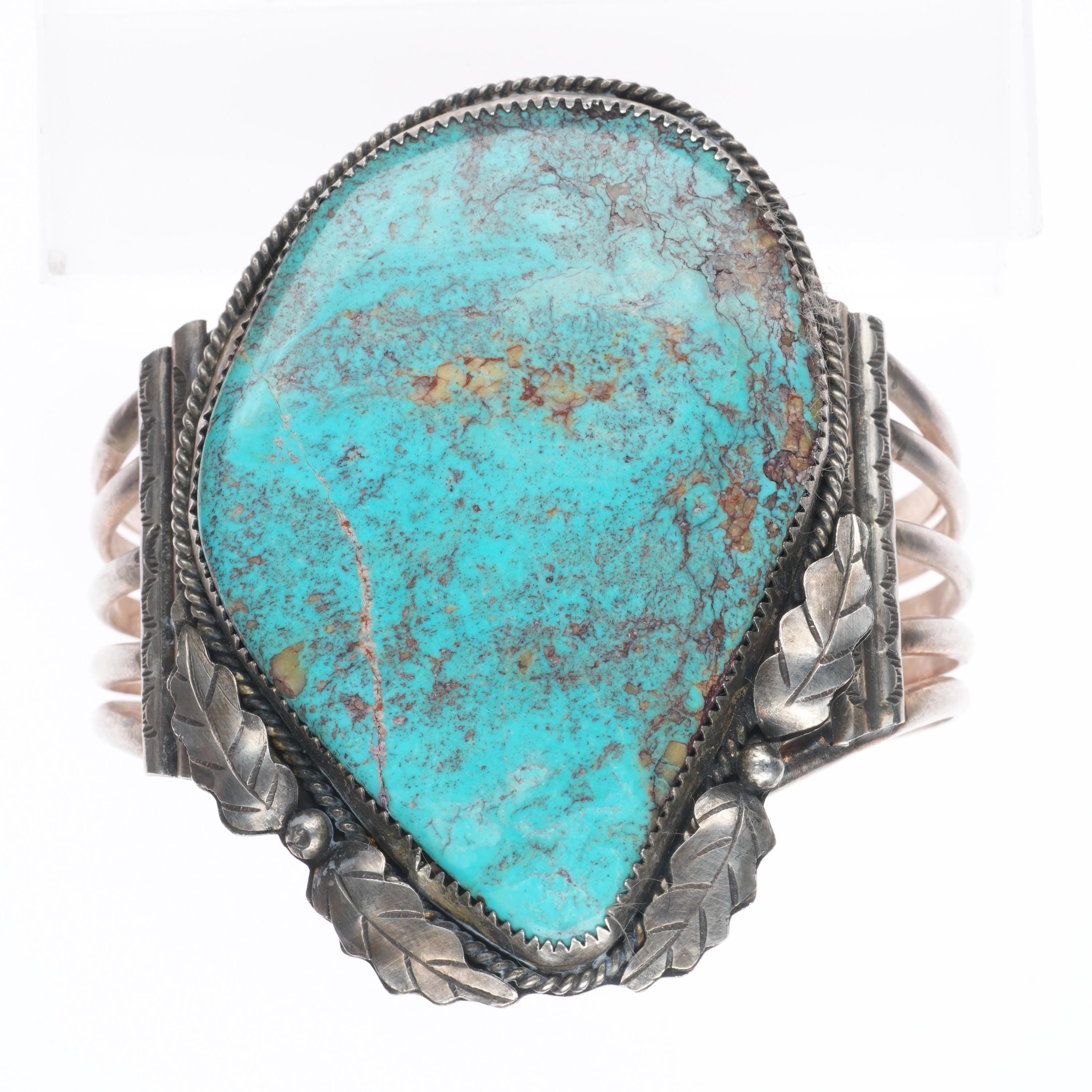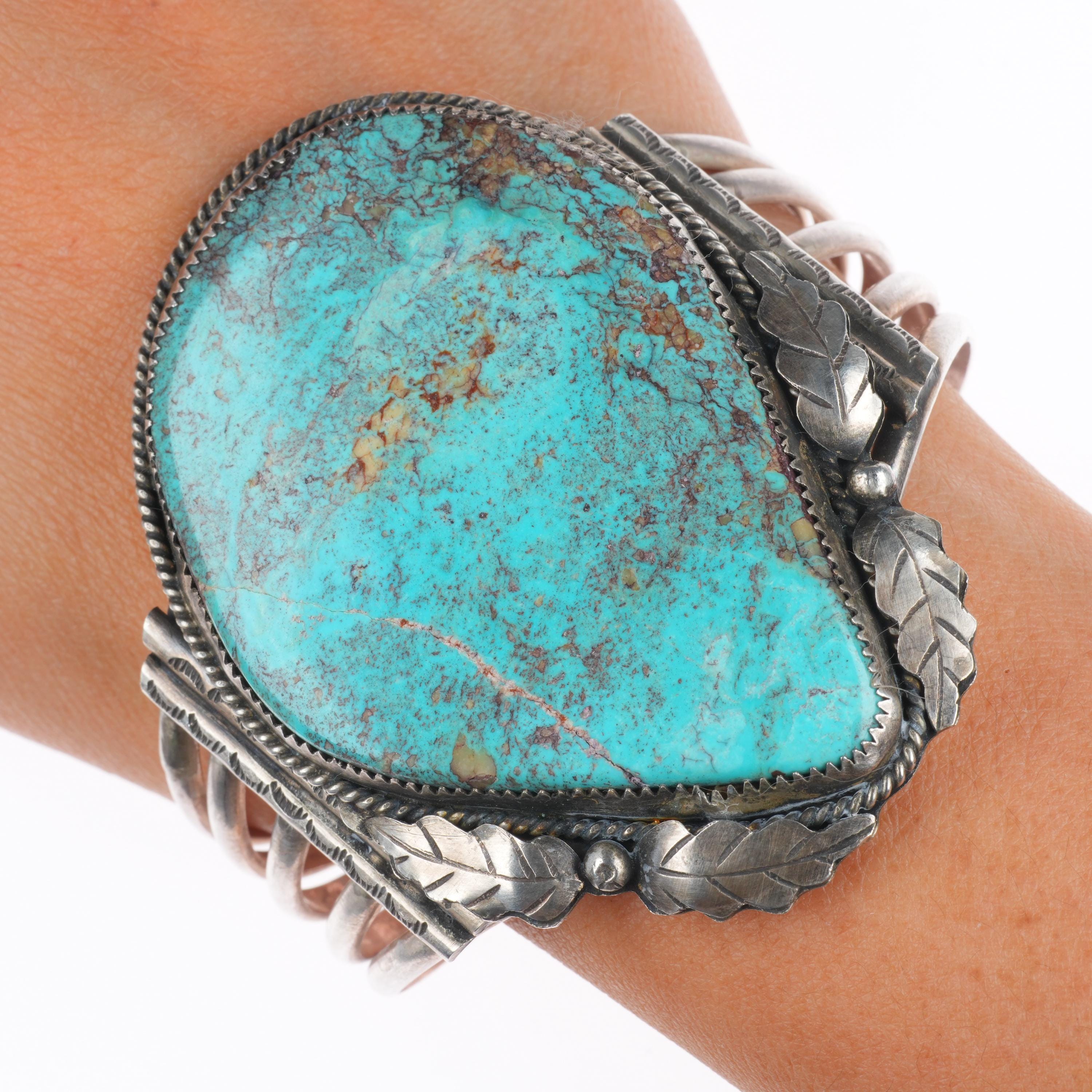 6.75" Wilbur Wauneka Navajo sterling silver vintage cuff bracelet big turquoise. Tested and guaranteed solid sterling silver with weight and measurements in pictures. Great condition with age appropriate wear, circa third quarter of the 20th century. Stamped WW by Gap on one side. Old/secure fracture in stone.