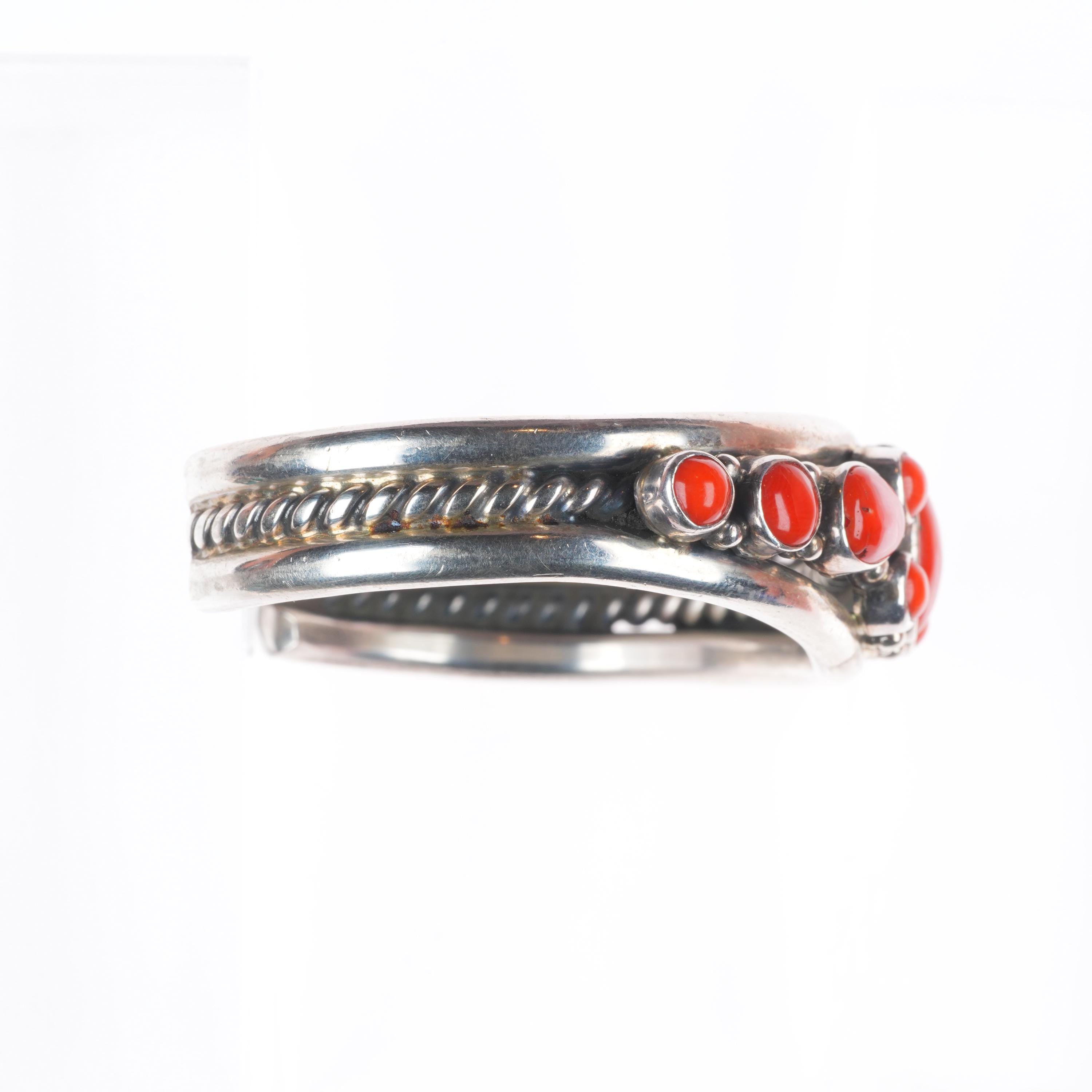 6" Darrin Livingston Navajo sterling silver Mediterranean coral cuff bracelet. Tested and guaranteed solid sterling silver with weight and measurements in pictures. Great condition with age appropriate wear, circa early 21st century..