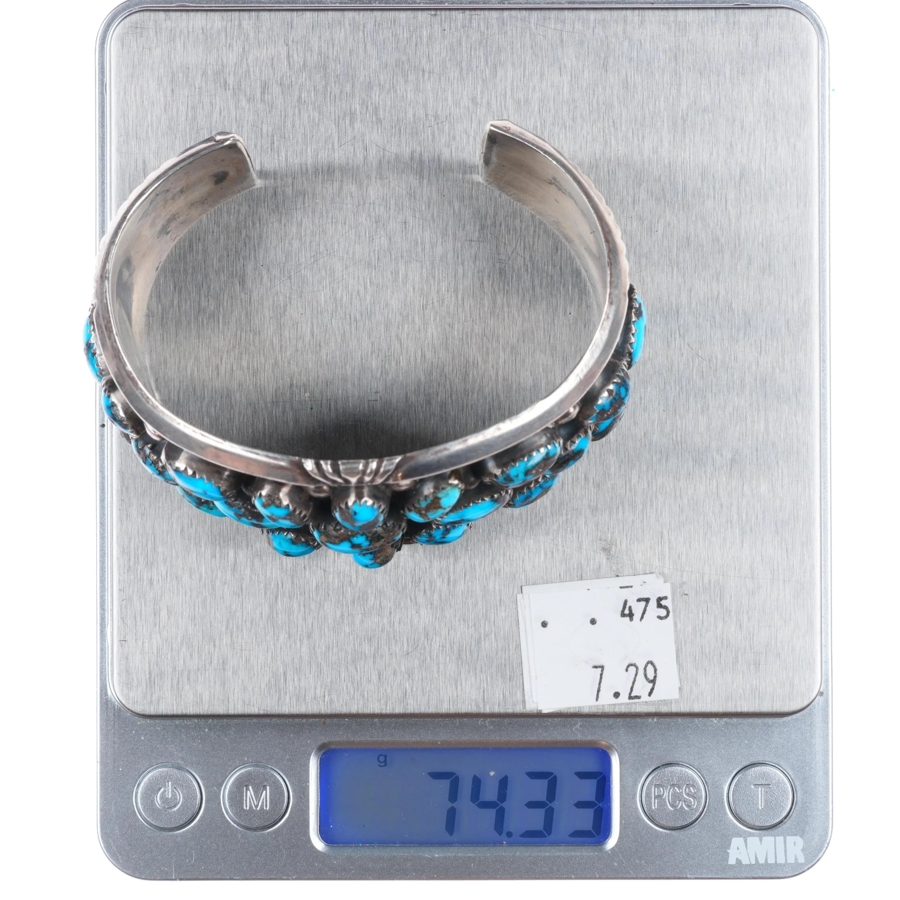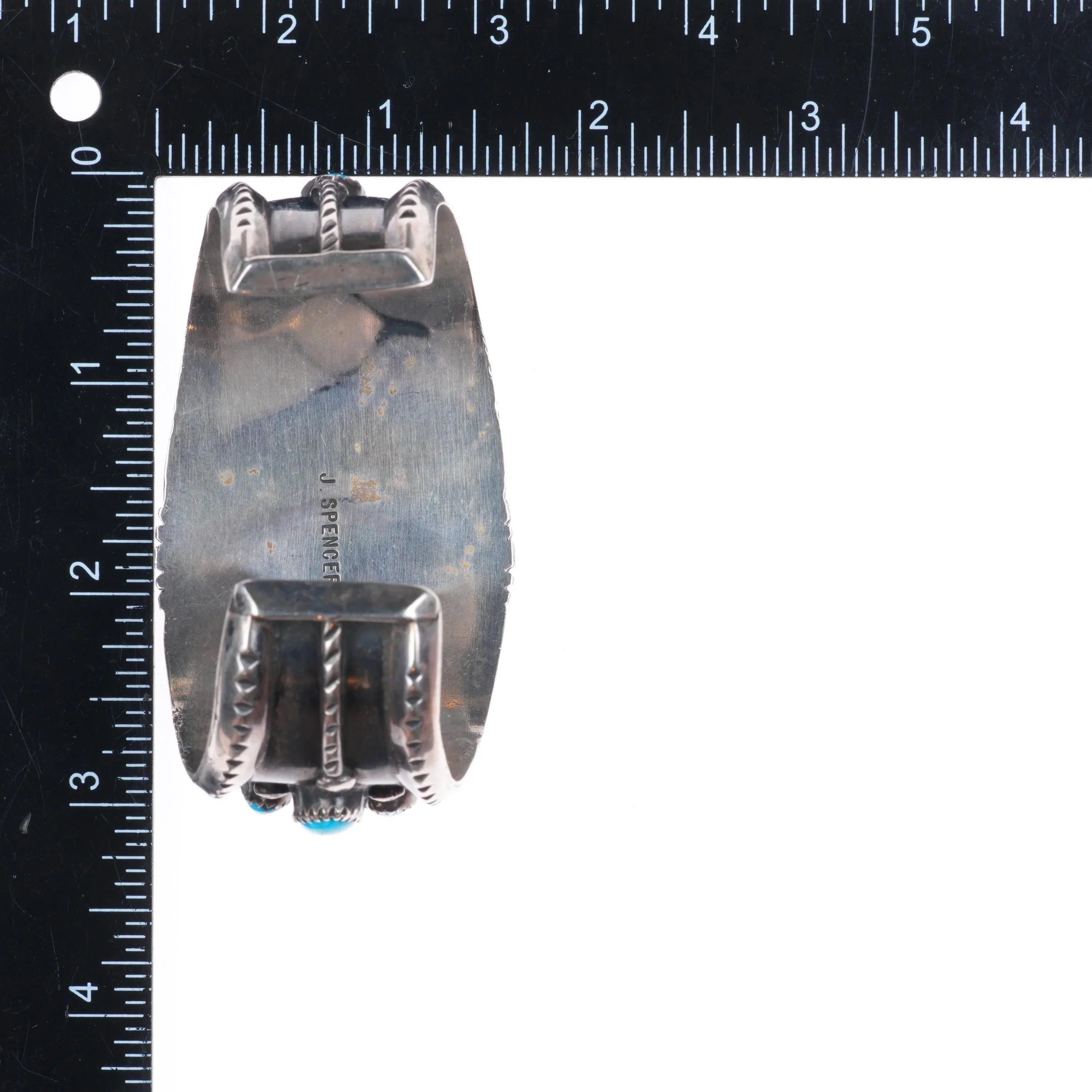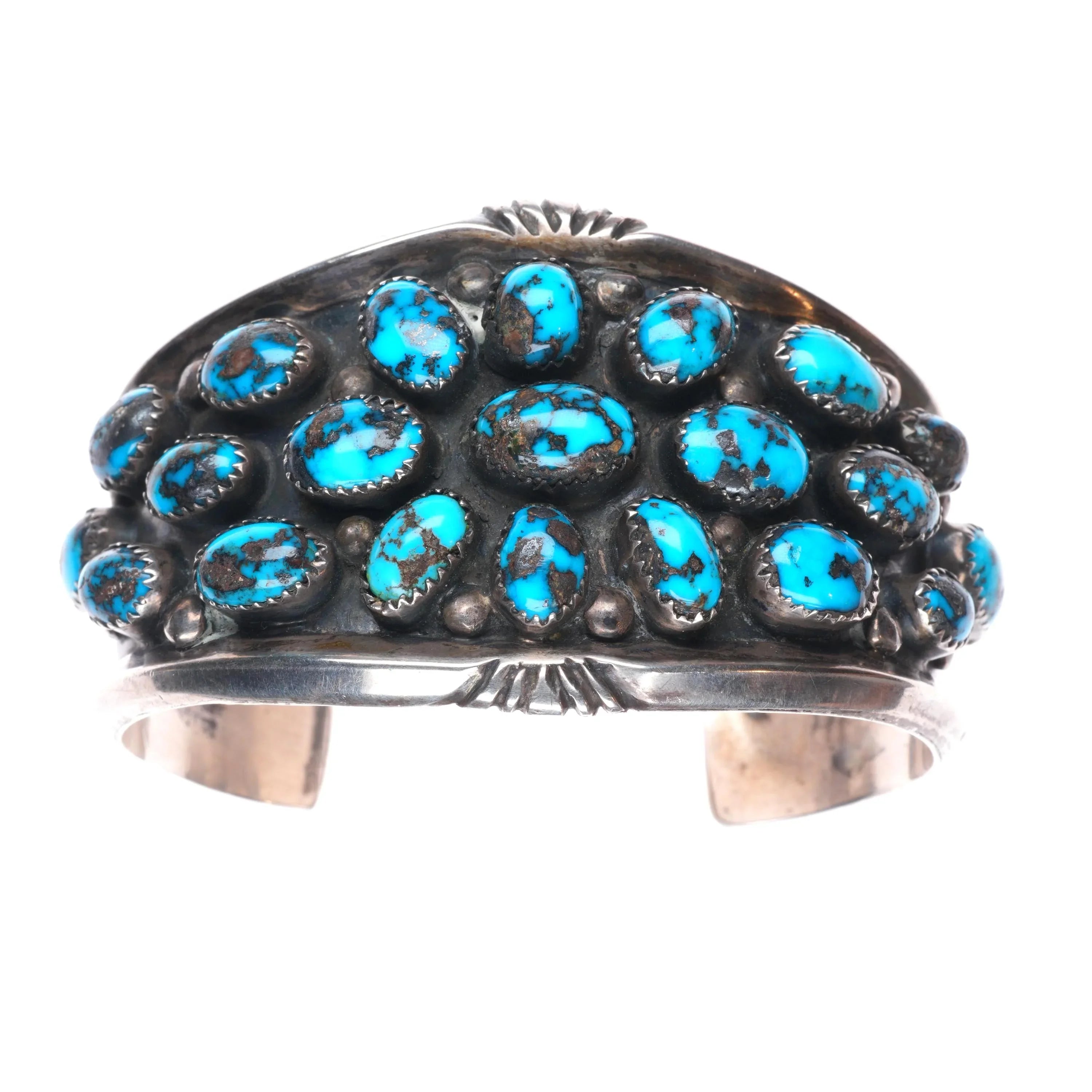 7" 1970‘s J Spencer Navajo Vintage high grade turquoise cluster cuff bracelet. Tested and guaranteed solid sterling silver with weight and measurements in pictures. Circa 70‘s with appropriate wear, No damage. J Spencer worked for Atkinson‘s trading post, did high quality work. These stones are amazing, I cannot commit to which mine they came from. I want to call it Bisbee, just not sure.