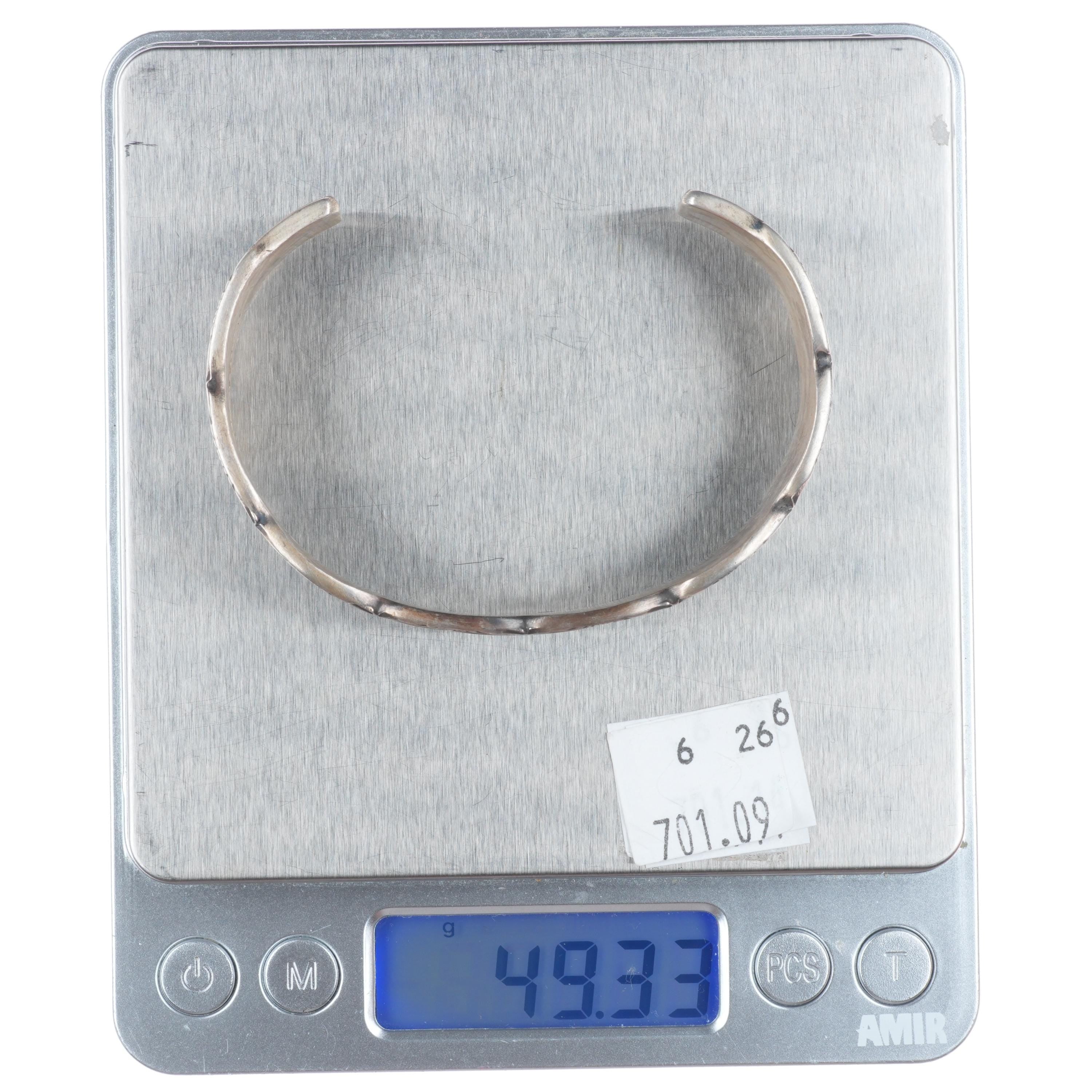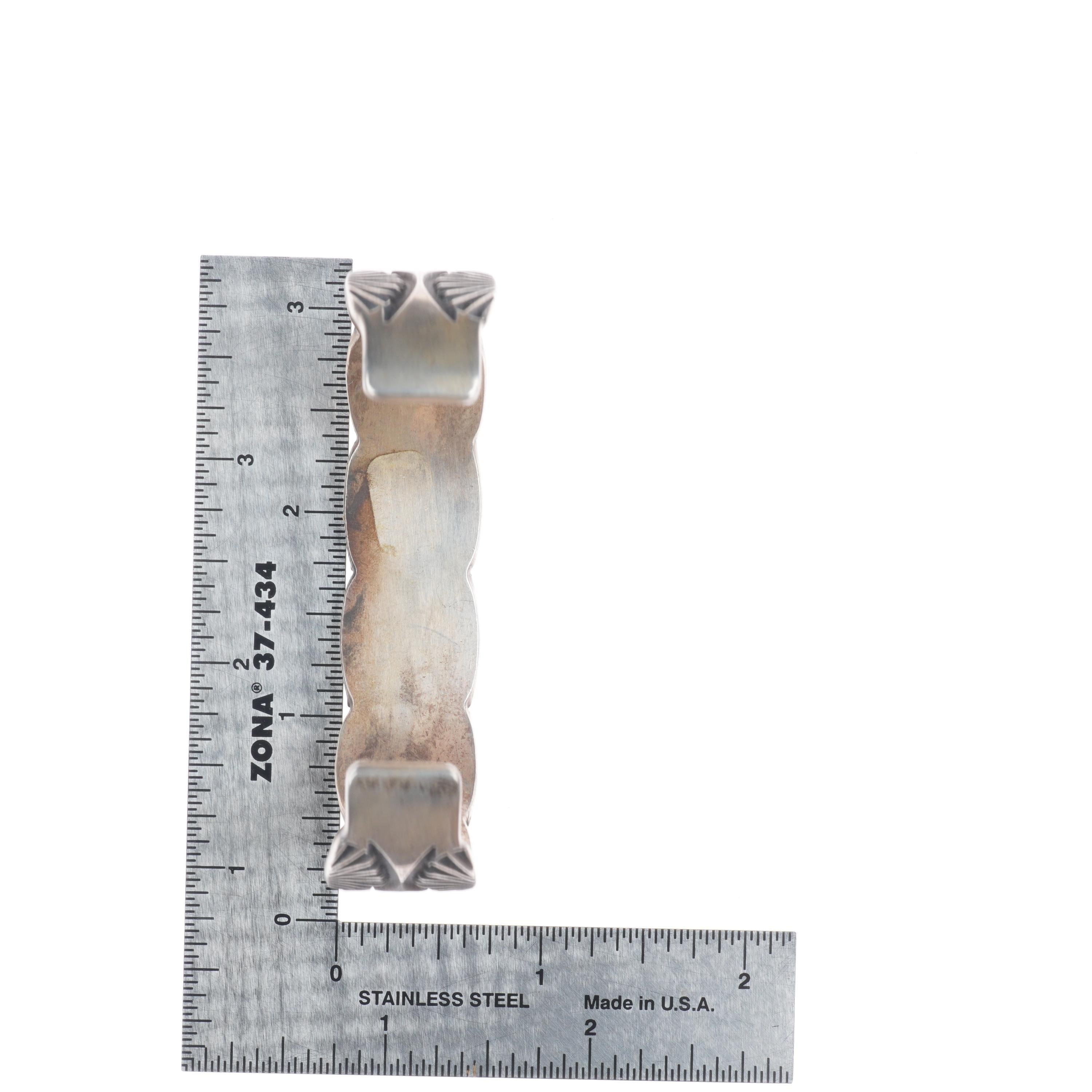 7.25" Emerson Bill Navajo deep stamped sterling silver cuff bracelet. Tested and guaranteed solid sterling silver with weight and measurements in pictures. Great condition with age appropriate wear, circa last quarter of the 20th century.