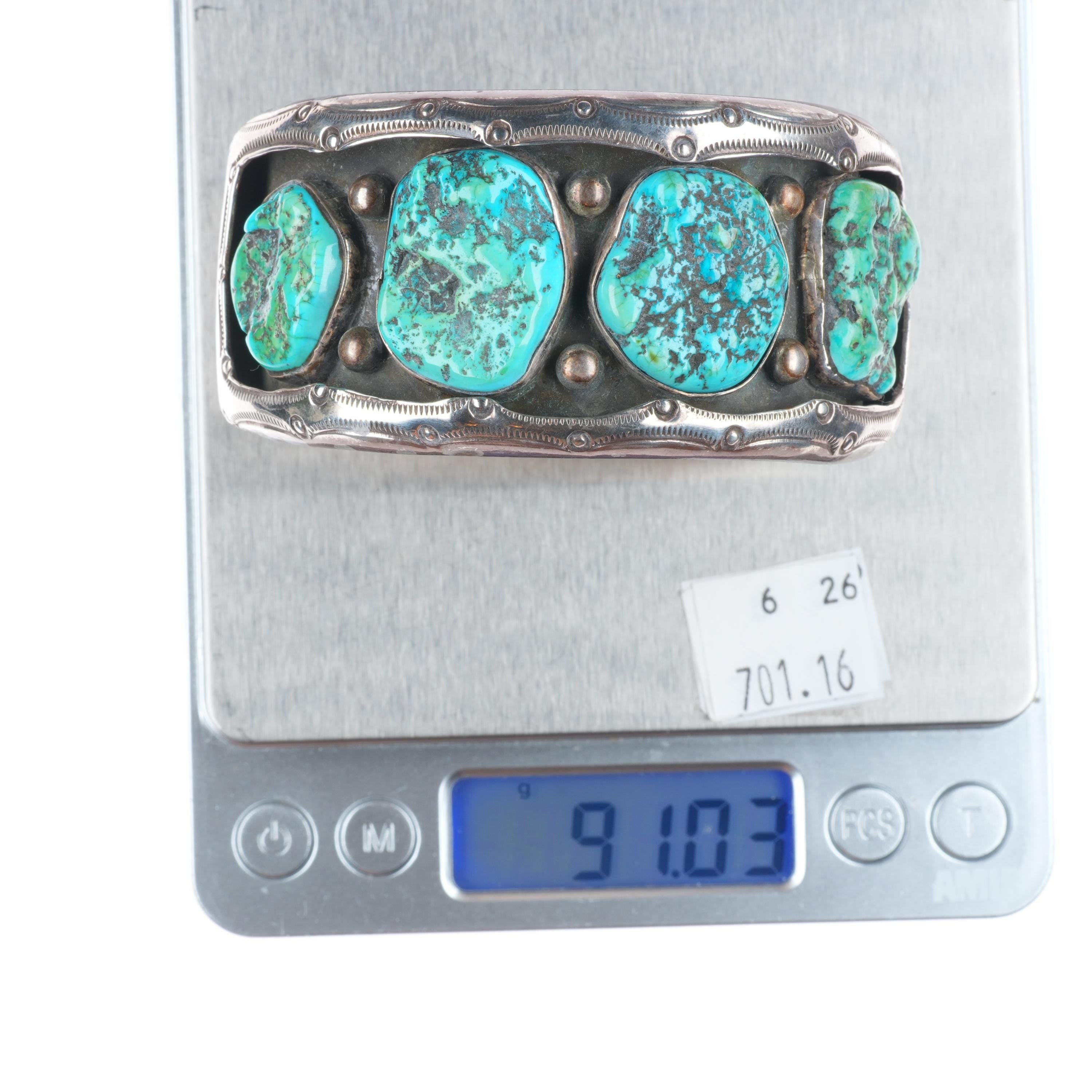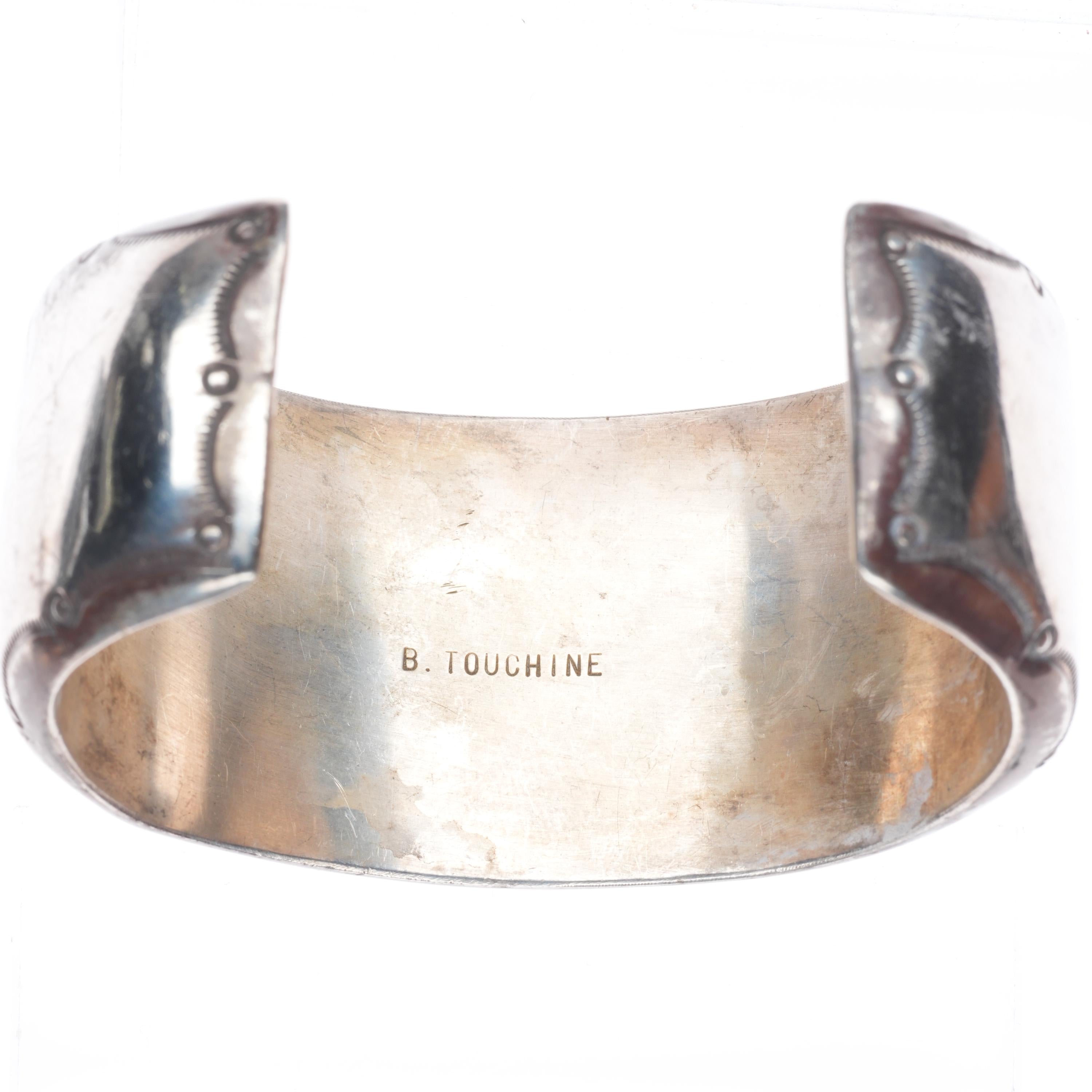 7.3" Ben Touchine Navajo wide sterling silver shadowbox turquoise cuff bracelet. Tested and guaranteed solid sterling silver with weight and measurements in pictures. Great condition with age appropriate wear, circa third quarter of the 20th century.