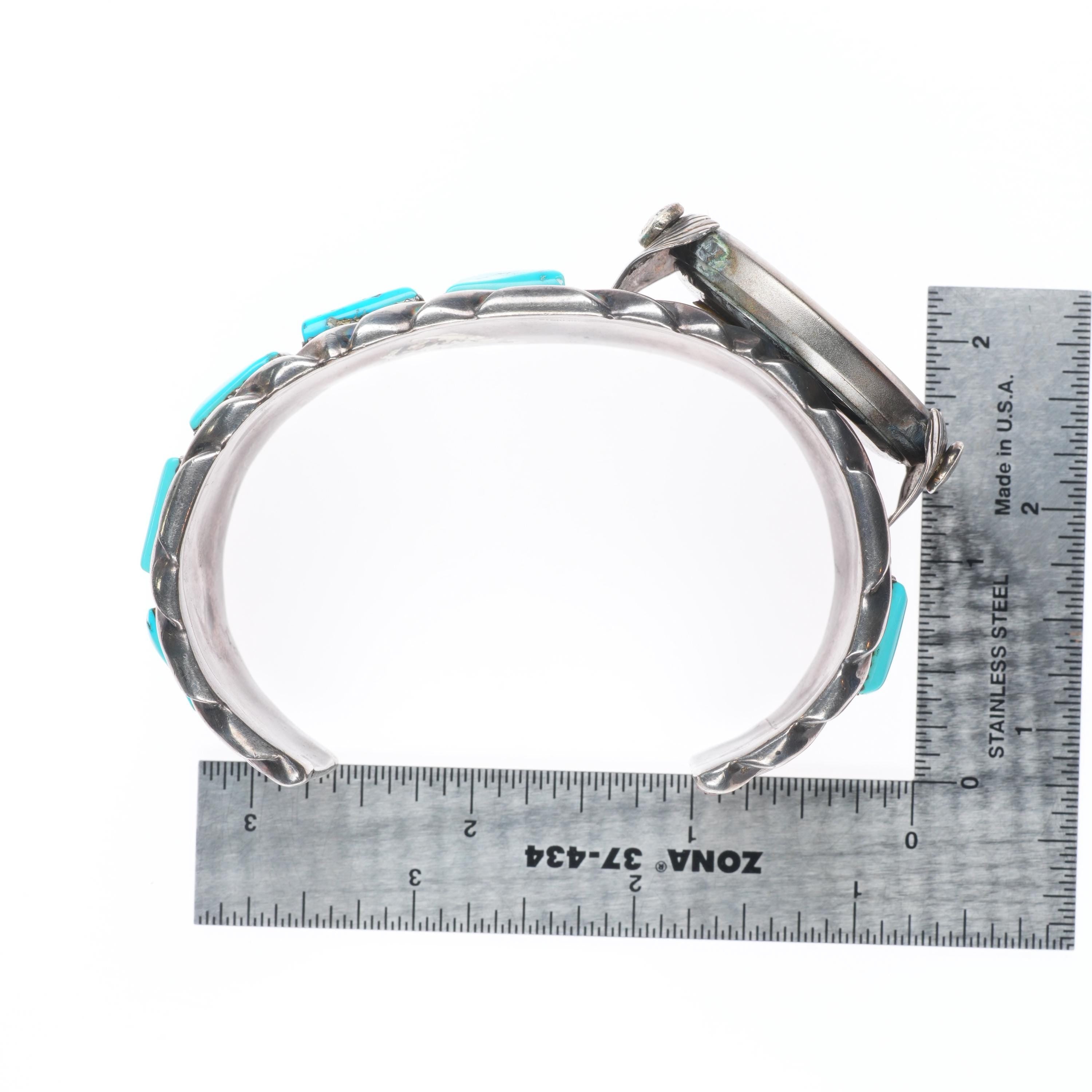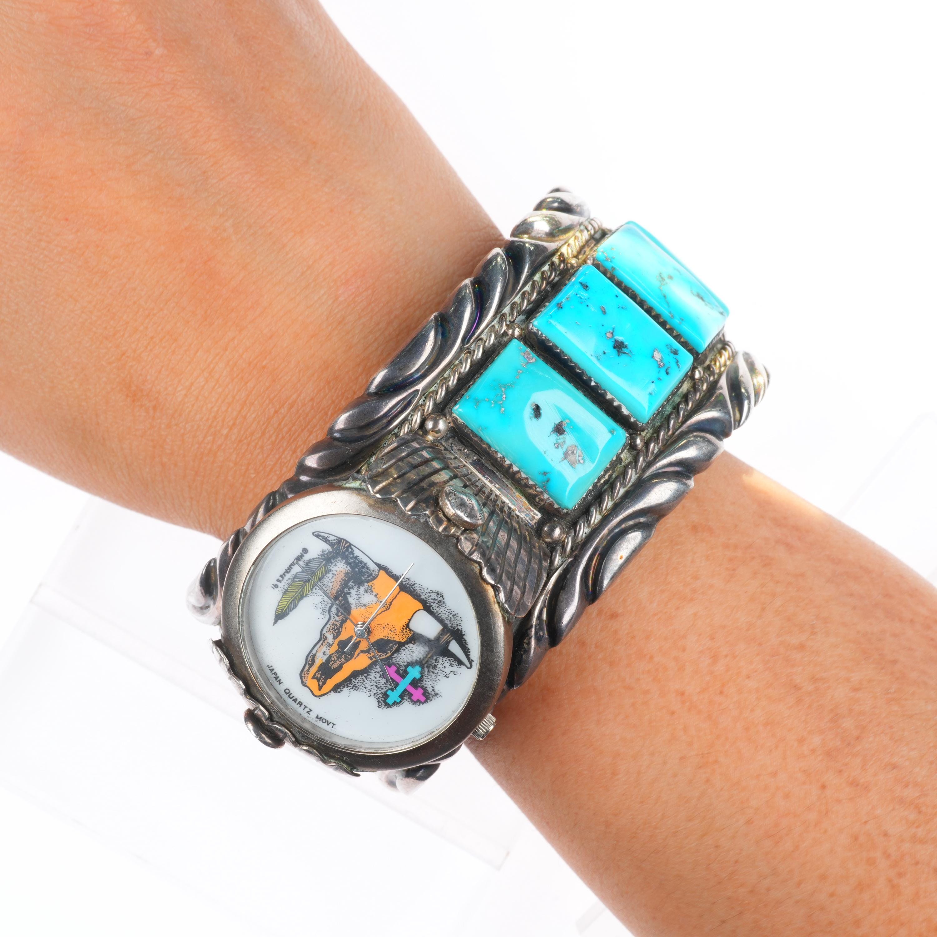 7.6" Ben Touchine vintage Navajo sterling silver turquoise watch cuff bracelet. Selling the watch cuff shown with weight and measurement in pictures. Tested and guaranteed solid sterling silver with weight and measurements in photos. Watch untested, needs a battery at least.