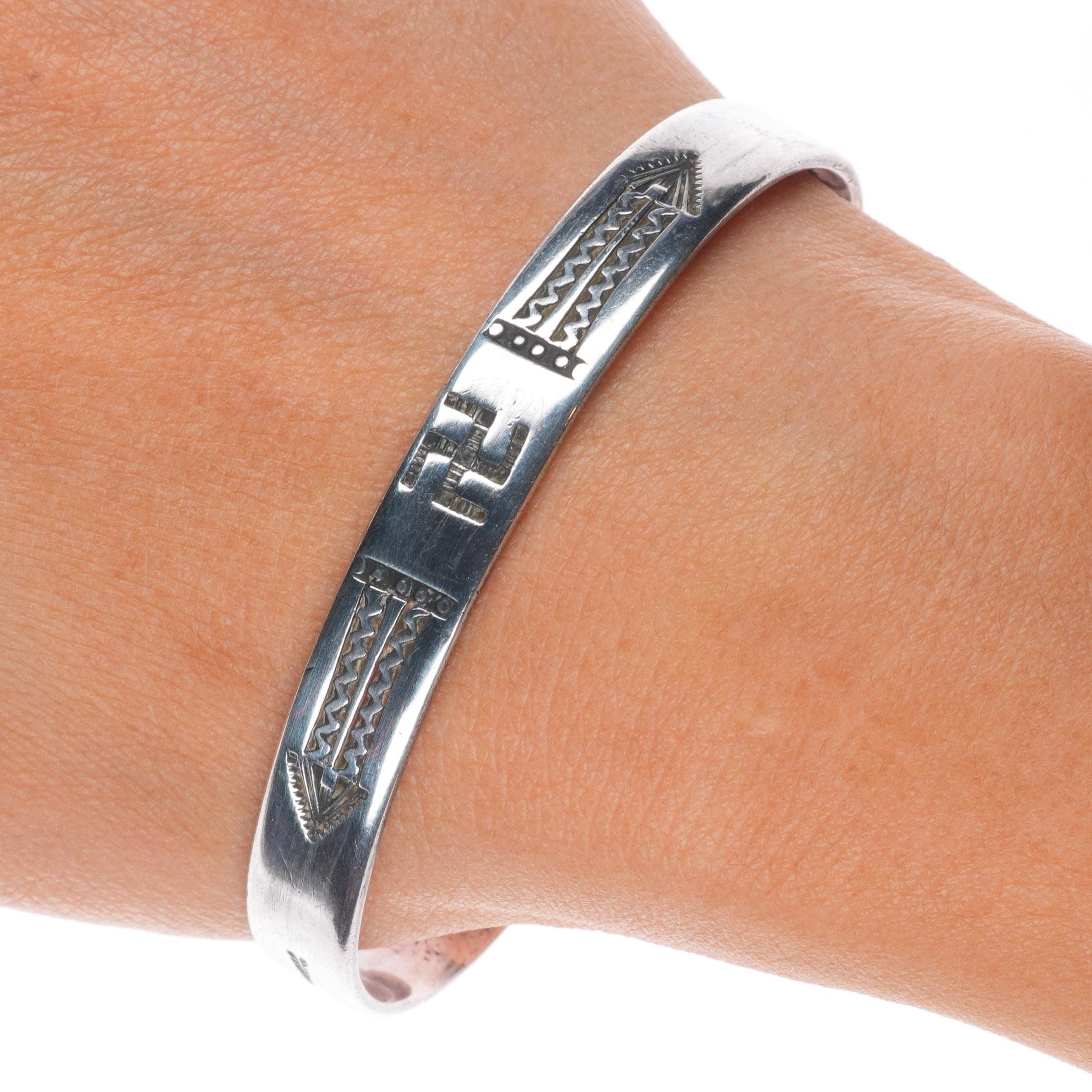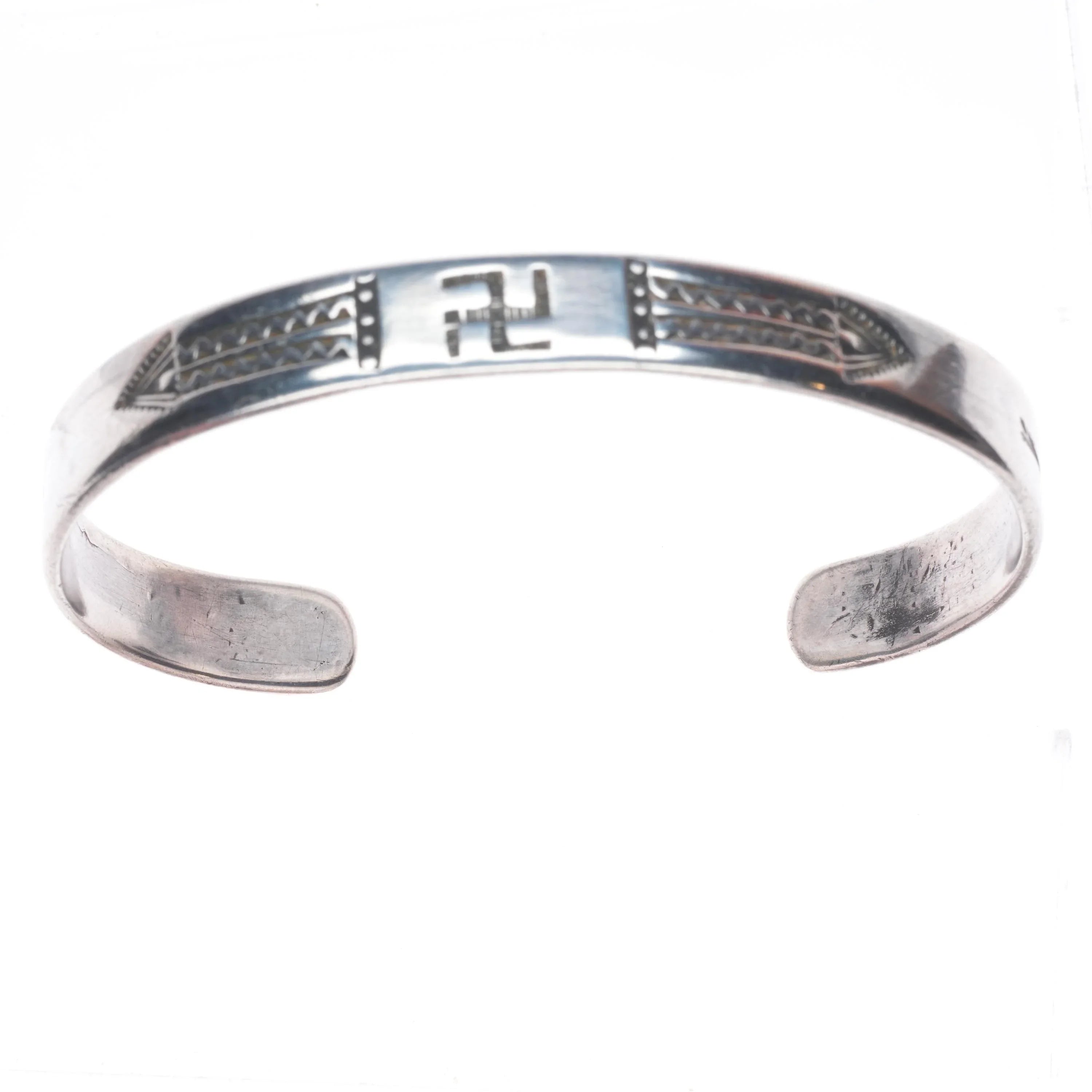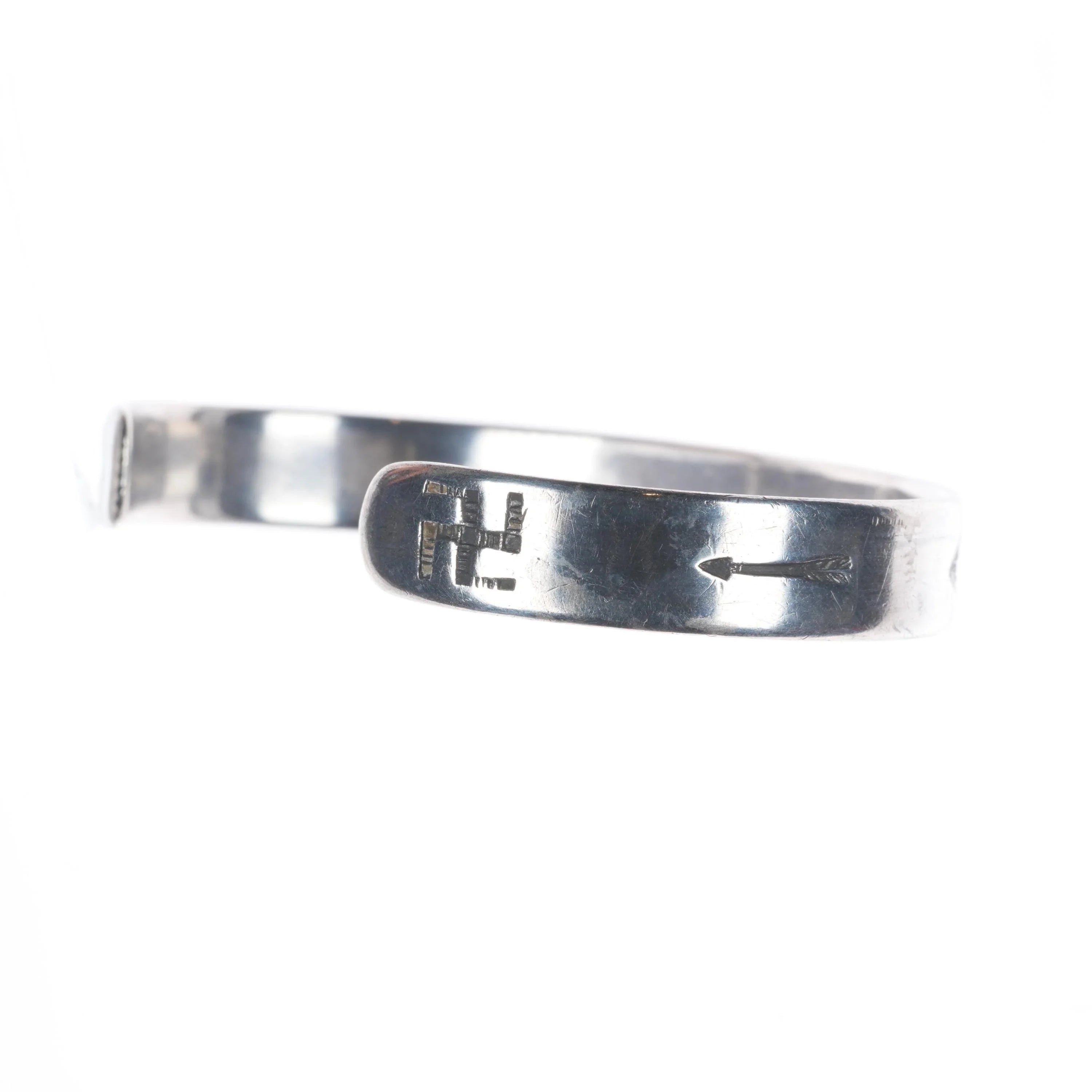 7" Antique Navajo ingot silver whirling logs/arrow slim stacker cuff bracelet . Tested and guaranteed solid sterling silver with weight and measurements in pictures. Unmarked, circa first quarter of the 20th century.