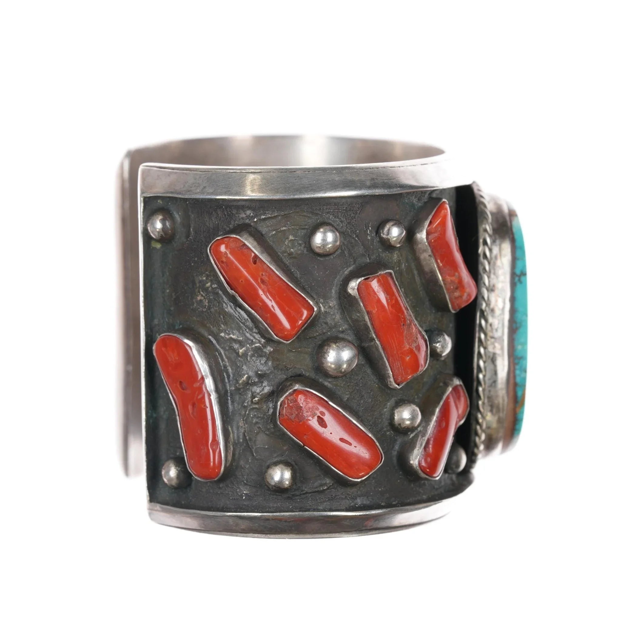 7" AUT Sterling turquoise and coral heavy cuff bracelet