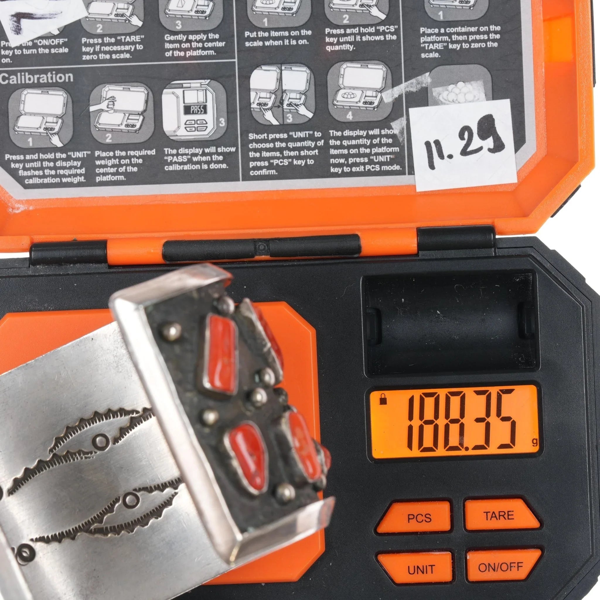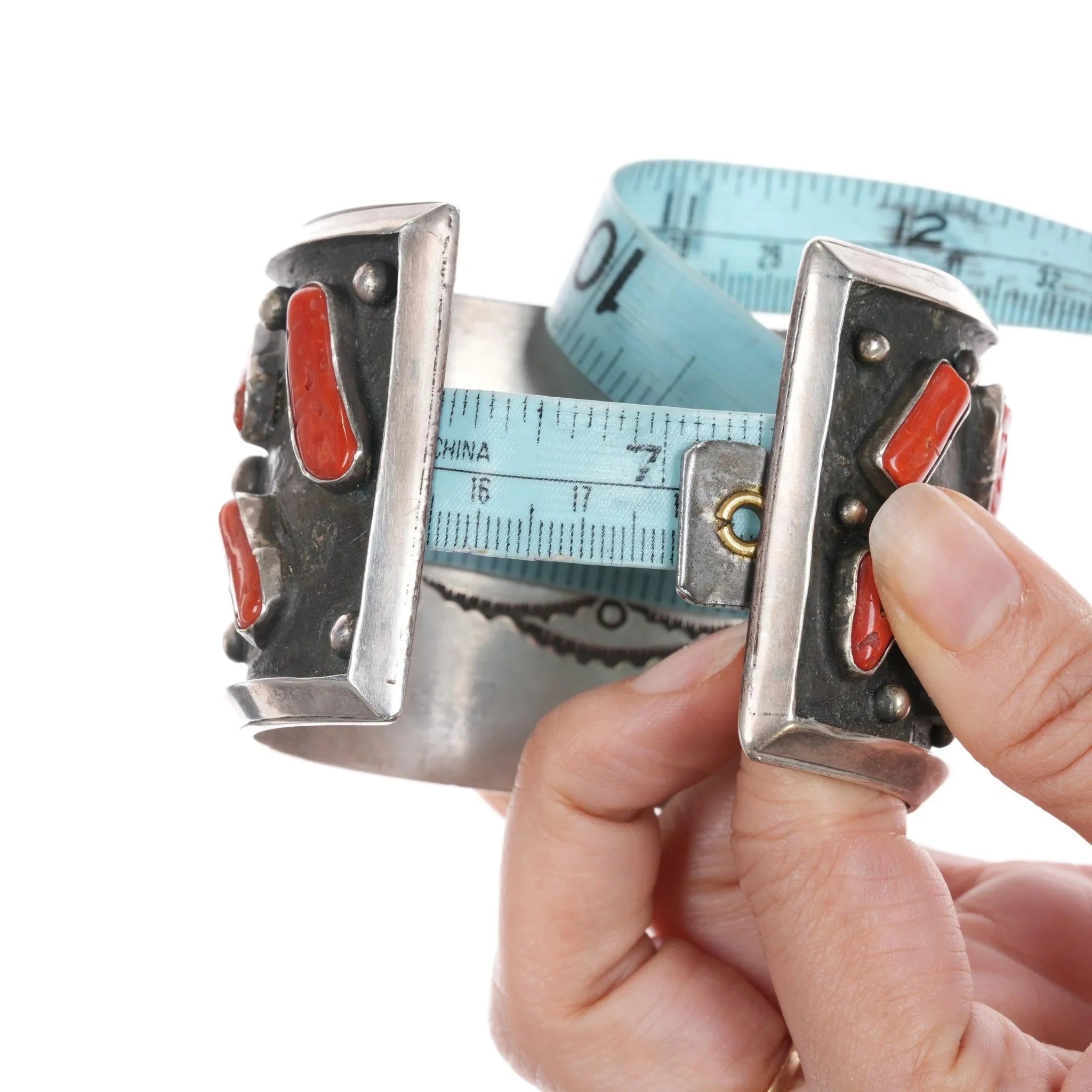 7" AUT Sterling turquoise and coral heavy cuff bracelet, solid sterling silver, weight and measurements in pics.