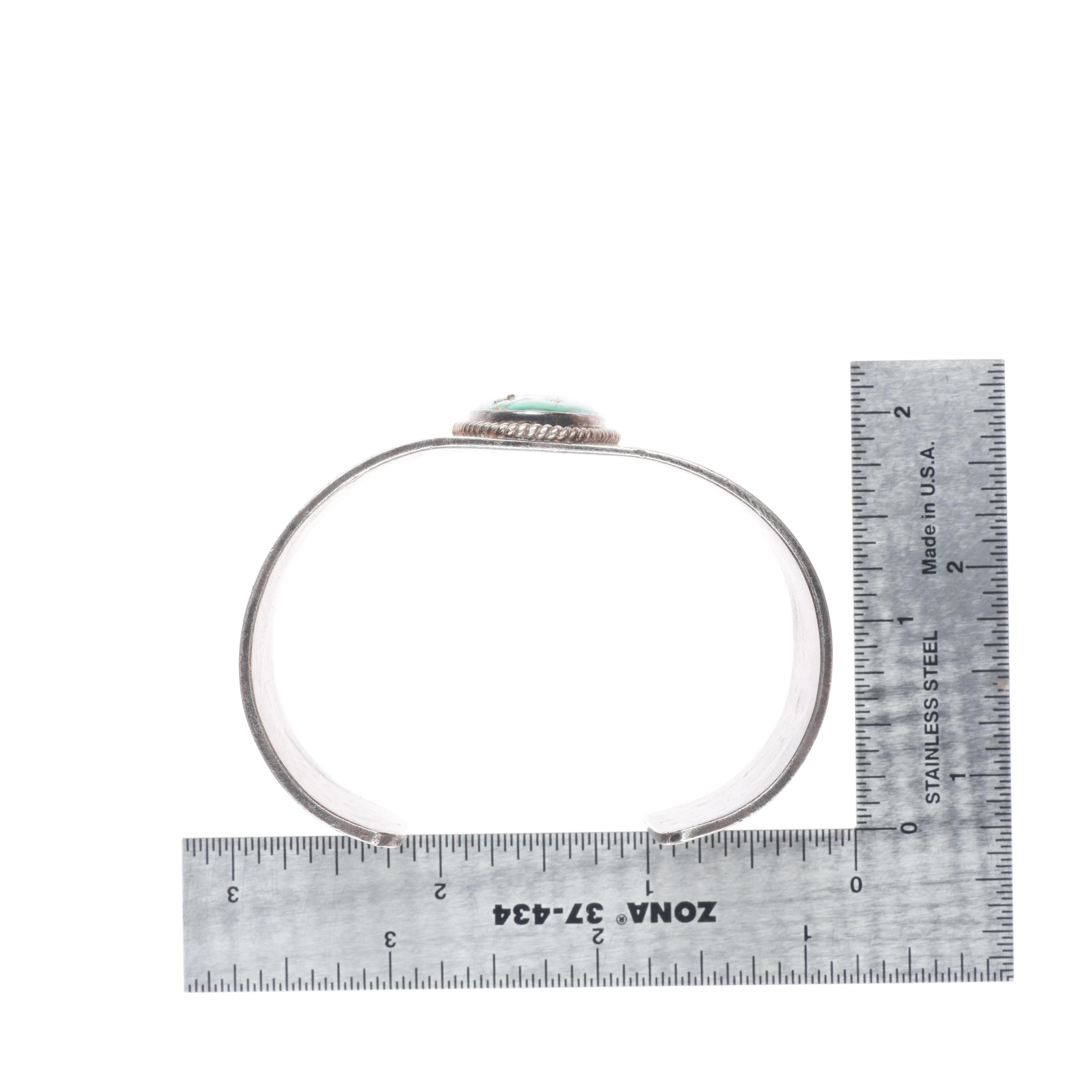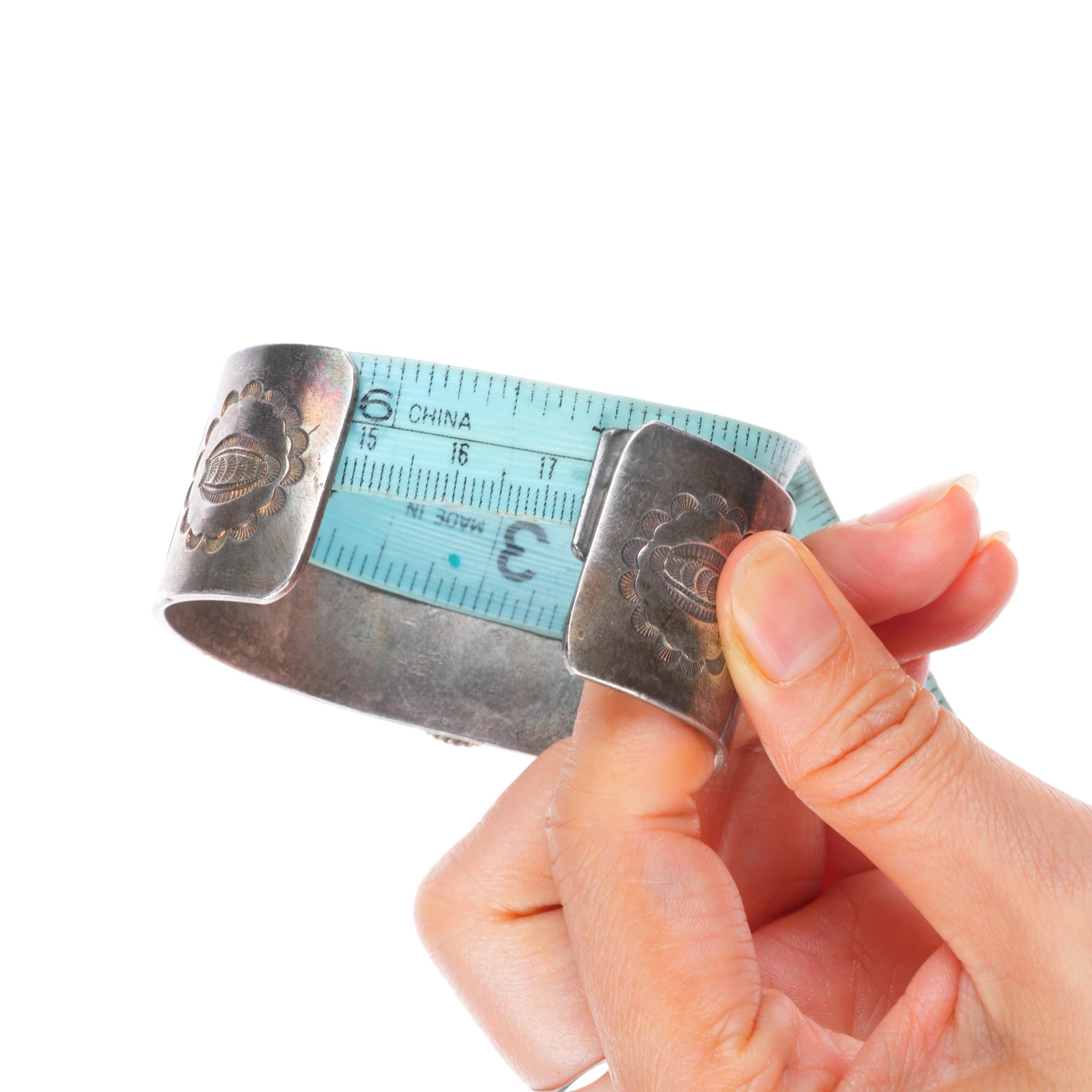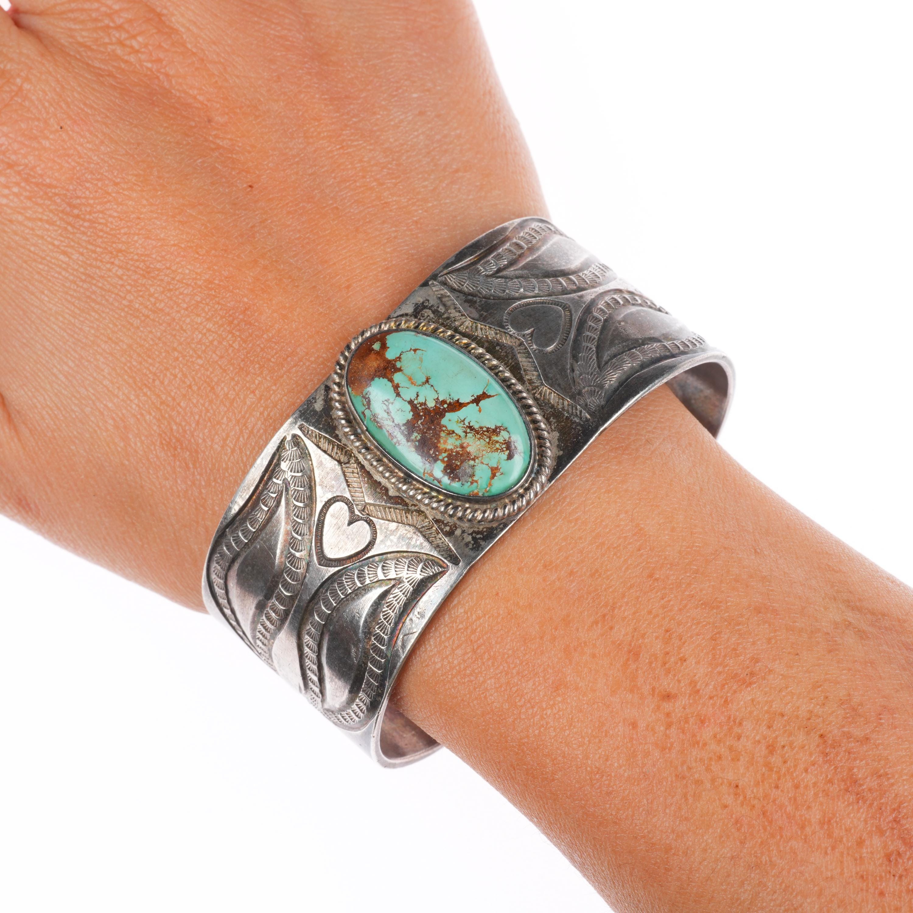 7" c1940 Vintage Navajo intricately stamped/chiseled cuff bracelet w/ turquoise. Tested and guaranteed solid sterling silver with weight and measurements in pictures. Circa second quarter of the 20th century with some expected age appropriate wear.