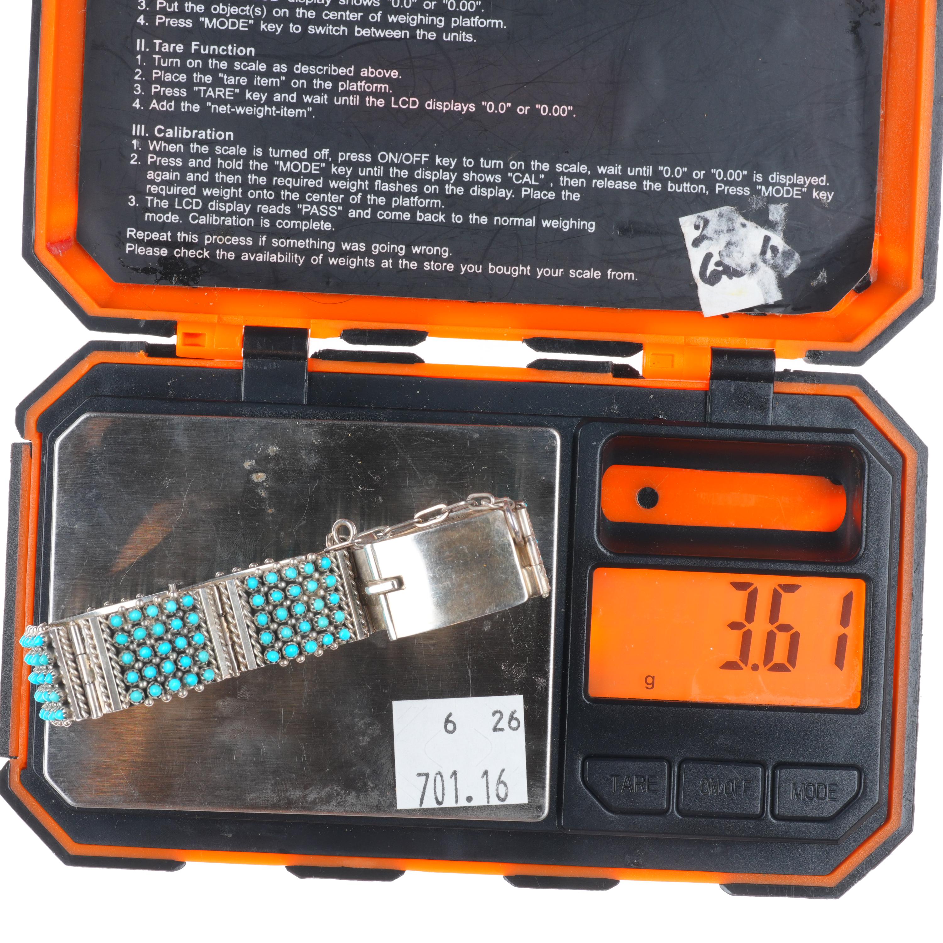 7" Stephen Haloo Zuni sterling silver snake eye turquoise vintage link bracelet. Tested and guaranteed solid sterling silver with weight and measurements in pictures. Great condition with age appropriate wear, circa third quarter of the 20th century. Scale pic is off, it's about 40 grams.