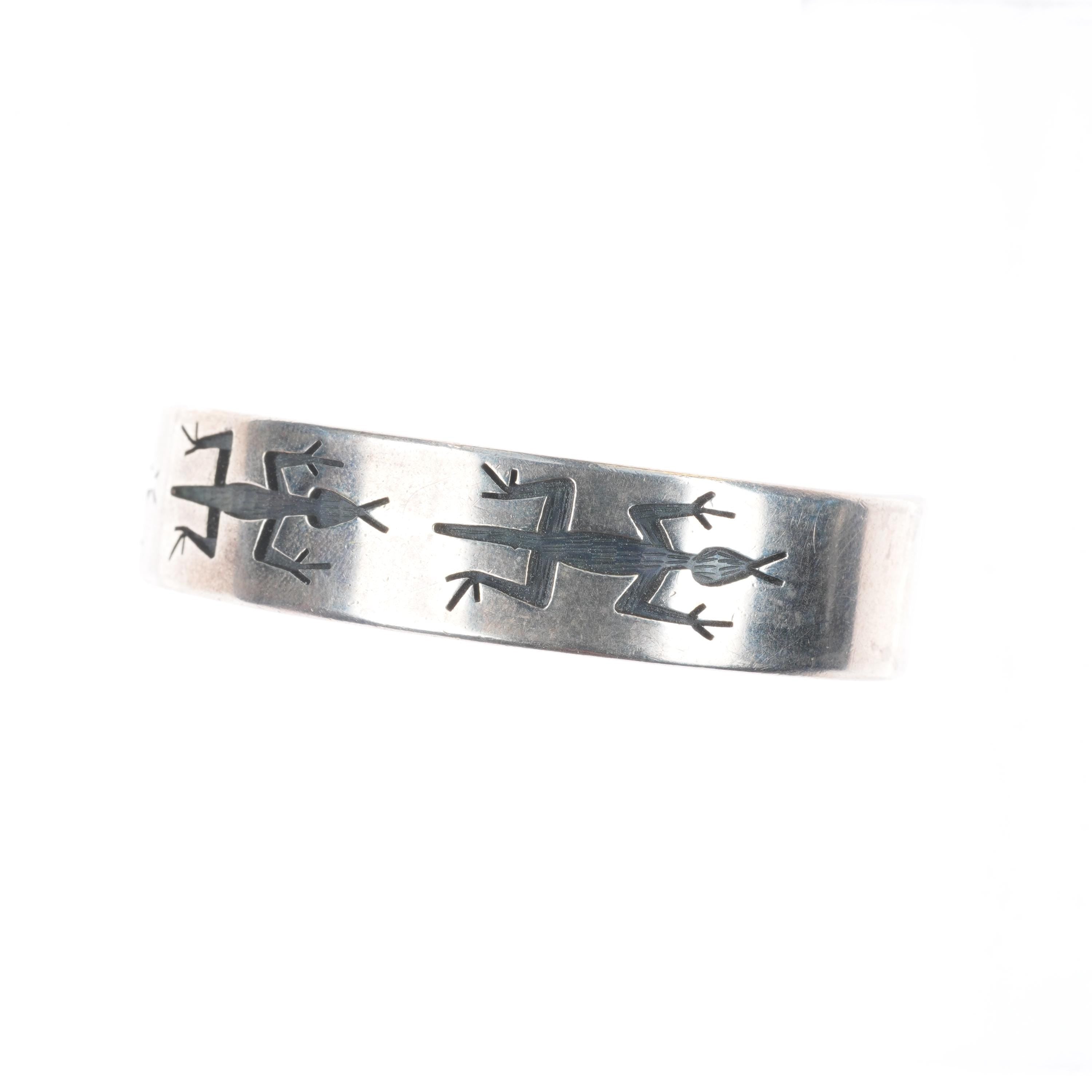 7" vintage Hopi Overlay Lizards cuff bracelet sterling silver. Tested and guaranteed solid sterling silver, with weight and measurements in pictures, circa last quarter of the 20th century. unknown hallmark shown in last pic.
