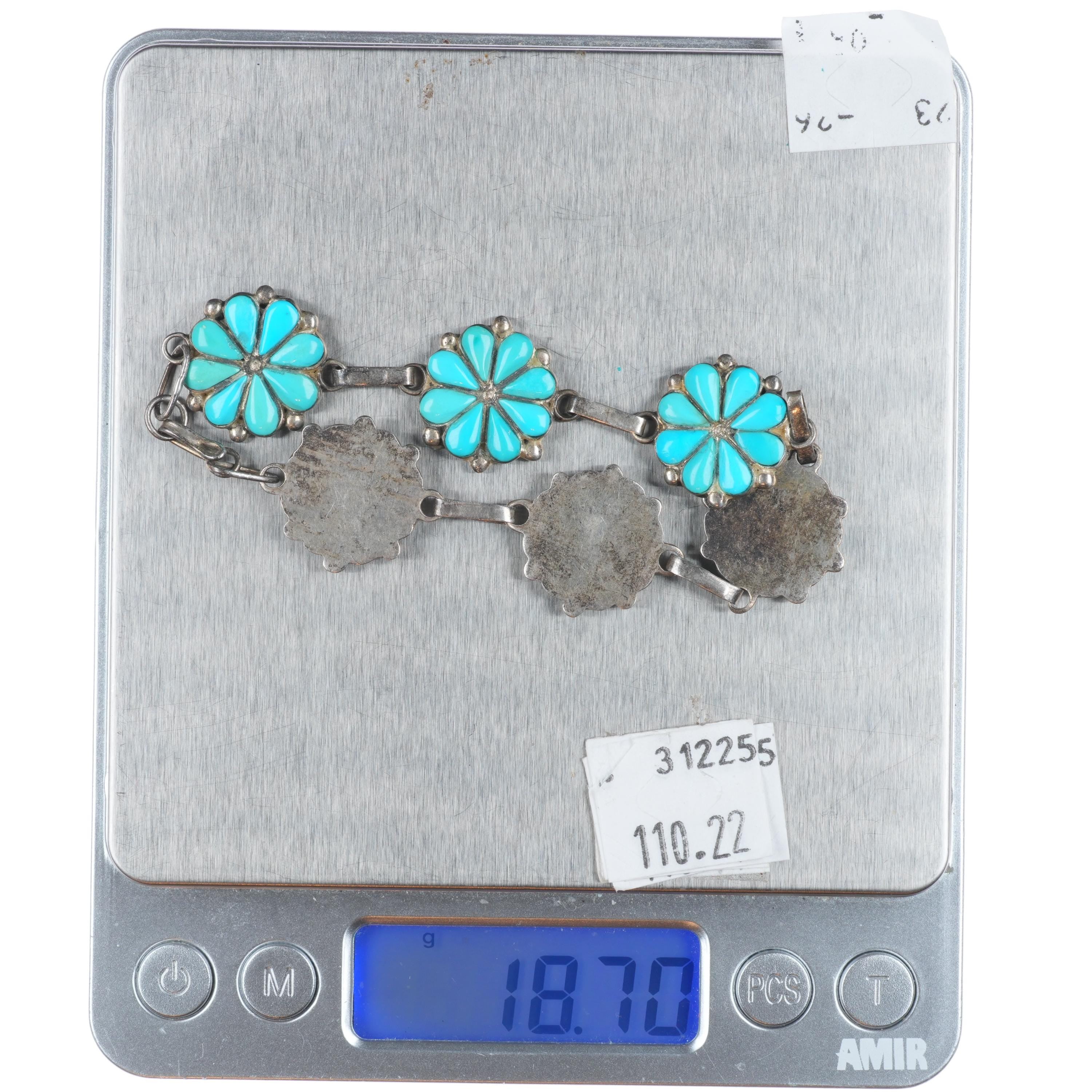 7" Vintage Zuni sterling silver channel inlay turquoise floriform link bracelet. Tested and guaranteed solid sterling silver with weight and measurements in pictures. Circa third quarter of the 20th century with age appropriate wear..
