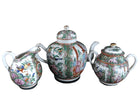 Antique Chinese Famille Rose Medallion Teapot Creamer and Sugar. This is an assembled set, the teapot is mid to late 19th century, Sugar about 1900 and creamer about 1920. They look good together all three with good painting and no damage.. Some wear to gilding and glaze flake on teapot handle shown when spout is facing right. Sugar is 5" tall, teapot is 7" tall. Selling the pieces shown with no cracks, chips, or restorations. Underglaze factory chips on bottom rim of sugar lid. TW226