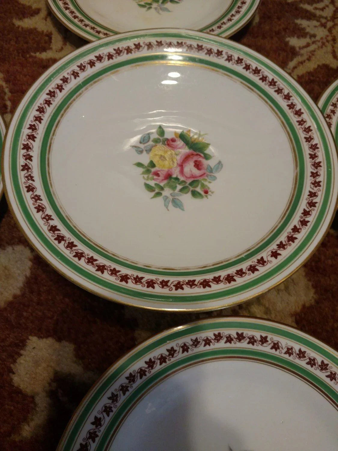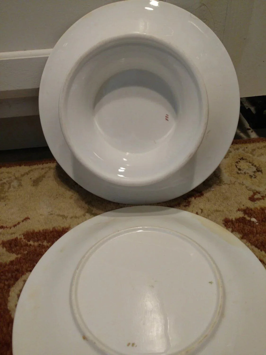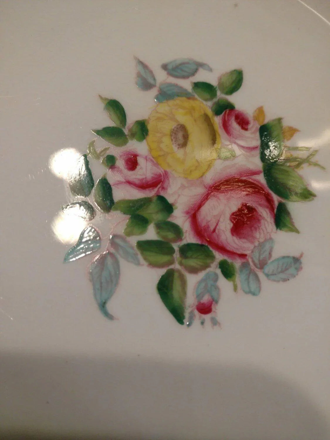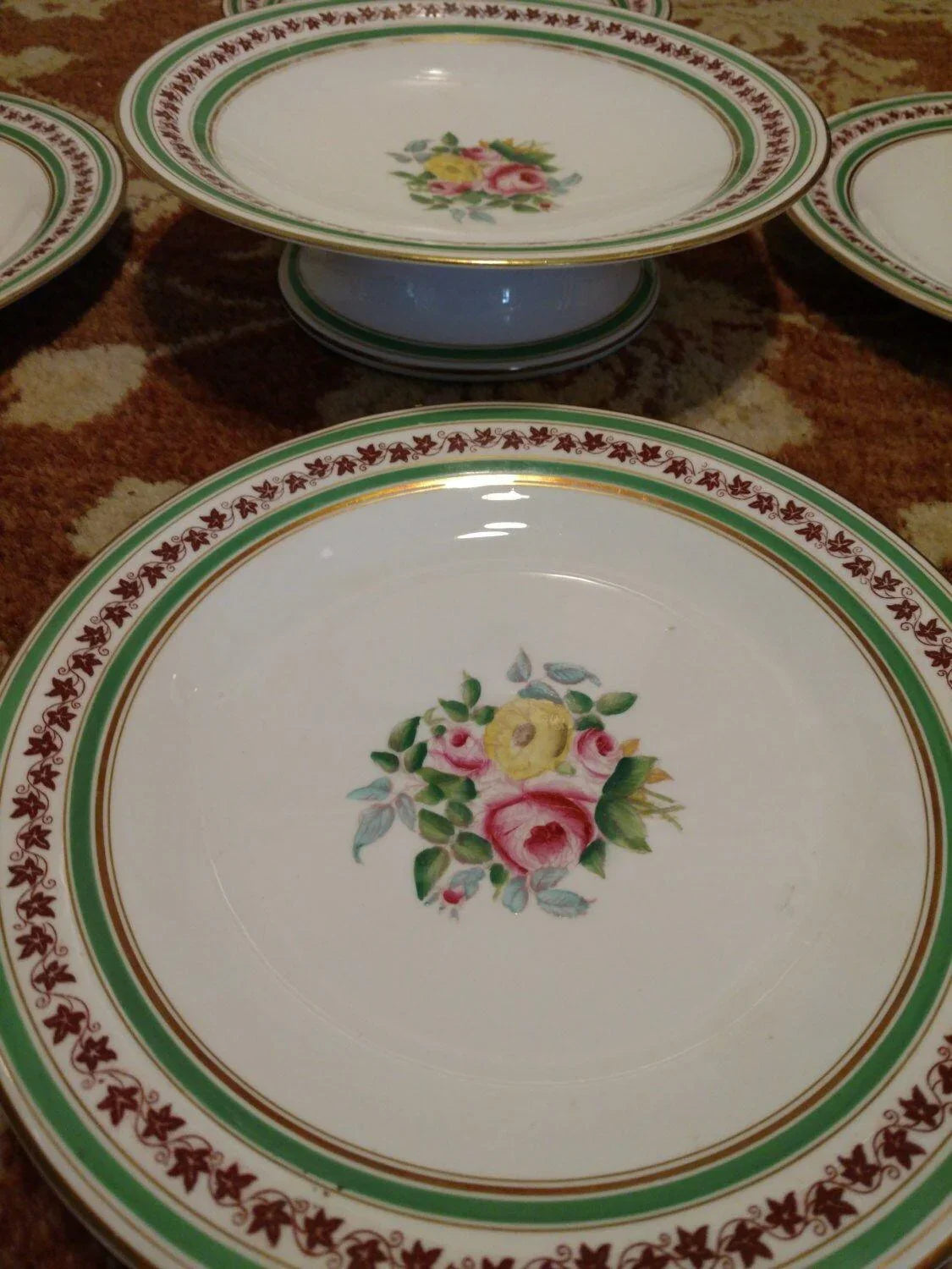 Really nice early 1800's to 1860's compote set. I believe the Brown leaves on the rim are transfer printed, but am positive the flowers in the centers are hand painted. Every piece has slight variations some even have different colored roses in the same spots. The plates were made on a potters wheel. The Compote and plates are 9" wide x 2.5" tall, no cracks, chips, or restorations on any of the 5 pieces there is minor gold wear on the compote, very minor utensil marks here and there on all pieces, extremely light stains on the front and back of one plate. This is a really clean set and very early.