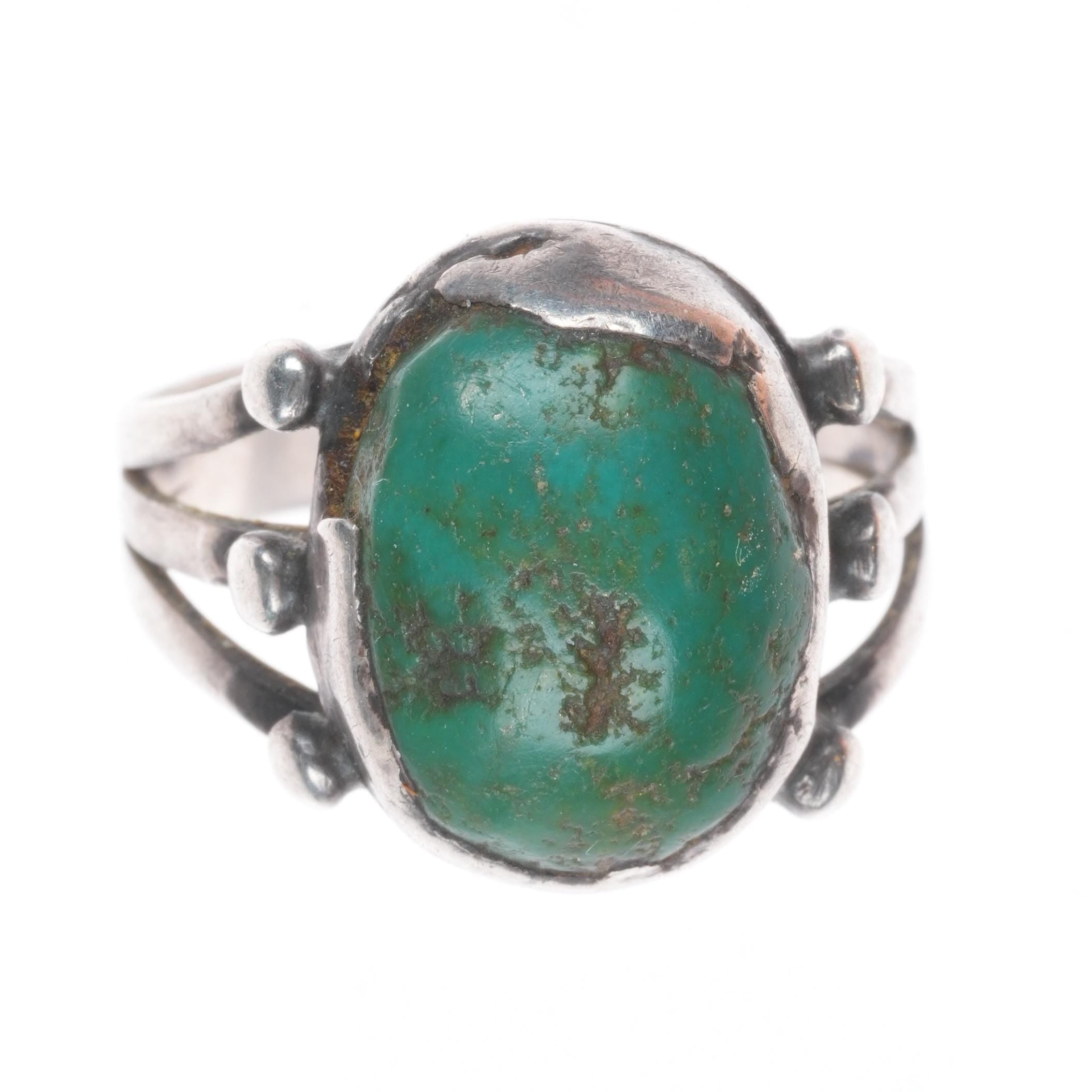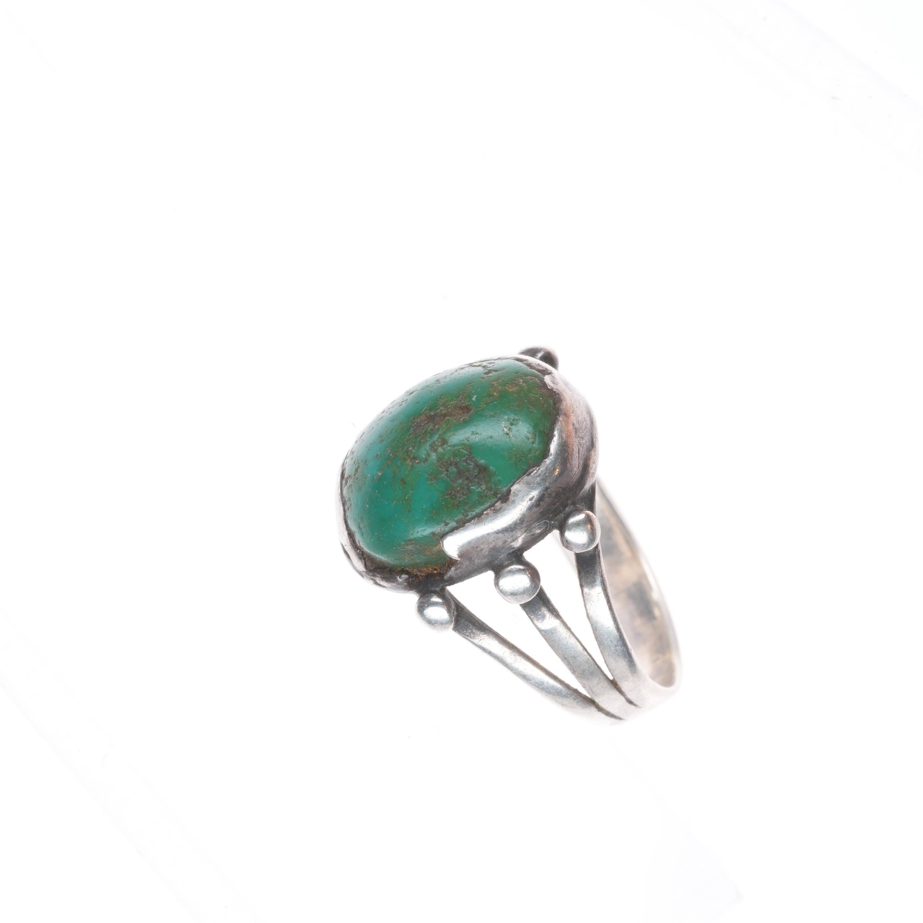 Antique Navajo ingot silver ring with green turquoise. Tested and guaranteed solid sterling silver. Significant wear, some loss to bezel as shown, antique ring from the first quarter of the 20th century.. Some expected wear, weight and measurements in pictures.