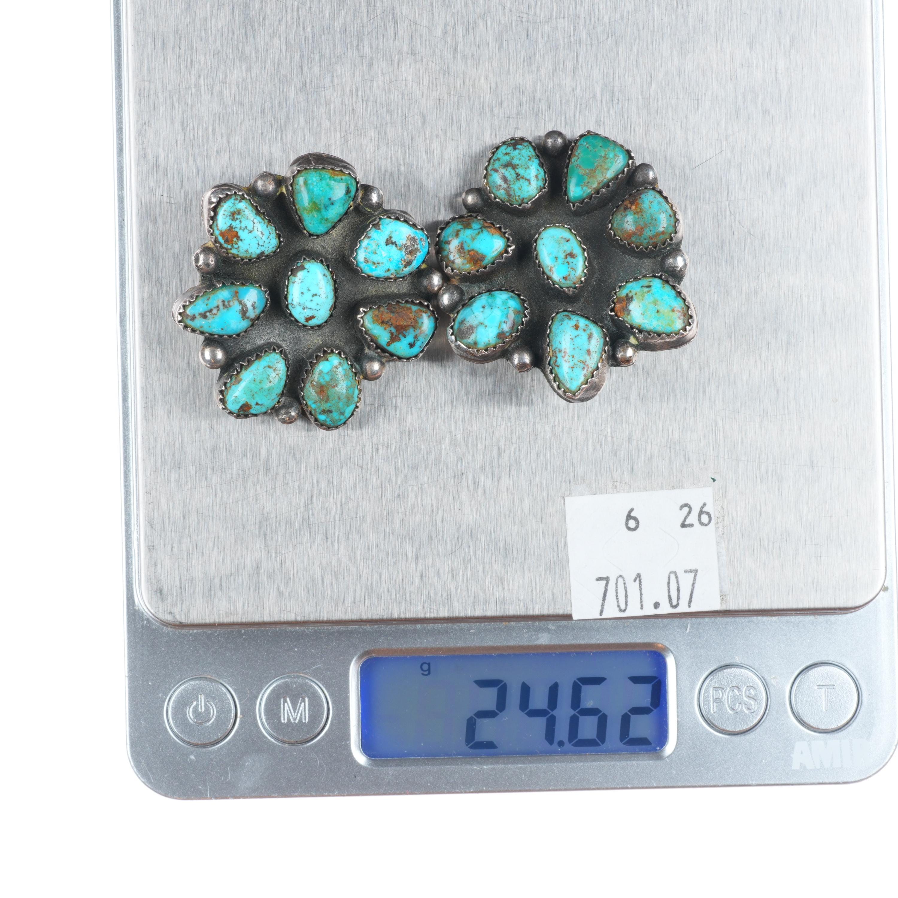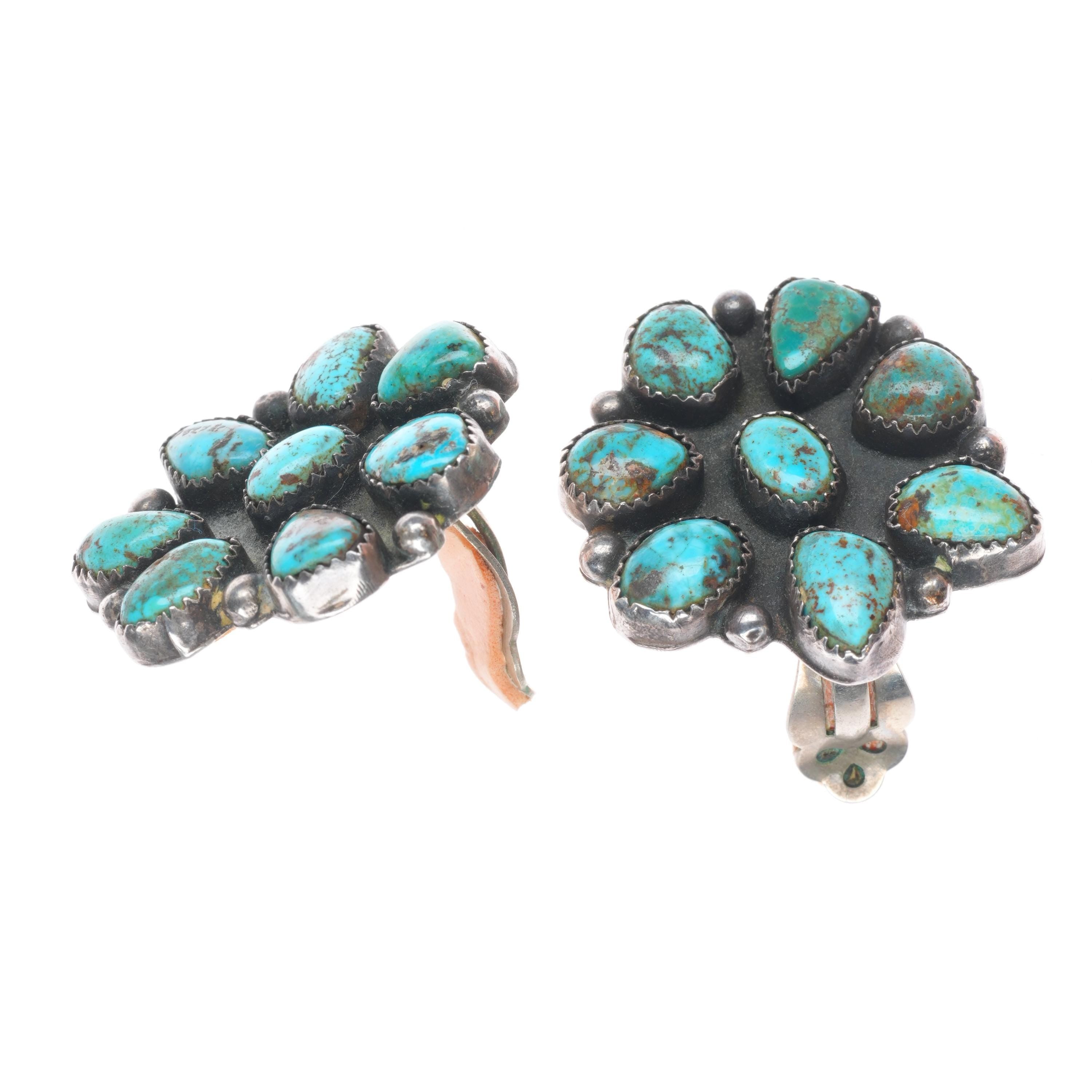 big Vintage high grade turquoise cluster Navajo sterling silver clip earrings. Great earrings with no issues, tested and guaranteed solid sterling silver, any marks detected, weight, and measurements will be shown in the pictures. Circa third quarter of the 20th century. Strong springs on clips.