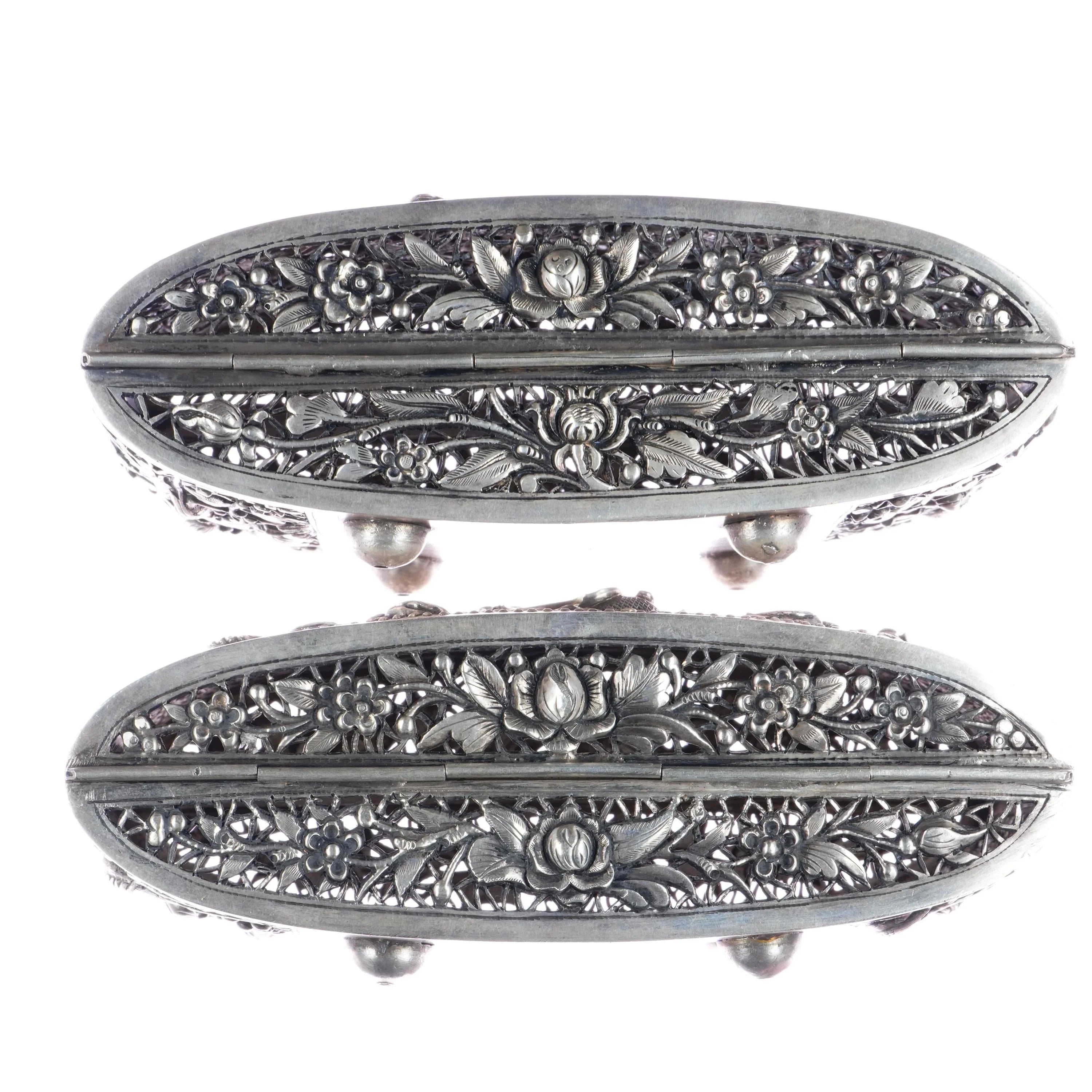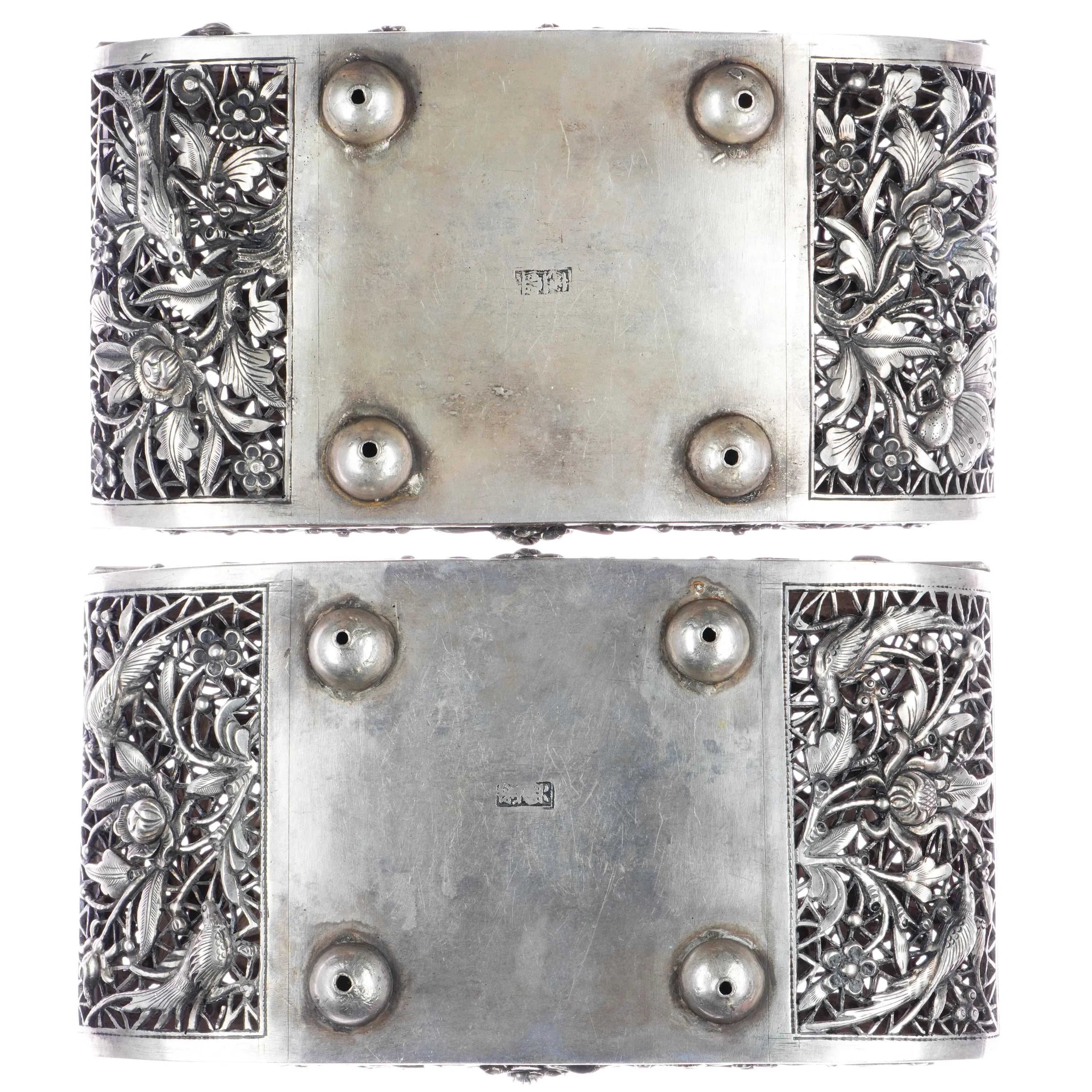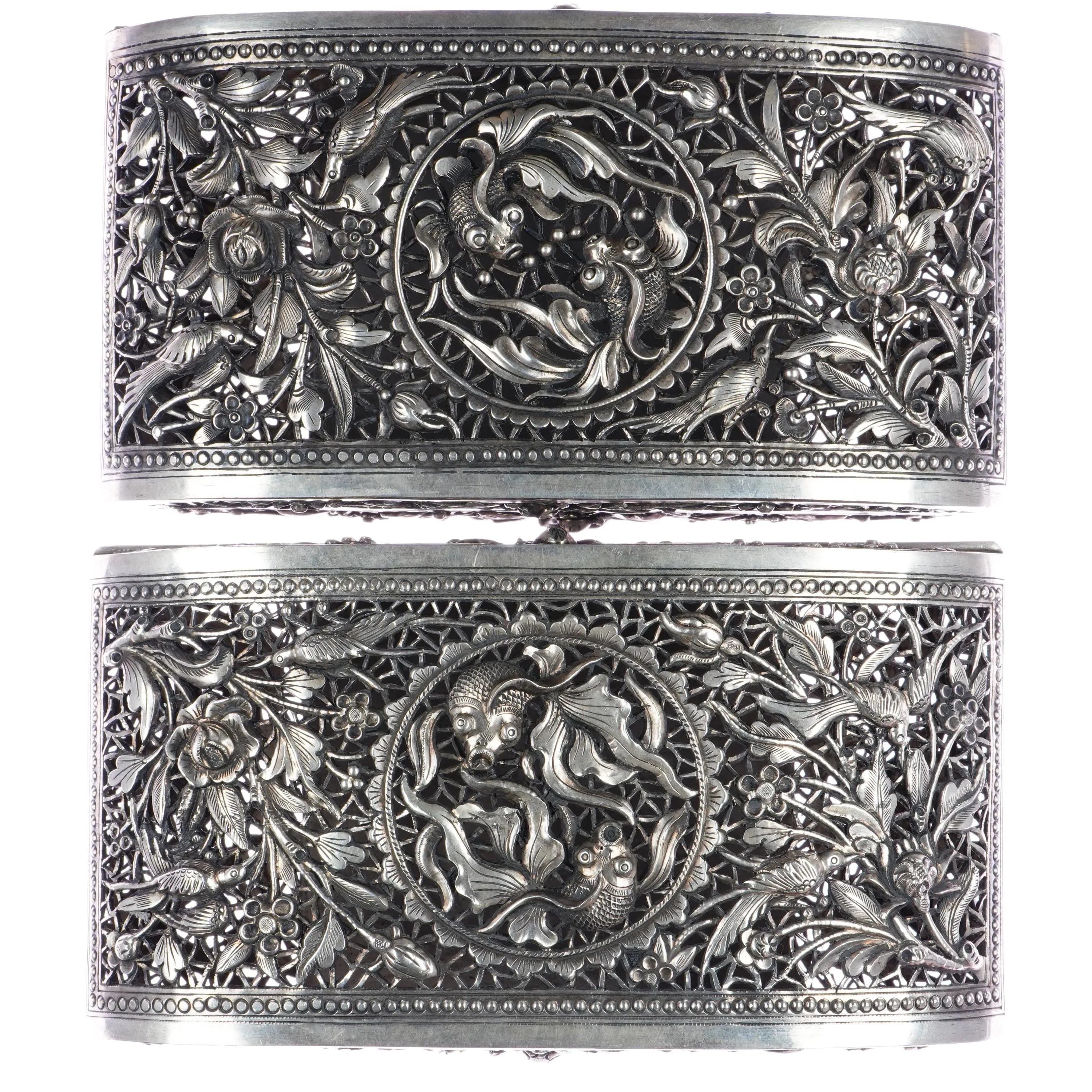 c1900 Large pr Antique Chinese export Silver pierced boxes. Tested and guaranteed solid high content silver. Very fine quality with no significant issues. Slight variations as they are handmade, but they are a pair. Both with good hinges, both snap shut and stay shut tightly. Each 5.75" x 3" x 2" tall. 410 grams total weight. Each illegibly hallmarked, I didn‘t put time into figuring out the hallmarks. Selling both of the boxes shown.