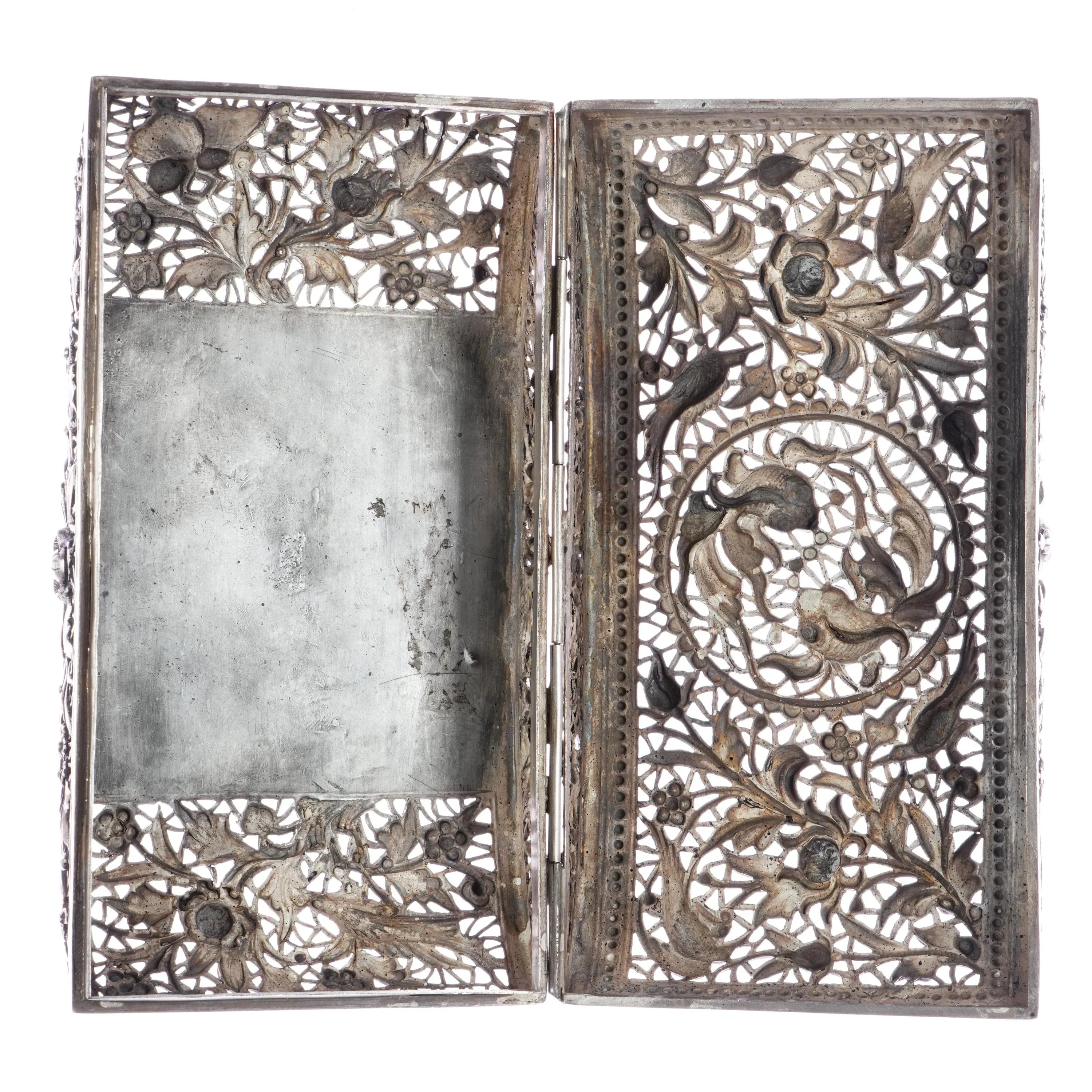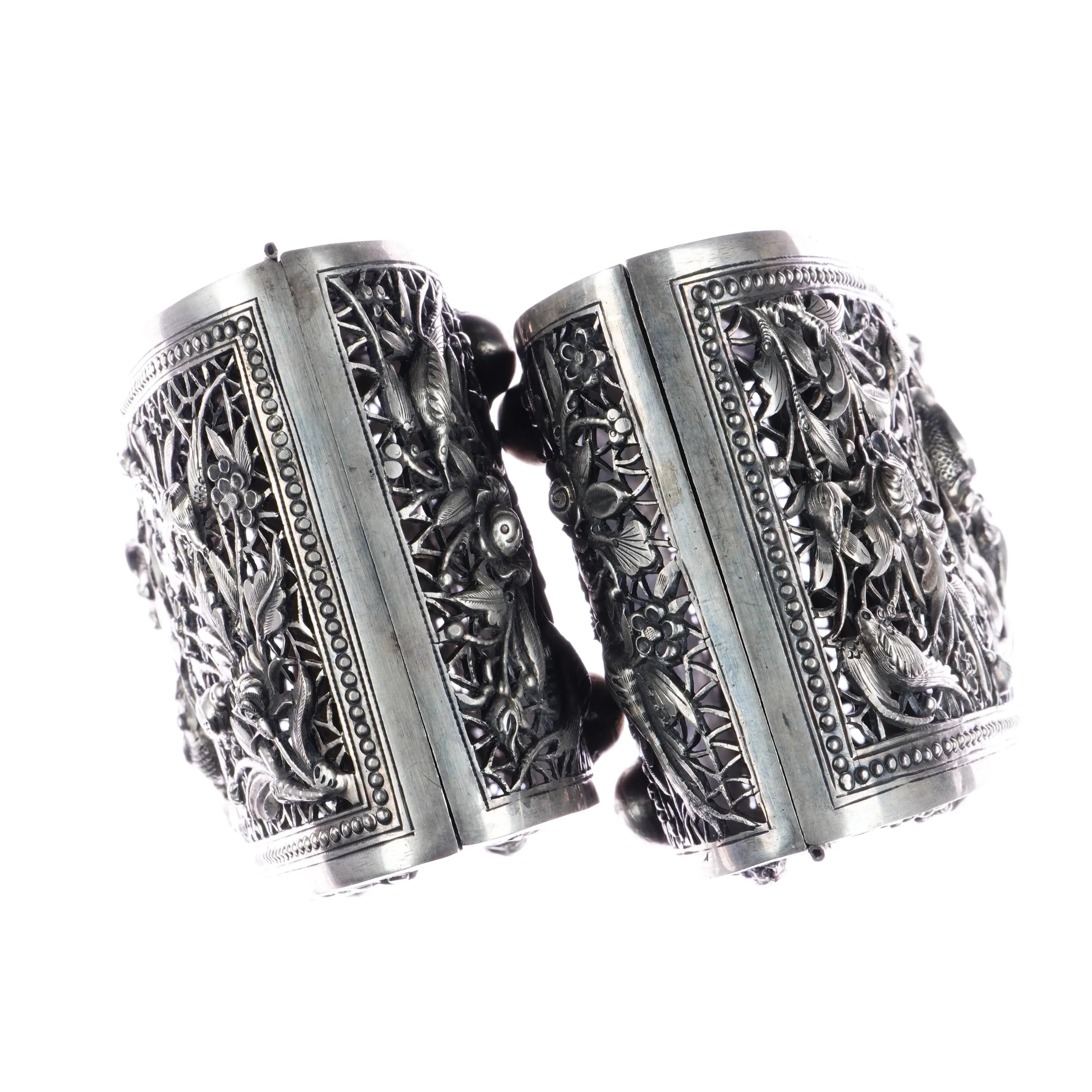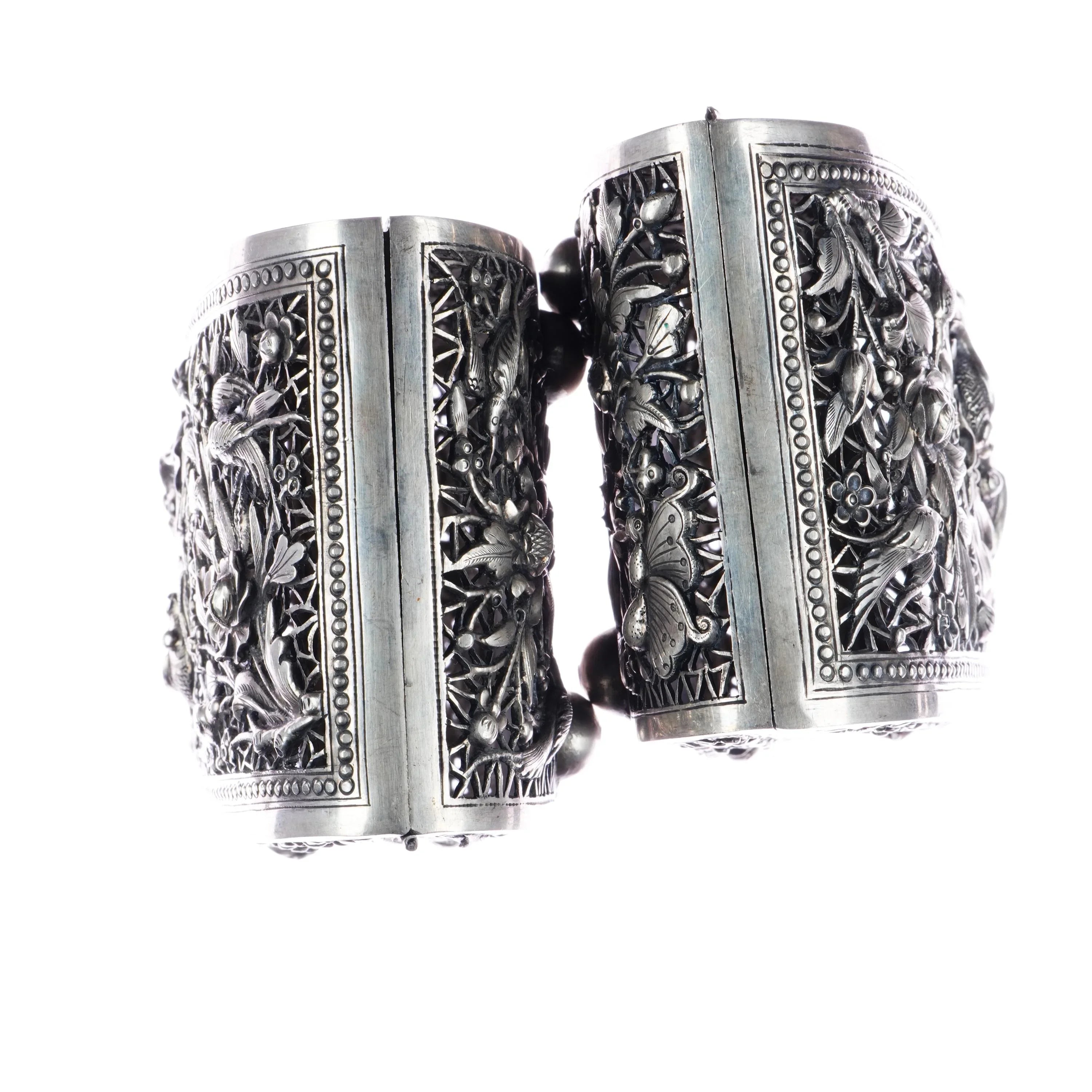 c1900 Large pr Antique Chinese export Silver pierced boxes. Tested and guaranteed solid high content silver. Very fine quality with no significant issues. Slight variations as they are handmade, but they are a pair. Both with good hinges, both snap shut and stay shut tightly. Each 5.75" x 3" x 2" tall. 410 grams total weight. Each illegibly hallmarked, I didn‘t put time into figuring out the hallmarks. Selling both of the boxes shown.