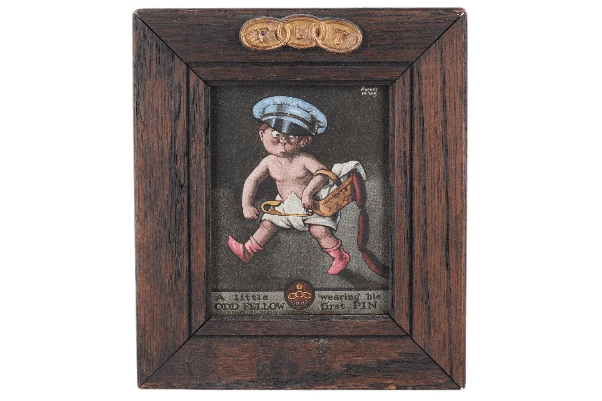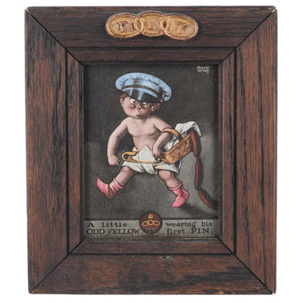 c1910 FLT A little Odd Fellow Wearing His First Pin Print with Oak Frame. 5.5" x<br>6.25" framed with no issues.<br><br>Odd Fellows’ history is either a few hundred years old; or it’s very ancient<br>depending upon what you read. No one knows exactly how far back it goes, but<br>what we do know is that, despite historians’ best efforts to uncover these<br>things, the first Oddfellows (the British spell it as one word) date back to the<br>late 1700s as a “friendly society” or “box club.” A box club is a group that<br>uses a collection box to help members who fall on hard times.<br><br>The Odd Fellows in America (several different orders including the Grand United<br>Order of Odd Fellows, the Independent Order of Odd Fellows, et al.) got their<br>starts by receiving a charter from a British Oddfellows organization to form<br>their own lodges. Eventually, these organizations broke from England and formed<br>their own leadership structures aside from those where Oddfellowship started.<br><br>The mission of Odd Fellows, summarized succinctly, is to benefit the member and<br>to benefit their community. The Independent Order of Odd Fellows prohibit<br>discussion of politics and but they do require an allegiance to the government<br>of which they are a citizen and also to acknowledge the existence of a higher<br>power; once these requirements are met there is no further discussion on these<br>subjects while meeting with each other.<br>isshelf