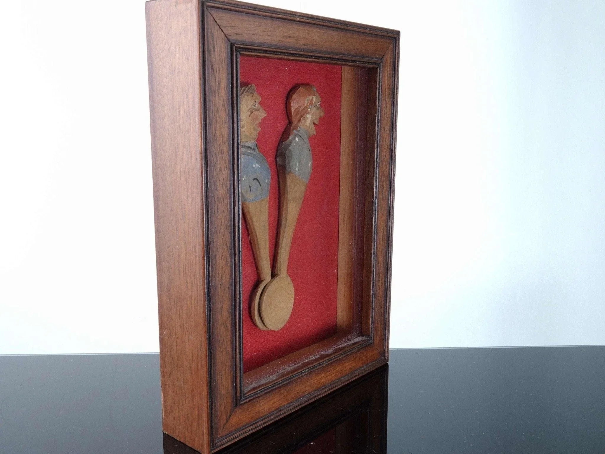 c1950 Vintage Carved wood spoons in shadowbox frame. Two little spoons from the<br>mid 20th century hand carved and hand painted 4 5/8" tall in a 5.25" x 7.25"<br>shadowbox frame.<br>tw227