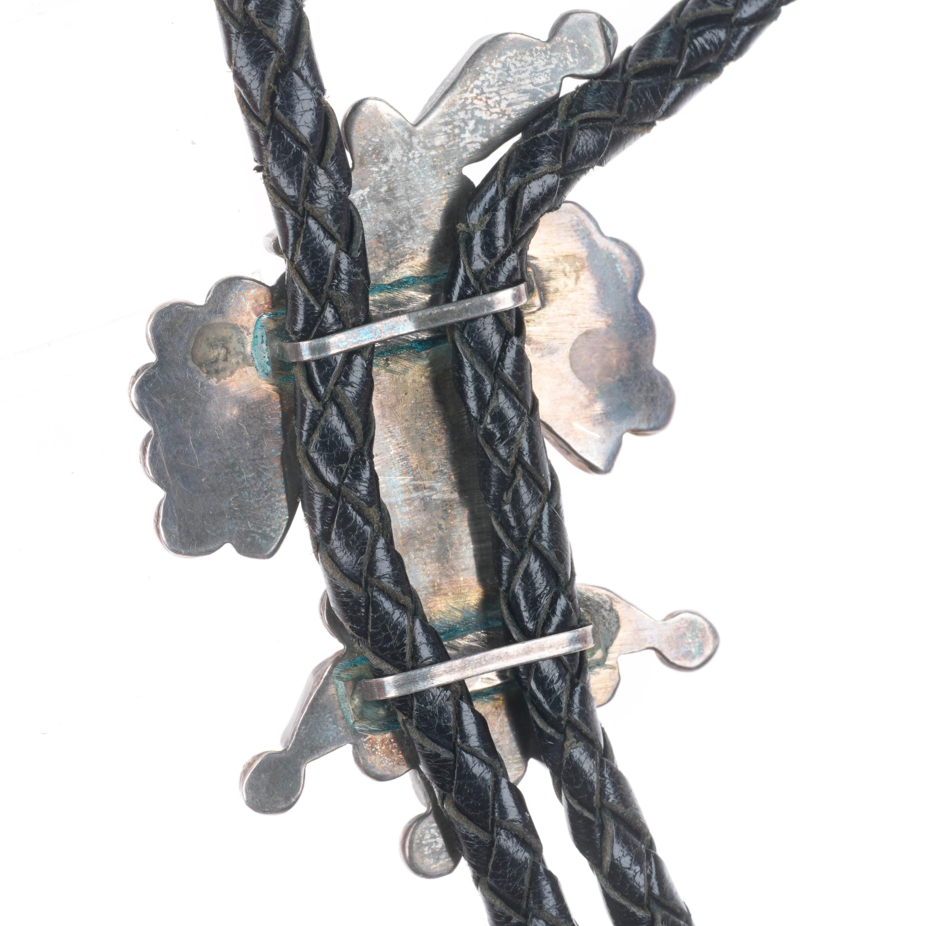 c1950 Vintage Zuni sterling silver channel inlay thunderbird bolo tie fancy tips