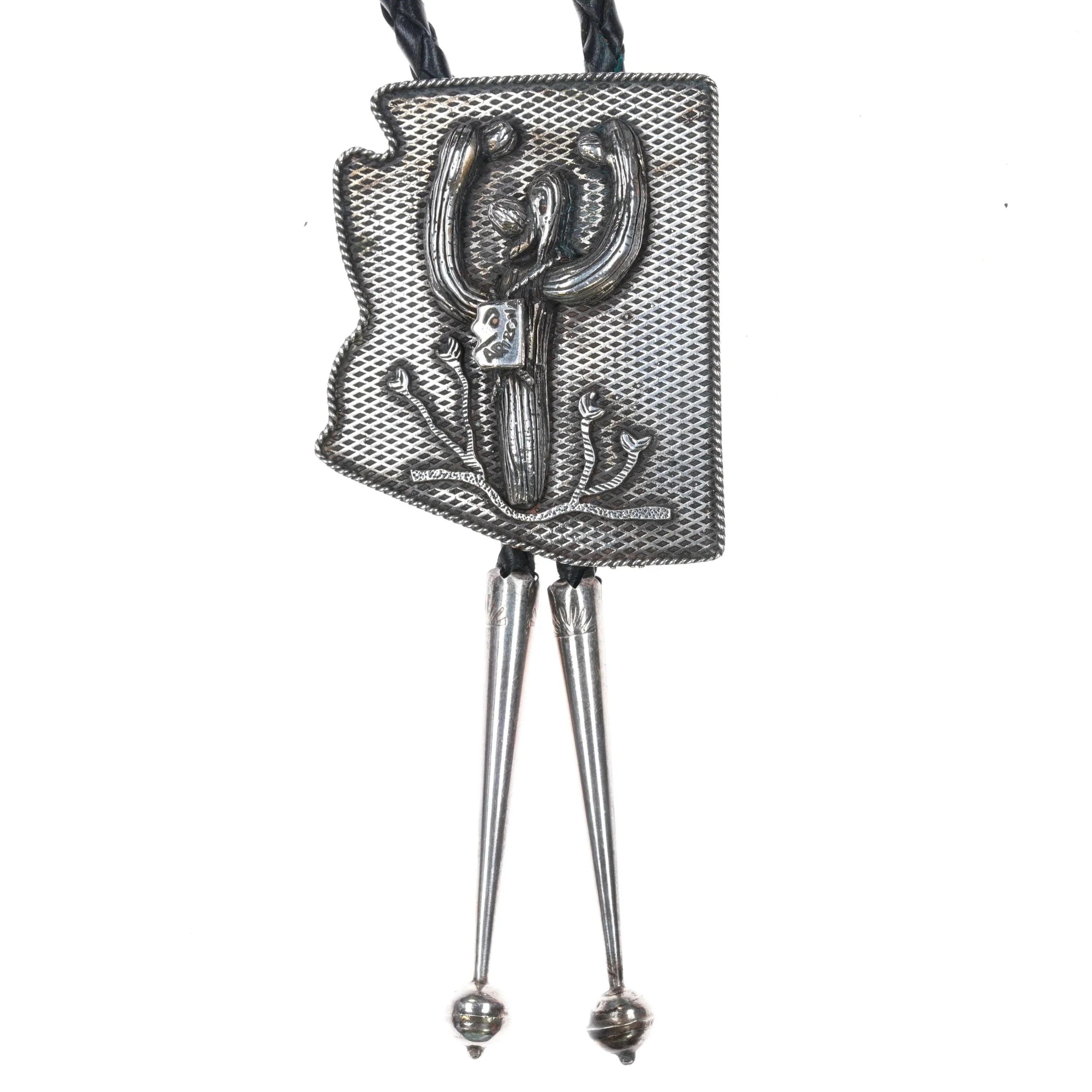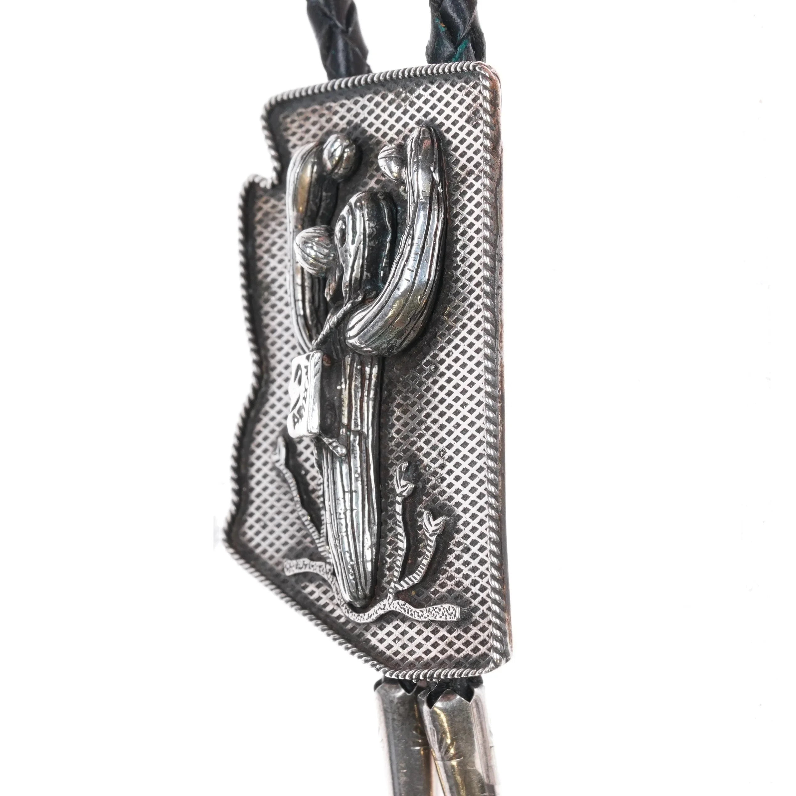 c1970 Bola Bill Arizona Shaped sterling silver bolo tie w saguaro cactus
