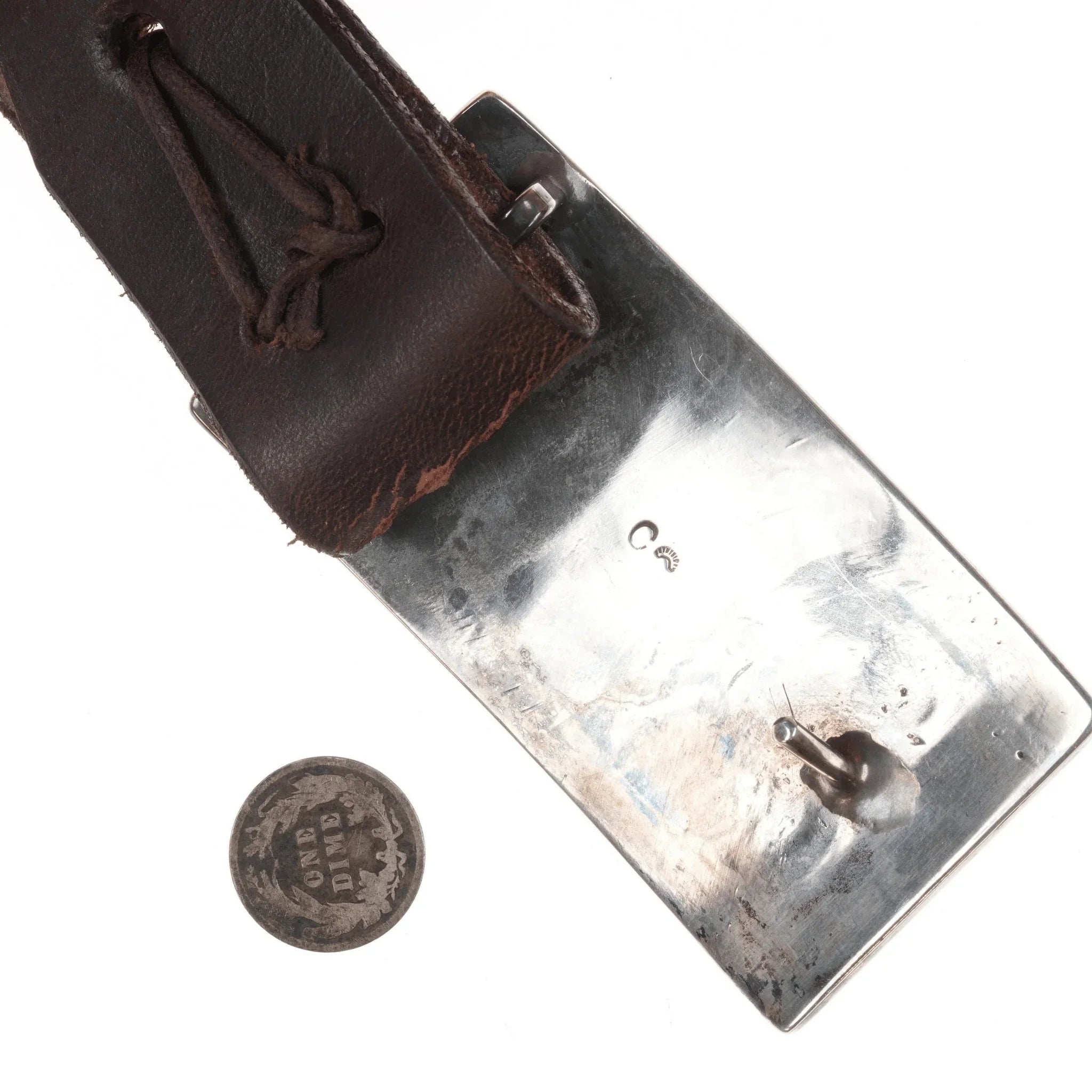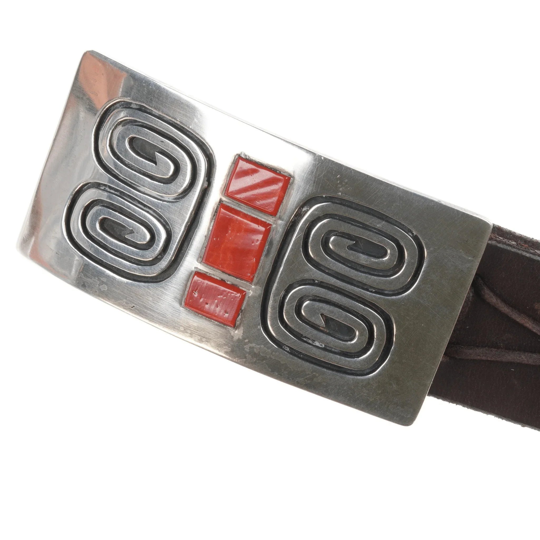 Navajo sterling and coral buckle on 30" belt. Belt is clean, fits a 29"-32" waist, 1.25" wide, Buckle 3 1/8" x 1.5". The belt is tied on, could obviously be replaced but don't want to mess with it in case it works for you.