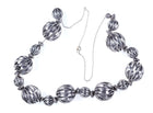 24.5" Heavy Vintage Sterling Beaded necklace. Circa mid 20th century, 96 grams<br>the largest balls are .75" They are hollow but a very heavy guage of sterling<br>silver. All testes sterling, except for one brass ring next to clasp, clasp is<br>marked 925. There is slight fraying to the inside necklace close to the clasp<br>but it appears strong, obviously I didn't play tug of war with it or anything.