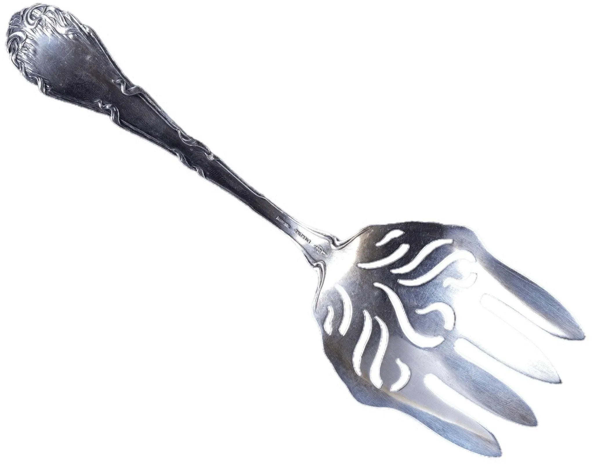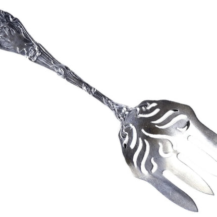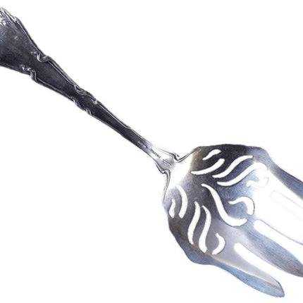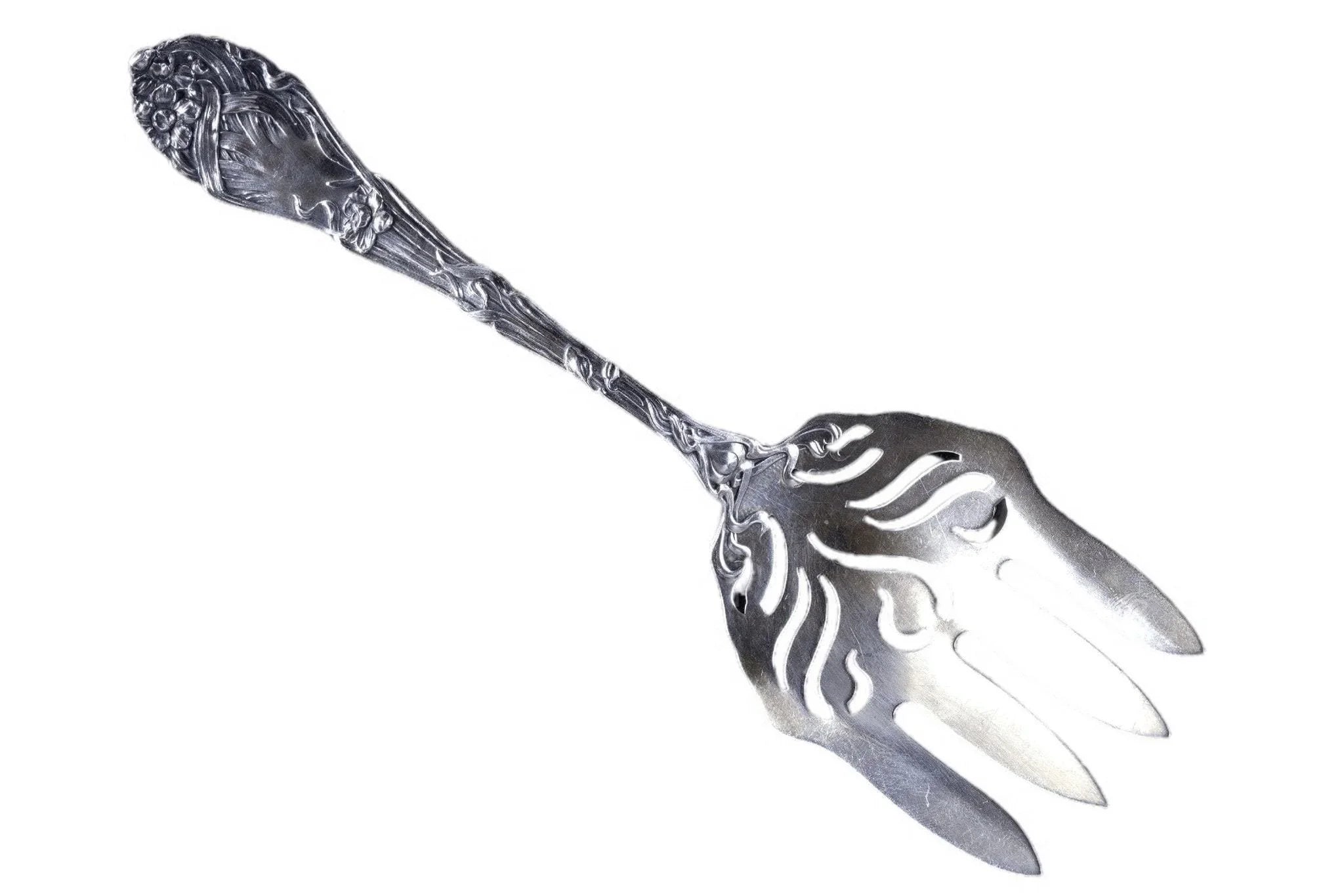 c1905 R Blackington Art Nouveau American Sterling Serving fork 8" long x 2.5"<br>wide in near mint conditon with no issues. 56.5 grams.<br><br>R. BLACKINTON & CO - North Attleboro, MA<br>Founded in 1862 by Walter Balou, Thomas S. Mann and Roswell Blackinton. Sold in<br>1967 to Wells Inc. Managed and owned for many years by members of Ballou and<br>Blackington families. Manufacturer of sterling silver and gold novelties. In the<br>1930s the company was in some way linked to H.R. Morss & Co., Inc. operating at<br>the same address, 244 Broad, Attleboro, and with the same management.<br>tw255