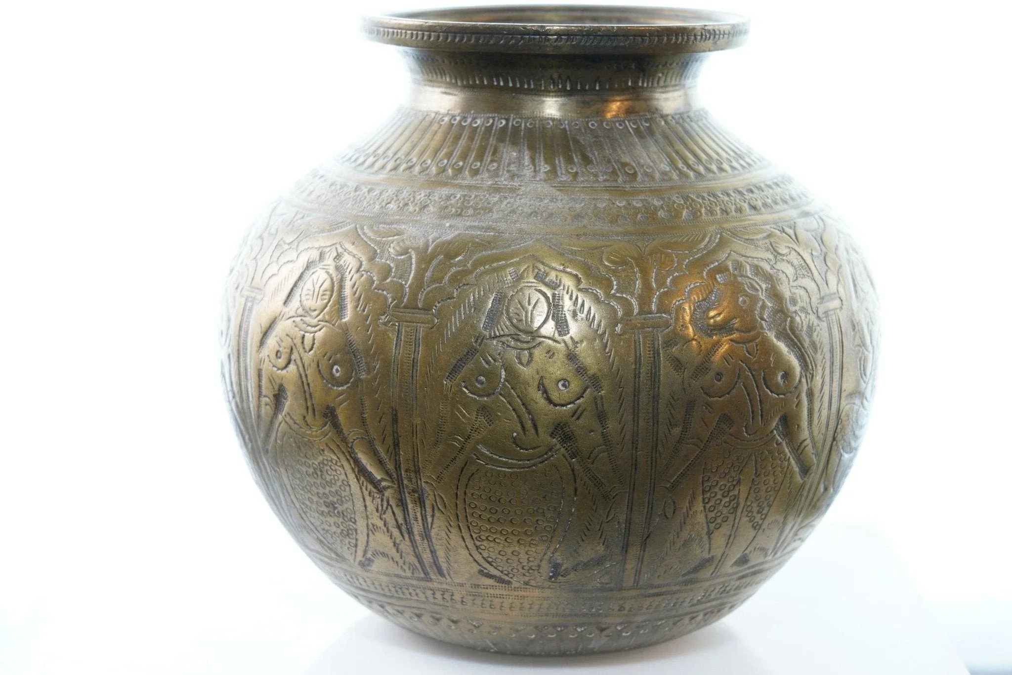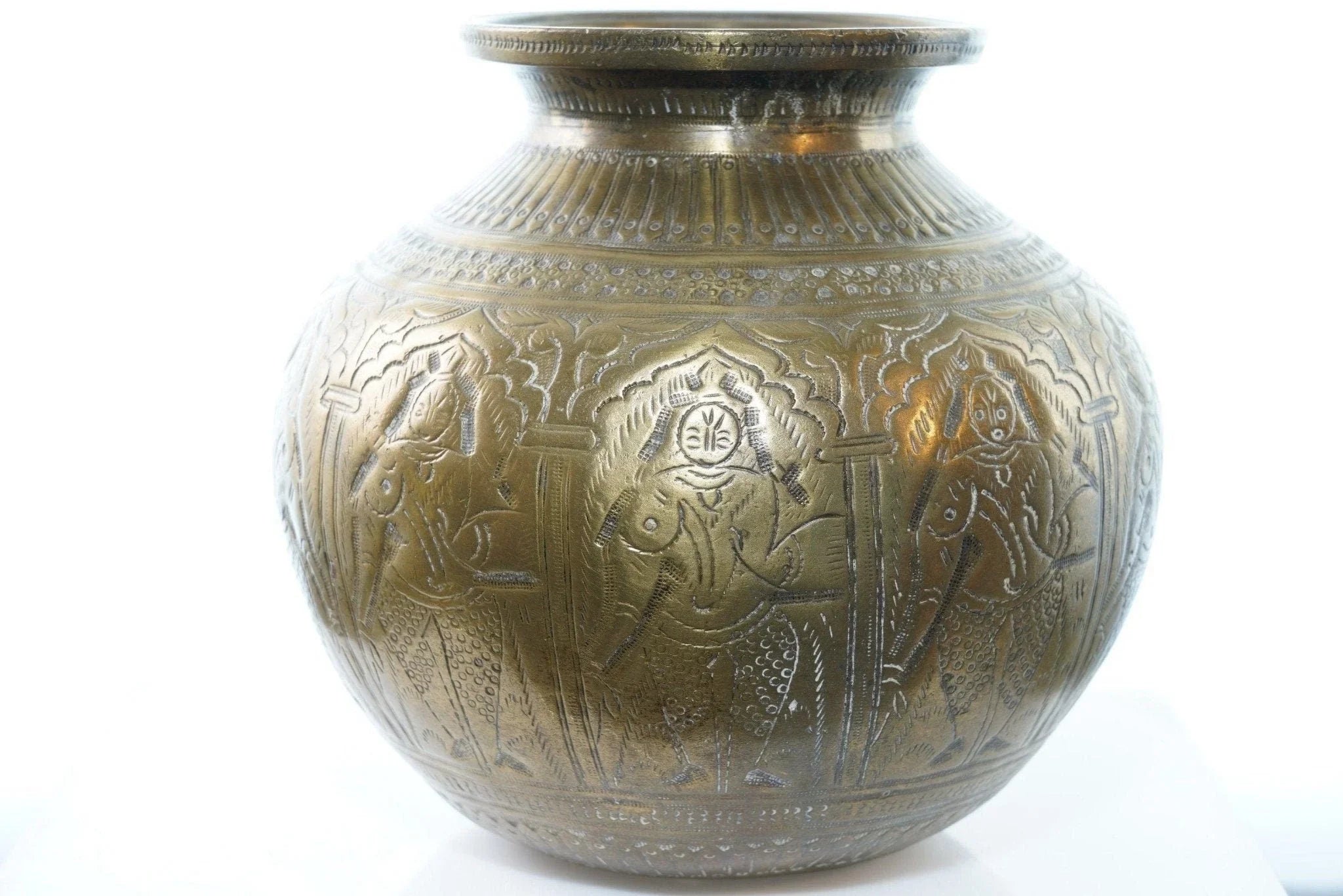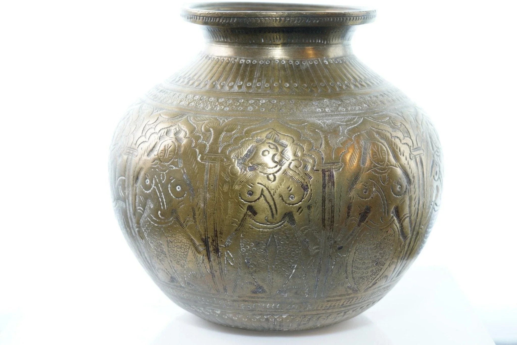 Antique Heavy Brass Jar with female figures. This came from a collection of<br>Mainly Indian antiques but there was some African also. Really he was an artist<br>so all over the place. I'm sure this is very old, well over 100 years likely<br>older. 6" tall x 6.5" wide, heavy for it's size. I'm assuming it was some sort<br>of ritutual or cooking pot.<br>isshelf