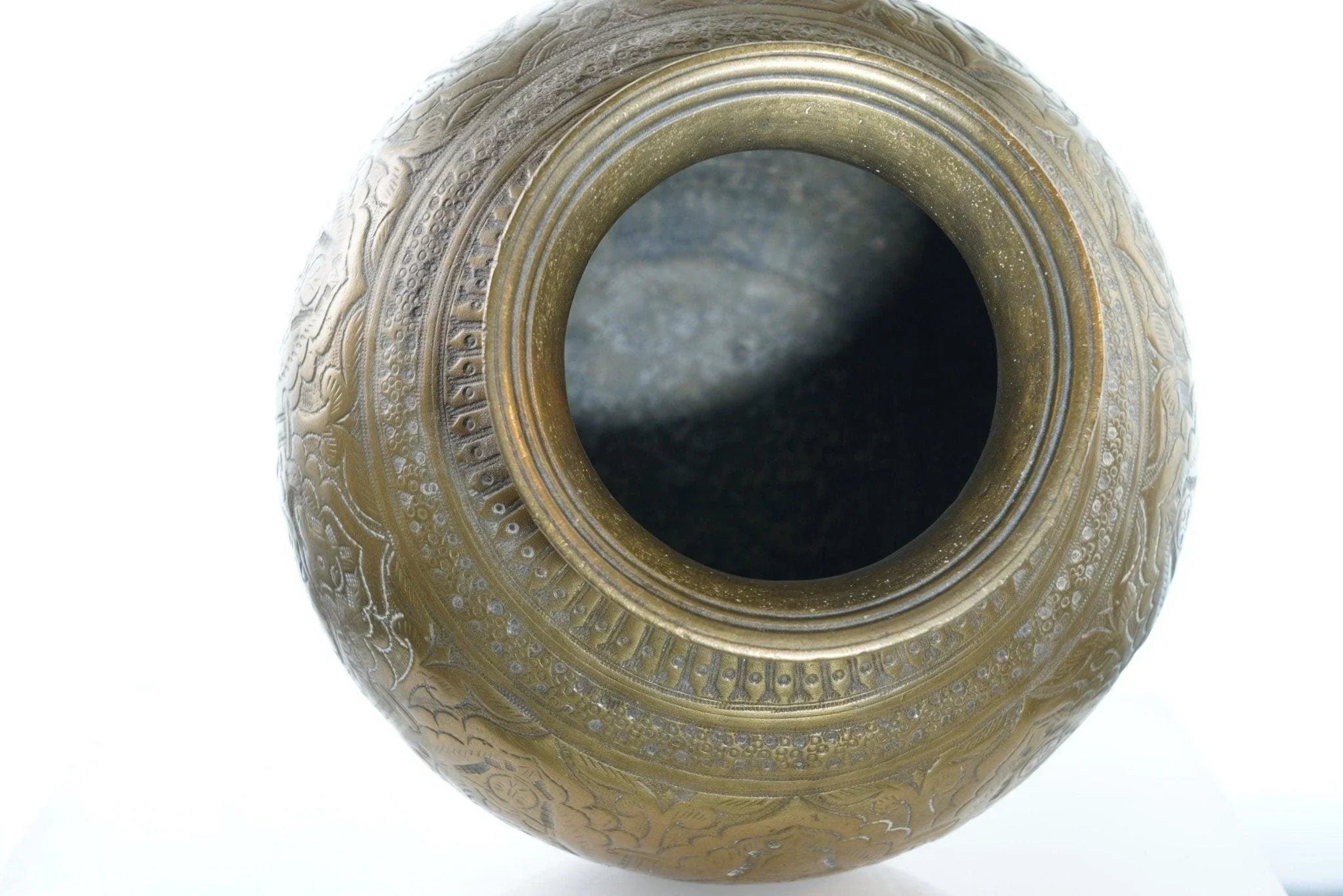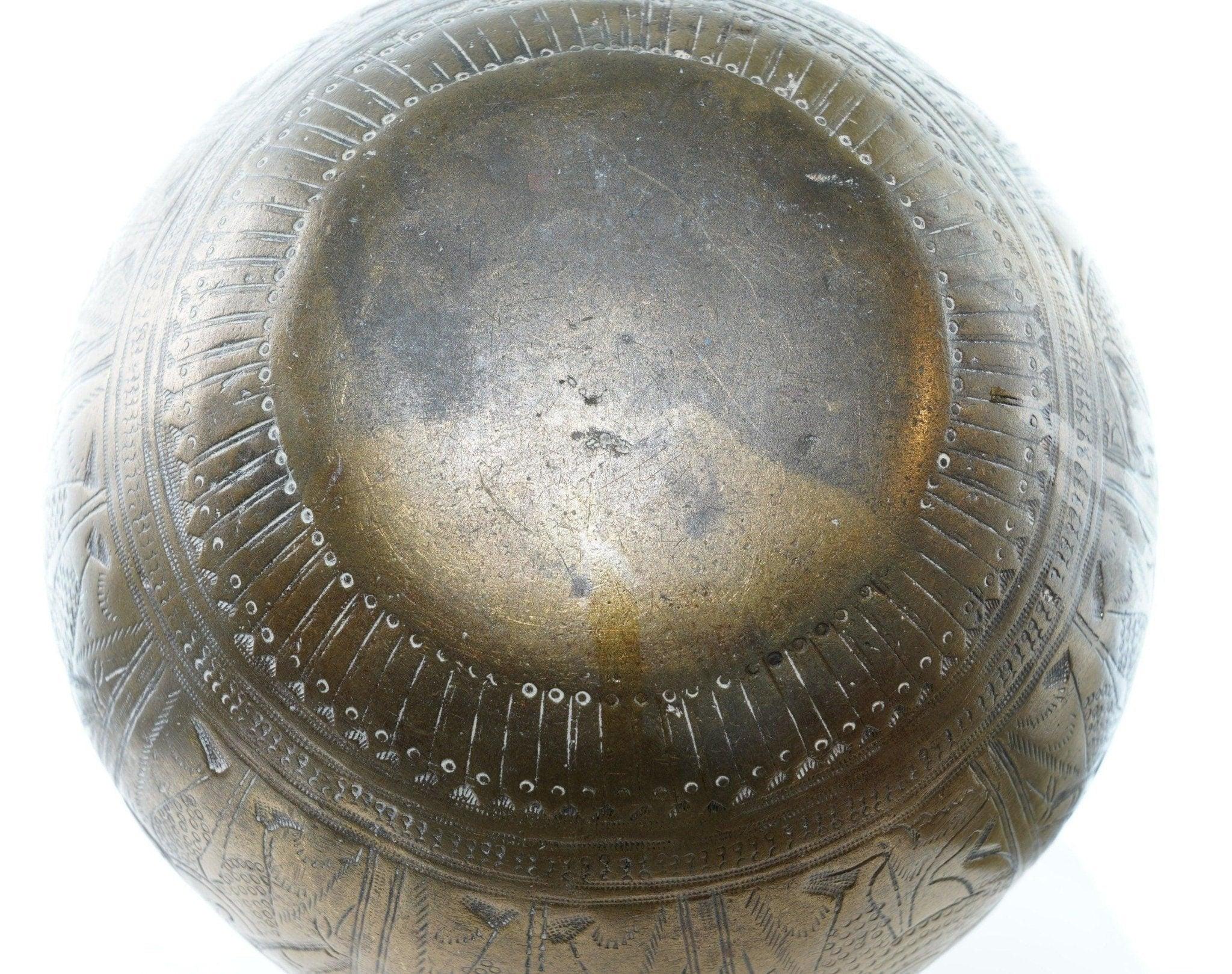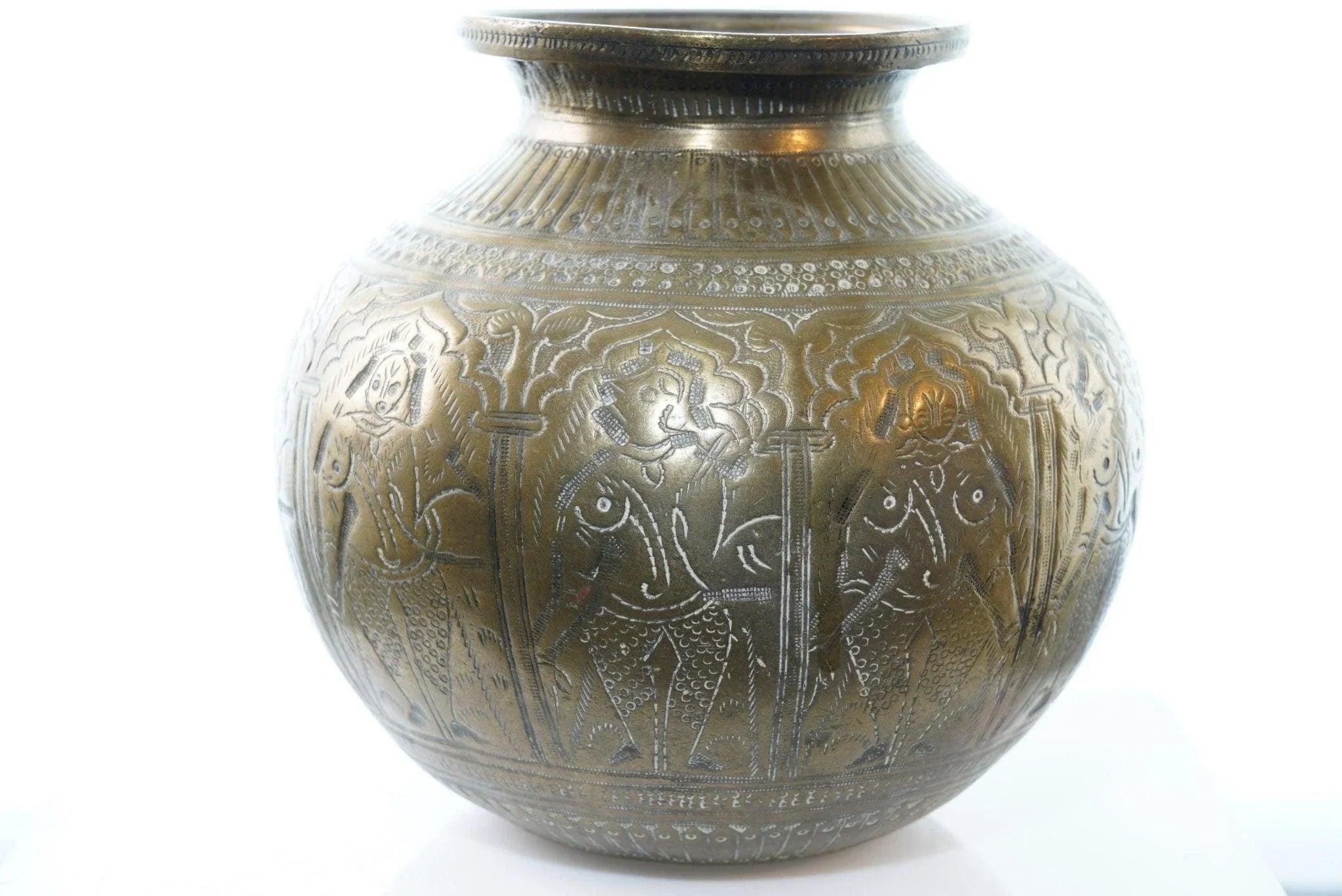 Antique Heavy Brass Jar with female figures. This came from a collection of<br>Mainly Indian antiques but there was some African also. Really he was an artist<br>so all over the place. I'm sure this is very old, well over 100 years likely<br>older. 6" tall x 6.5" wide, heavy for it's size. I'm assuming it was some sort<br>of ritutual or cooking pot.<br>isshelf