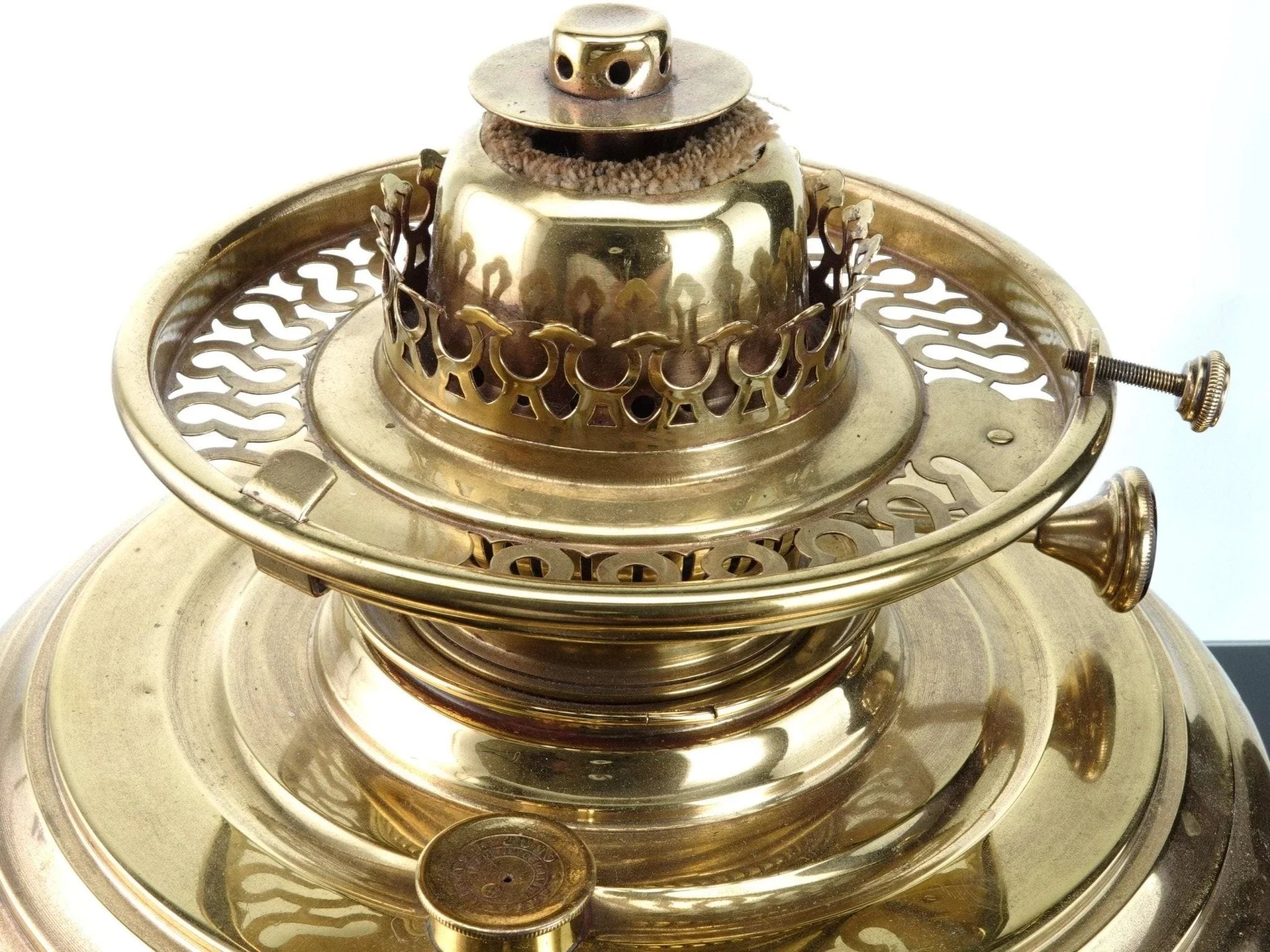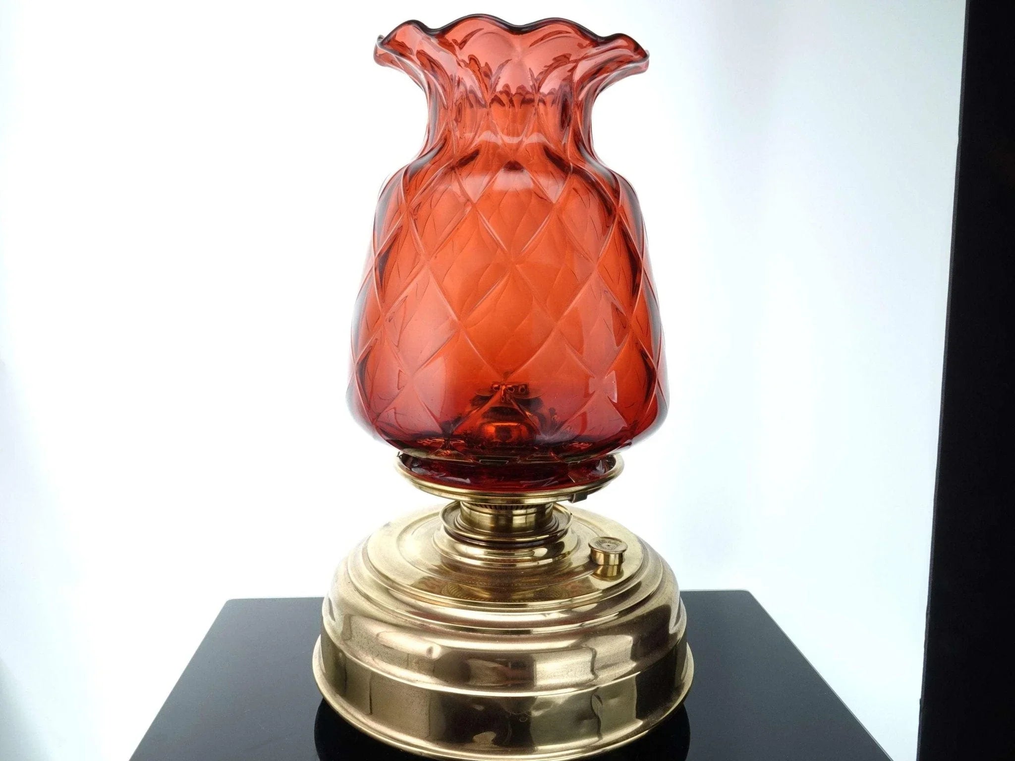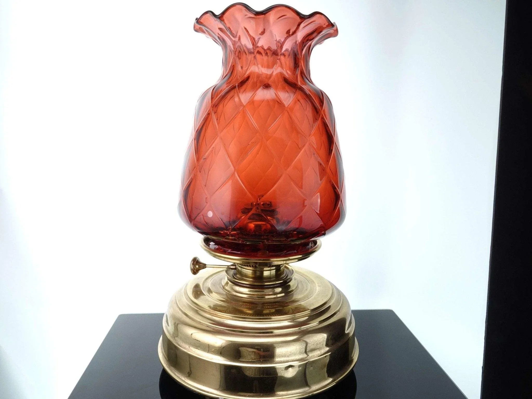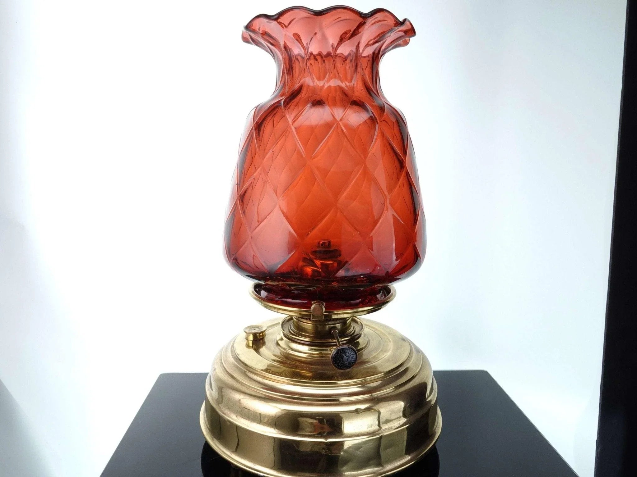 c1890 Huge Cranberry Optic Brass based Table Oil Lamp. This lamp is beyond incredible, the base was fully restored at one point, it works, holds oil, the knobs for the burner/wick work, The oil cap says Juno Safety lamp made in Germany. This unusual lamp was likely made for and used aboard a ship or Train, or maybe the banquet of a hotel. But I think with the ultra wide base it really has a transportation feel to it. Guaranteed well over 100 years old base and shade and most likely original to each other as they are an uncommon size. This globe is huge measuring 11.5" tall x 9.5" wide with a 6" fitter base at the bottom of the globe. It is near mint with one tiny flake where it fits on the lamp base shown in the last pic, no other chips, no cracks, no scratches. The brass base measures 11 3/8" wide x 8" tall. Total height about 18.5" This is a big fat lamp. A few small dents in the brass shouldn't be a distraction as it's totally wonderful and will light up every room even if not in use. Today with portable led's it would be so easy to light this up without actually doing the oil thing in a modern home. Obviously they will be packed to death, the shade in it's own box with tons of cushion, I ship things like this globally daily, thanks for your consideration.