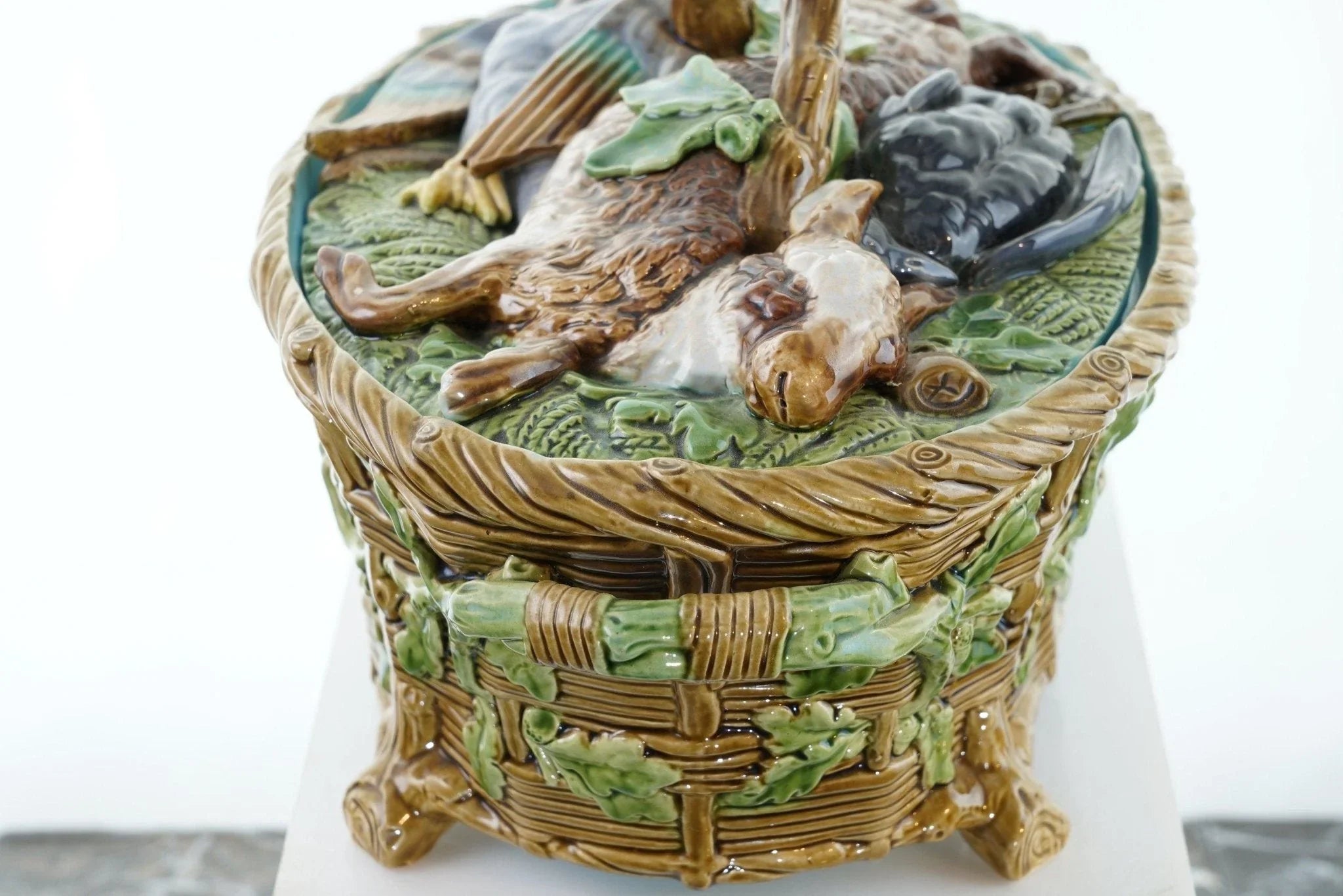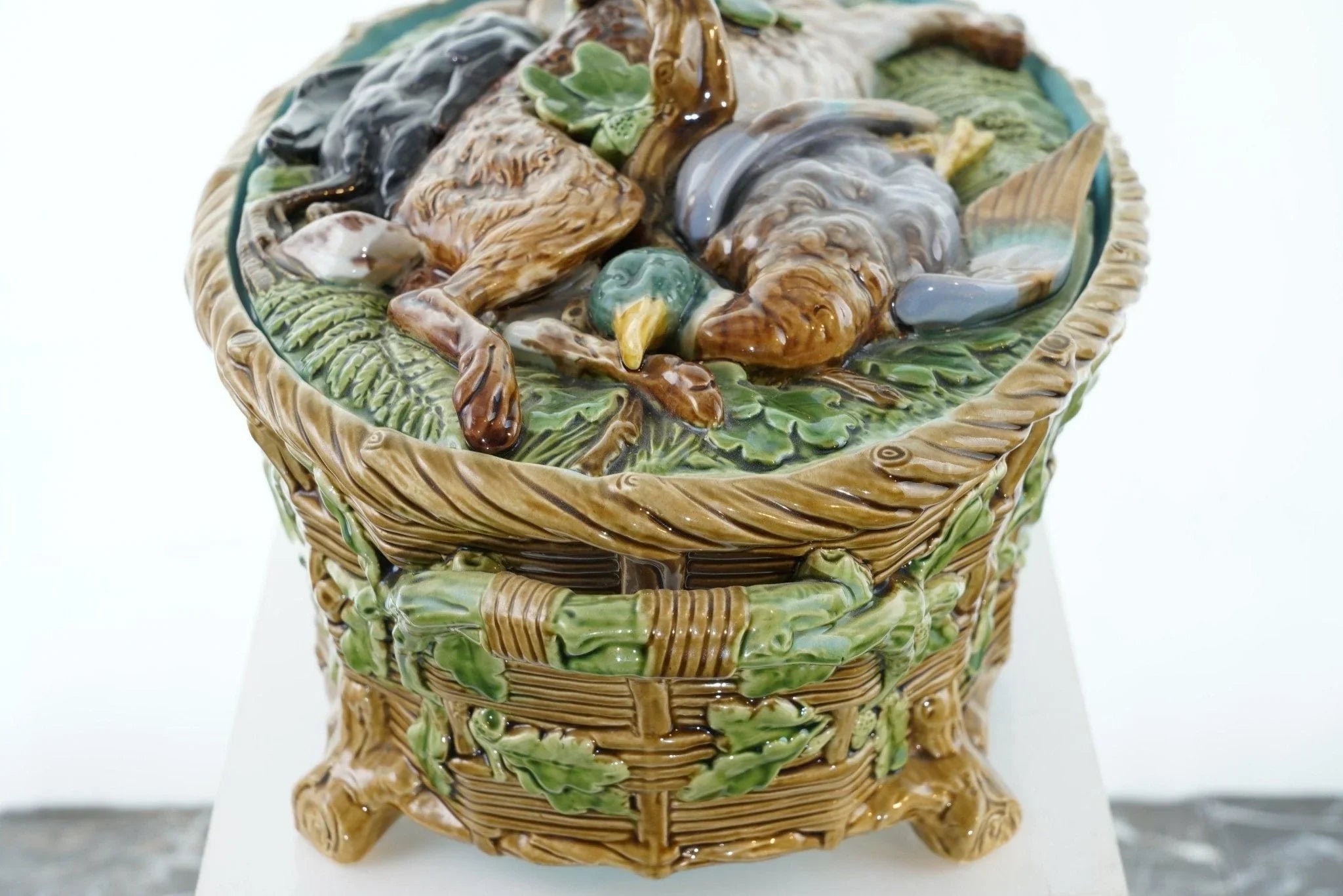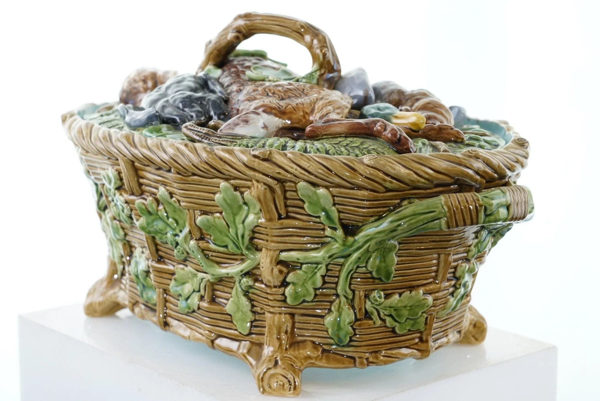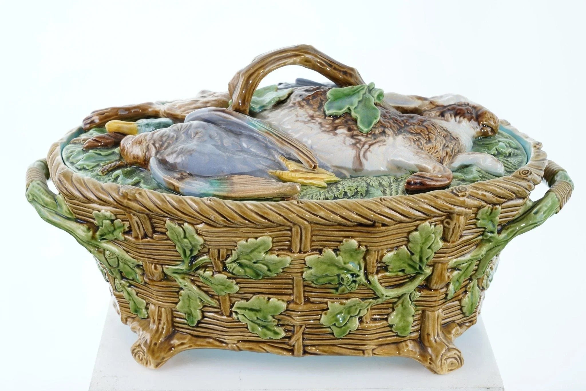 1860's Minton Majolica Game Pie Dish with lid. English Victorian majolica game-pie dish, Minton, c.1862, lid with game animals resting on ferns and leaves molded in relief, base modeled as a woven basket with oak branch handles, impressed mark Minton with date cypher, small area of restoration at tip of mallard's wing, approx 7"h, 13.25"l, 8"w, 6.25lbs. No damage or restorations other than the tip of the wing shown and described. isshelf