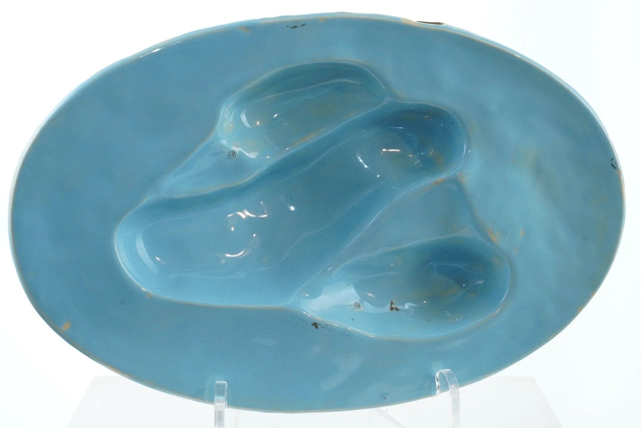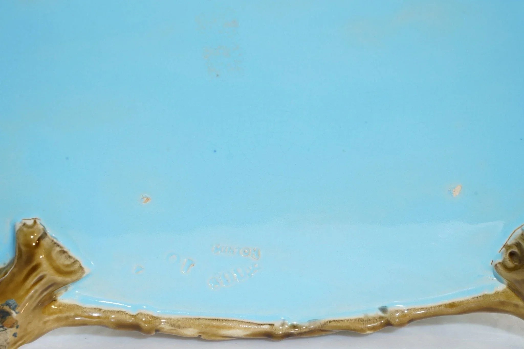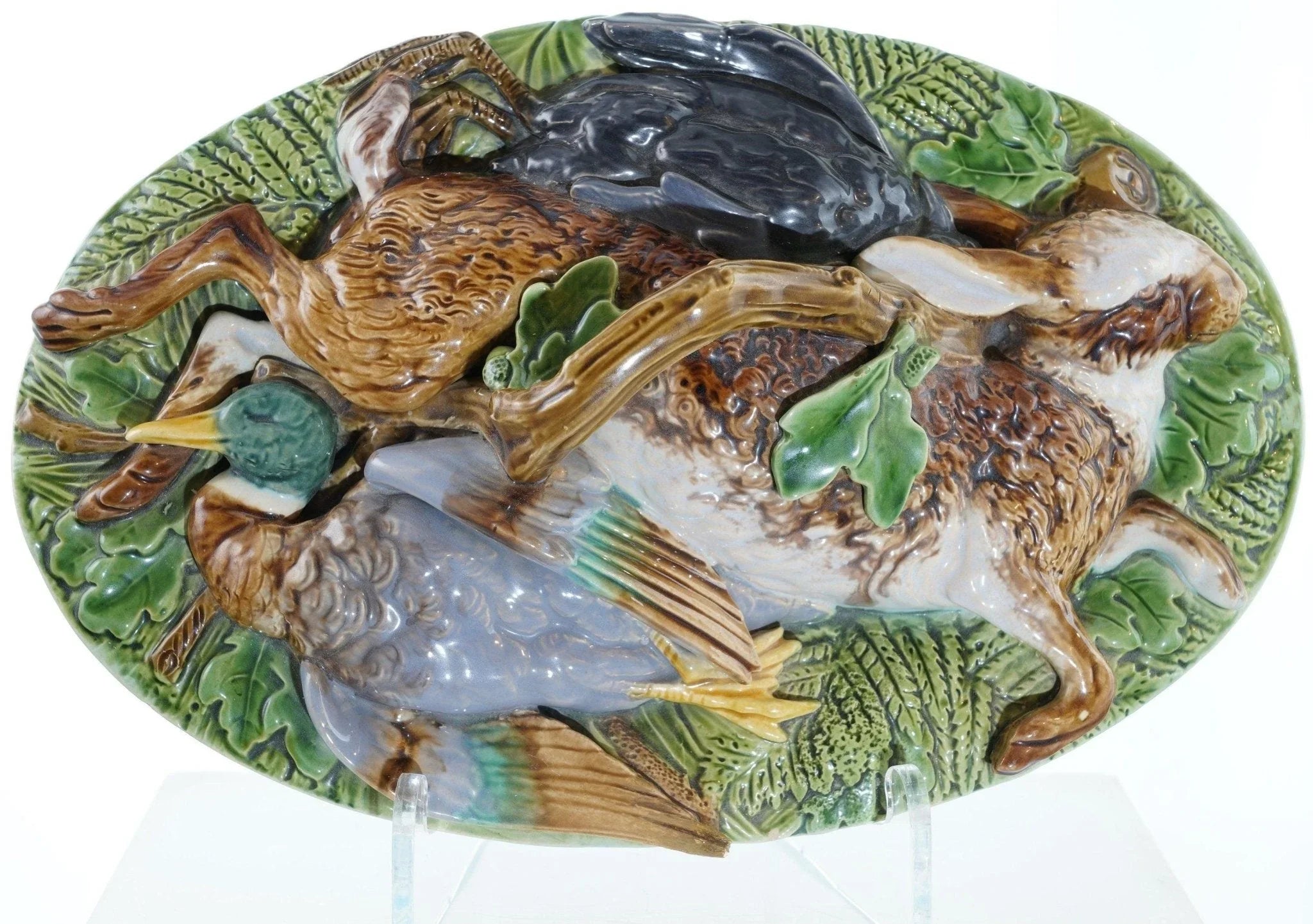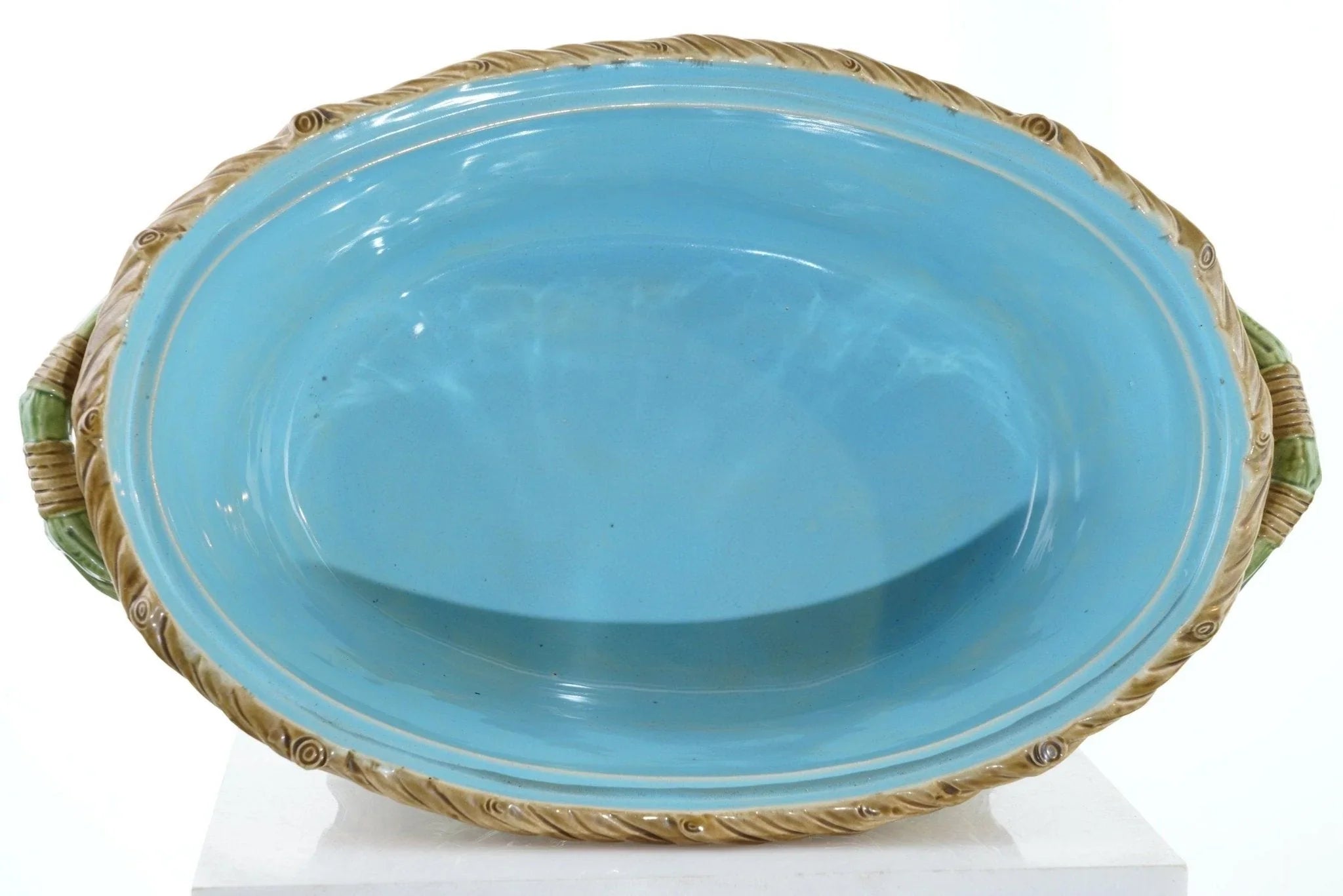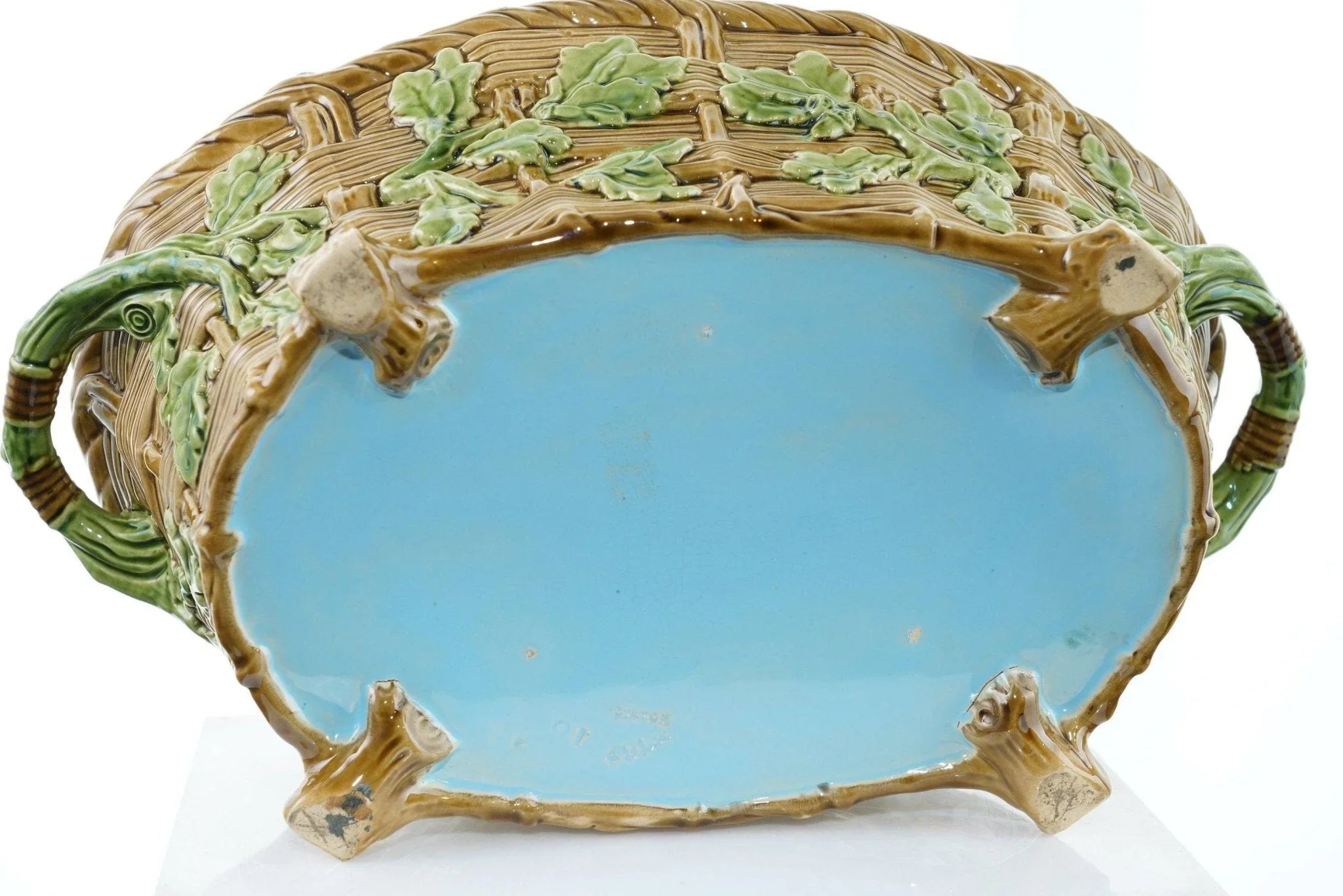 1860's Minton Majolica Game Pie Dish with lid. English Victorian majolica game-pie dish, Minton, c.1862, lid with game animals resting on ferns and leaves molded in relief, base modeled as a woven basket with oak branch handles, impressed mark Minton with date cypher, small area of restoration at tip of mallard's wing, approx 7"h, 13.25"l, 8"w, 6.25lbs. No damage or restorations other than the tip of the wing shown and described. isshelf