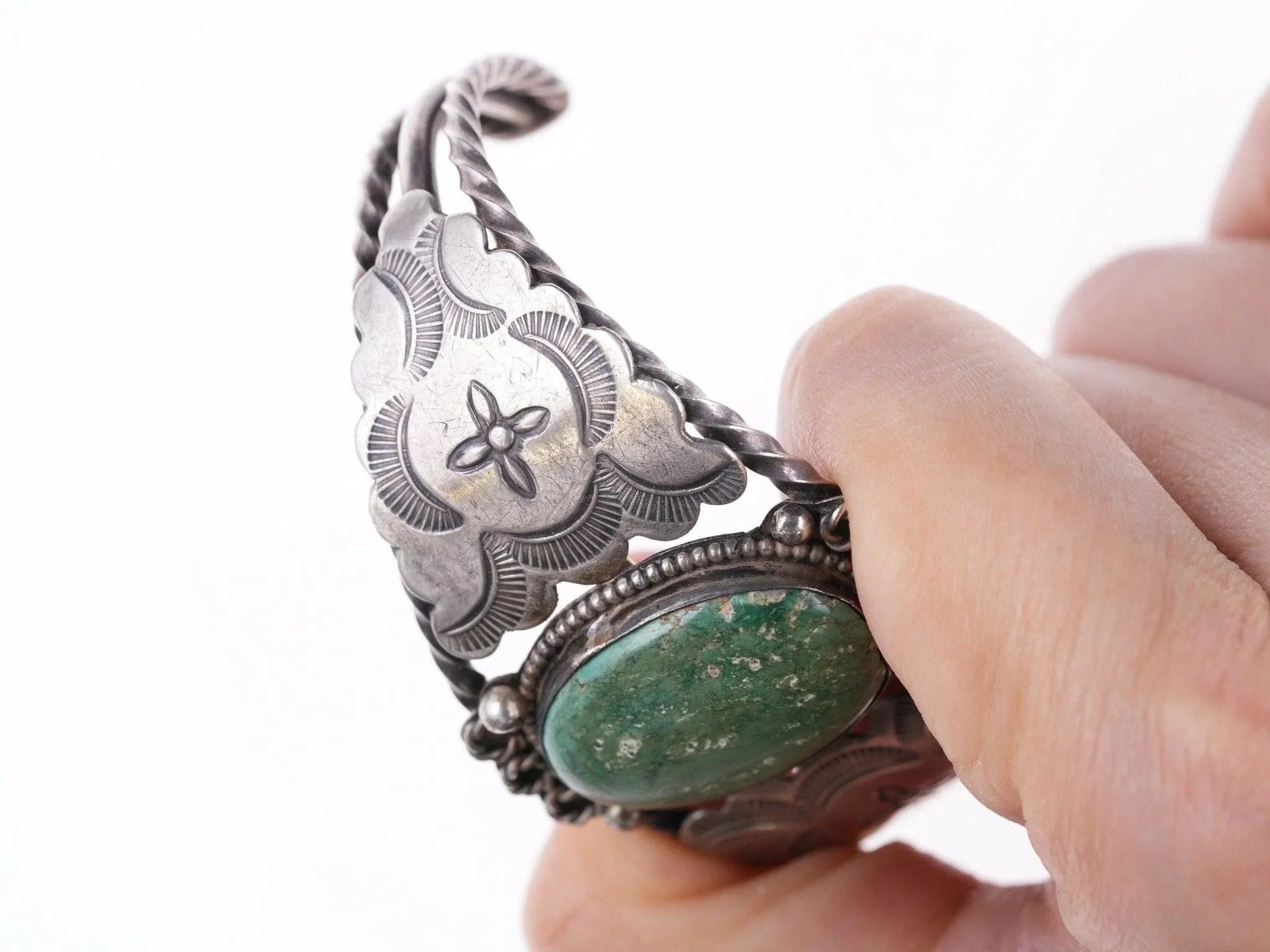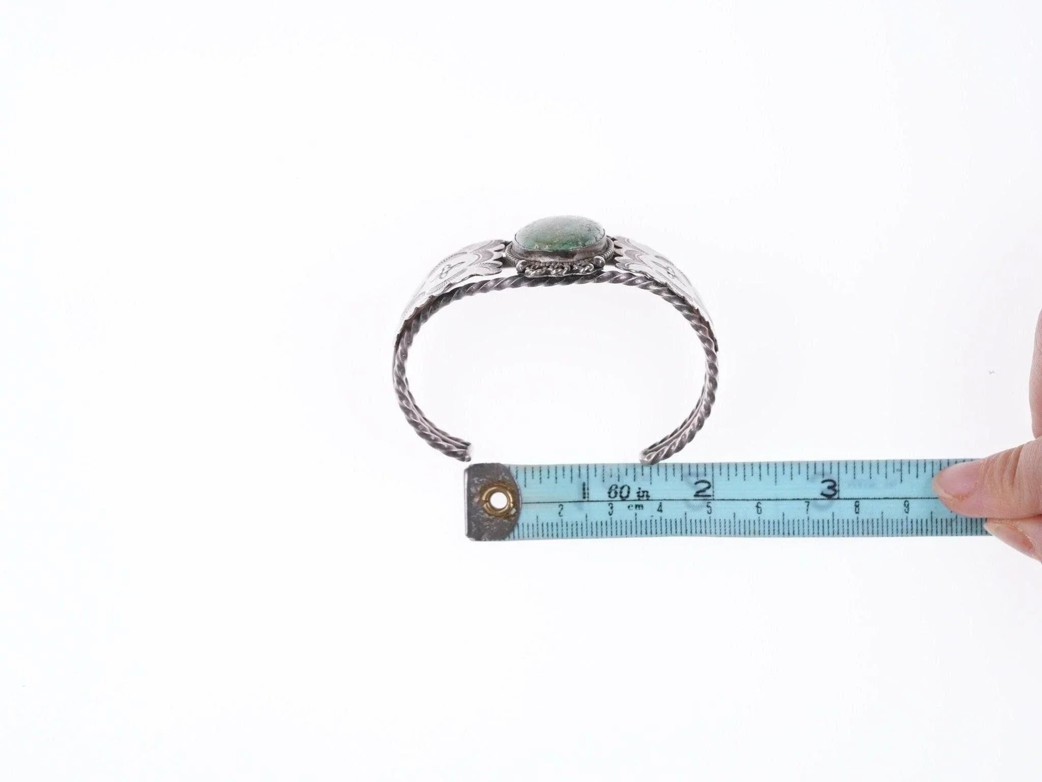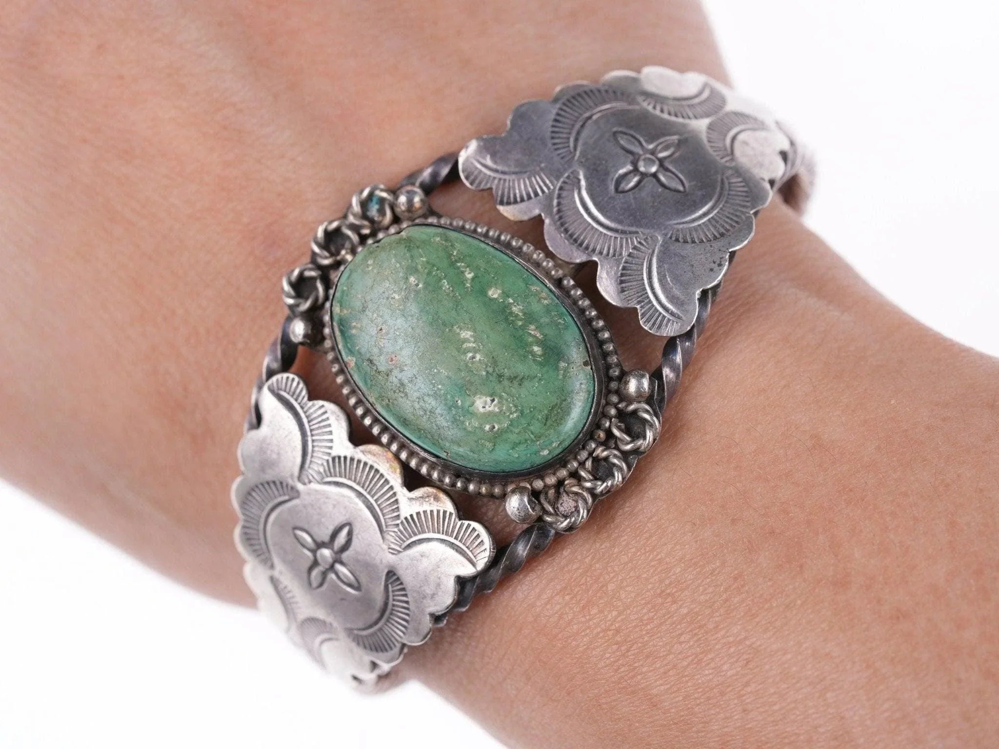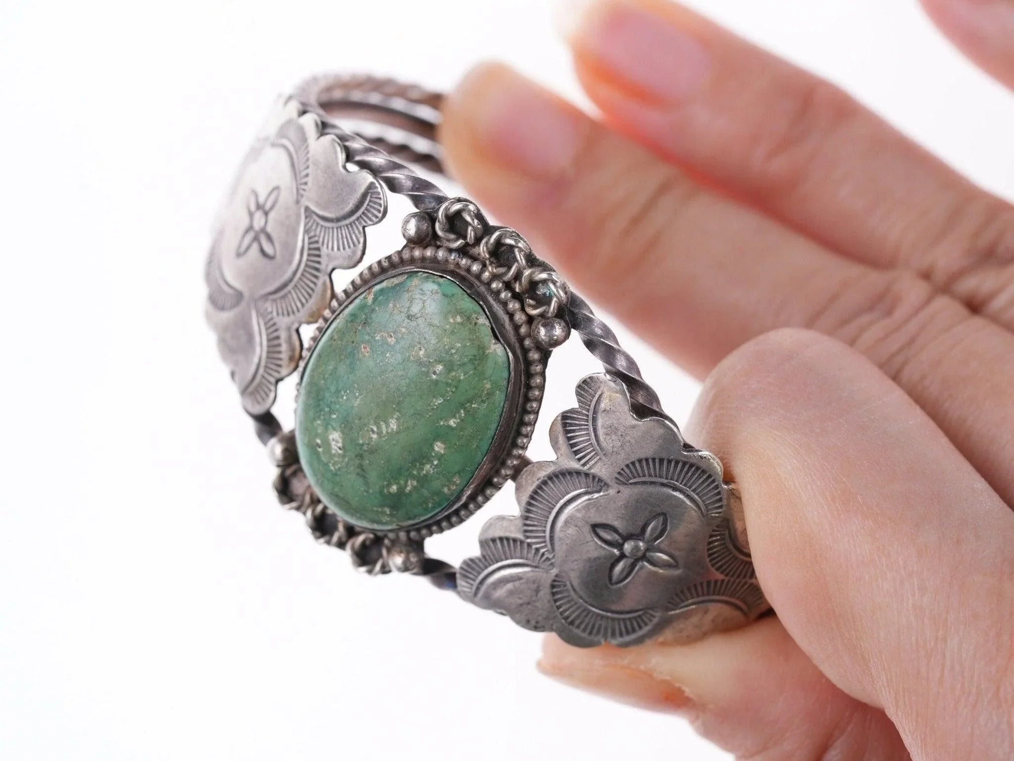 6 3/8" c1940's Navajo stamped silver and turquoise bracelet<br><br>Established in the 1930s in Albuquerque, New Mexico, Bell Trading Post was<br>primarily known for its manufactured southwestern style jewelry that was<br>assembled and decorated by Native Americans. These souvenir jewelry pieces were<br>sold to tourists at their store on Rt. 66 and other tourist shops across the<br>Southwest. The company's name changed to Sunbell Corporation in 1969, and it<br>ceased operations in the late 1980s.<br><br>All precious metals are tested and guaranteed, any Native American jewelry<br>referred to as Silver or Sterling is guaranteed to be a minimum of 90% (coin)<br>silver and possibly higher content. Anything marked is guaranteed to be what<br>it's marked, most bracelets are photographed on a 6" wrist (non hairy), rings<br>photographed on the appropriate sized finger when possible. With bracelets if<br>the measurement is not given in the description then inside circumference is<br>shown where the metal meets the number on the the cloth tape measure.
