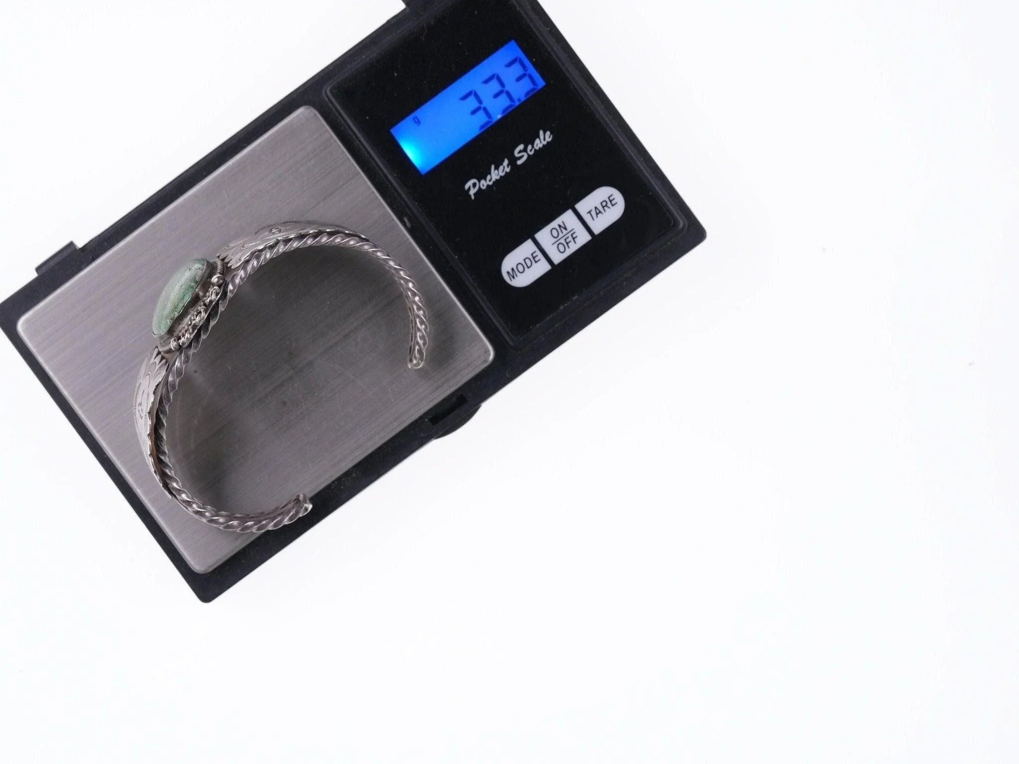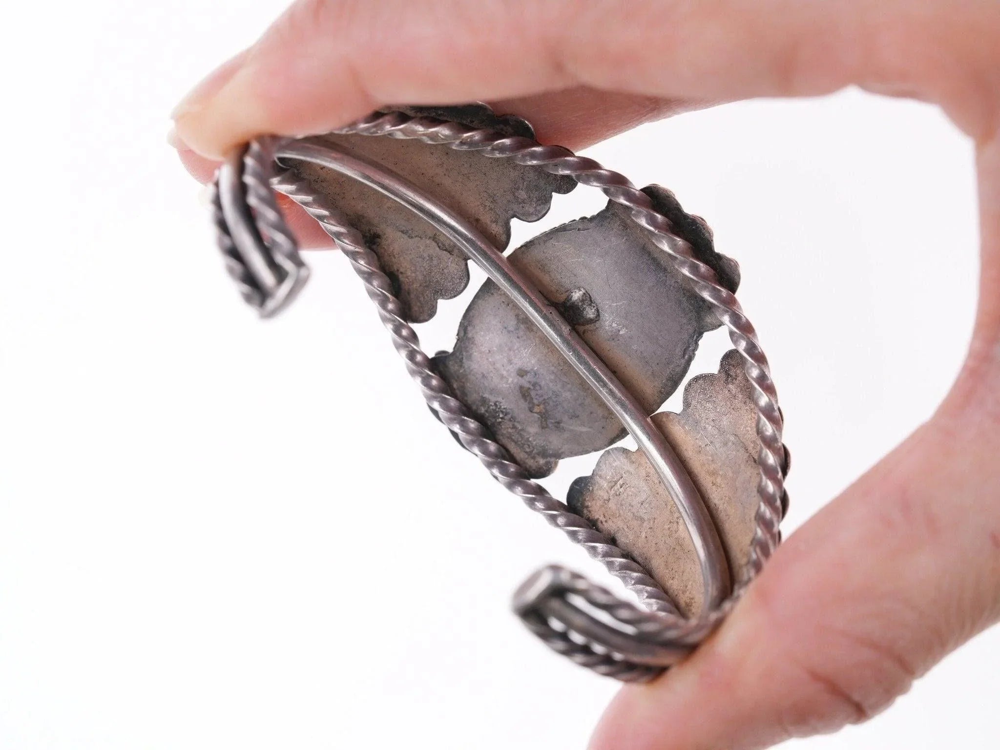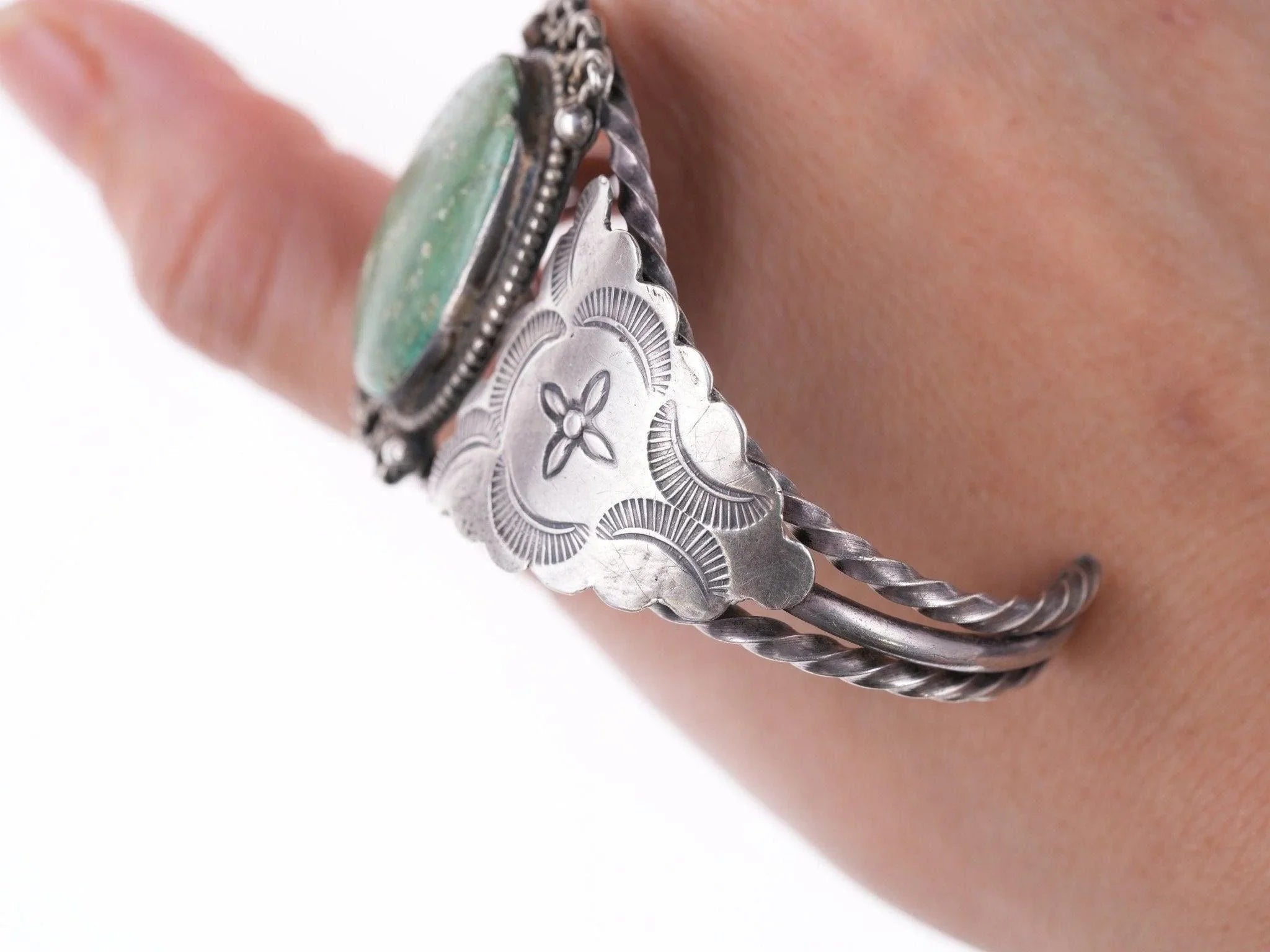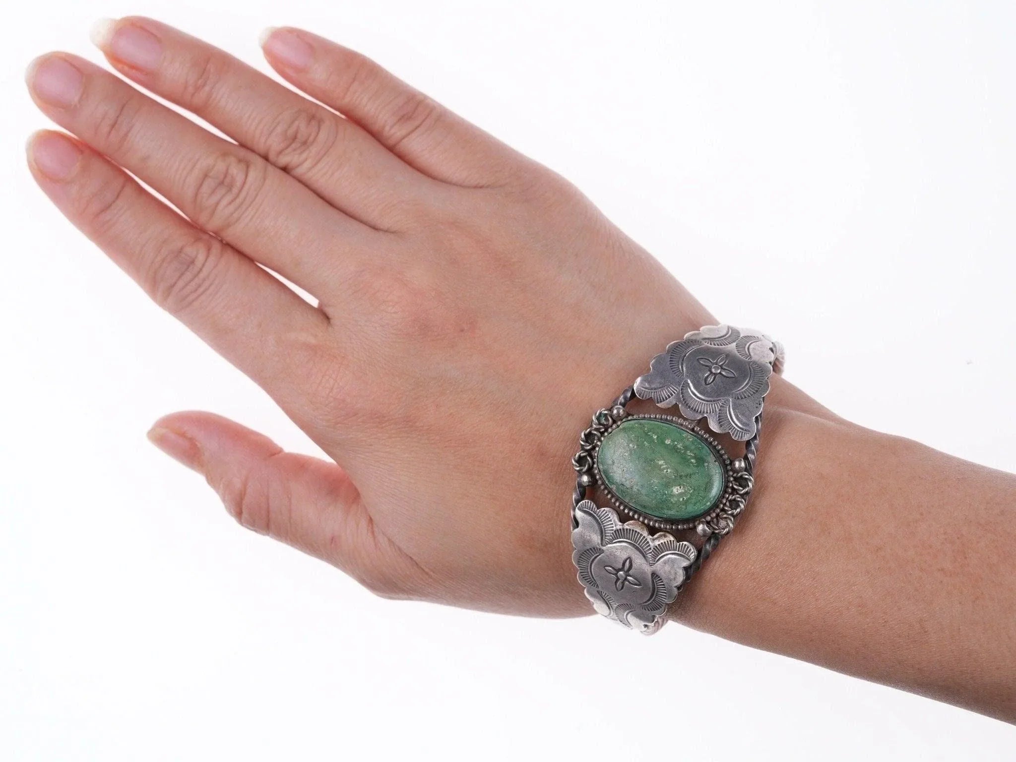 6 3/8" c1940's Navajo stamped silver and turquoise bracelet<br><br>Established in the 1930s in Albuquerque, New Mexico, Bell Trading Post was<br>primarily known for its manufactured southwestern style jewelry that was<br>assembled and decorated by Native Americans. These souvenir jewelry pieces were<br>sold to tourists at their store on Rt. 66 and other tourist shops across the<br>Southwest. The company's name changed to Sunbell Corporation in 1969, and it<br>ceased operations in the late 1980s.<br><br>All precious metals are tested and guaranteed, any Native American jewelry<br>referred to as Silver or Sterling is guaranteed to be a minimum of 90% (coin)<br>silver and possibly higher content. Anything marked is guaranteed to be what<br>it's marked, most bracelets are photographed on a 6" wrist (non hairy), rings<br>photographed on the appropriate sized finger when possible. With bracelets if<br>the measurement is not given in the description then inside circumference is<br>shown where the metal meets the number on the the cloth tape measure.