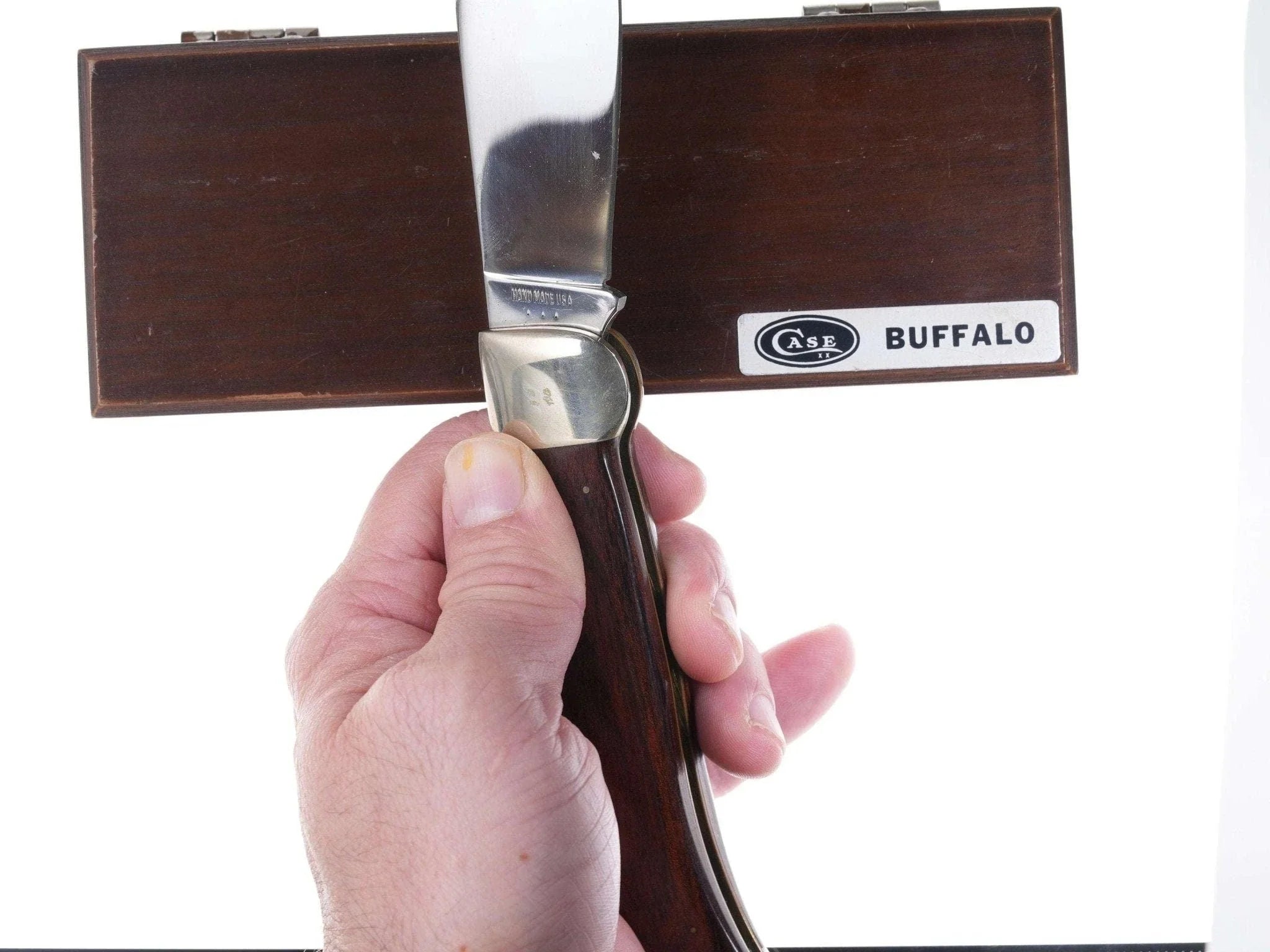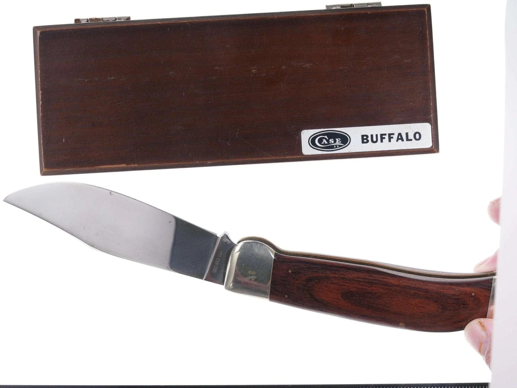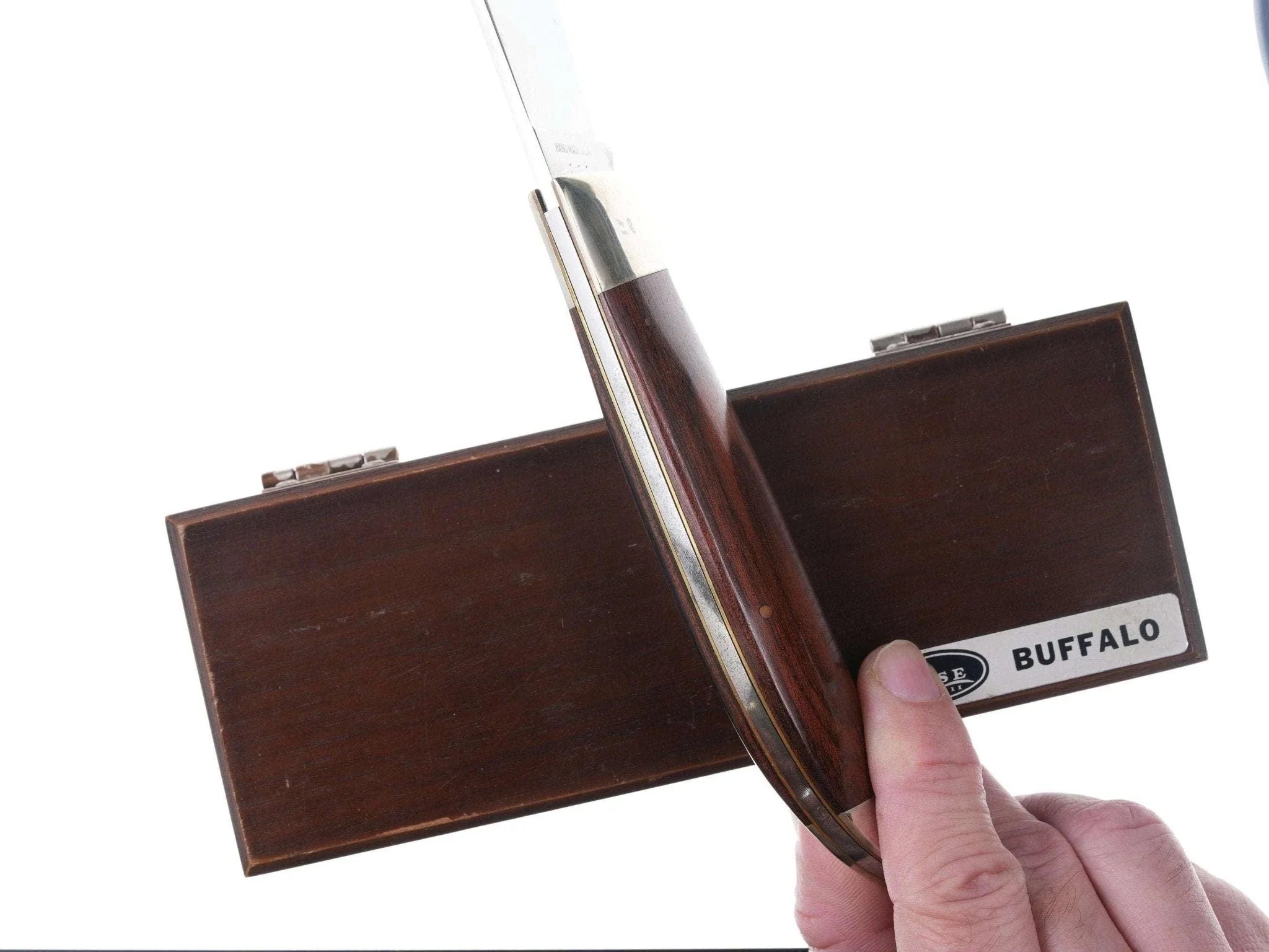 Large 1970's Case Buffalo knife in wood presentation box, appears unused and unsharpened. Sight oxidation in places but overall clean and untouched by me. 9.75" total length, 4.5" blade. trinketdrawer