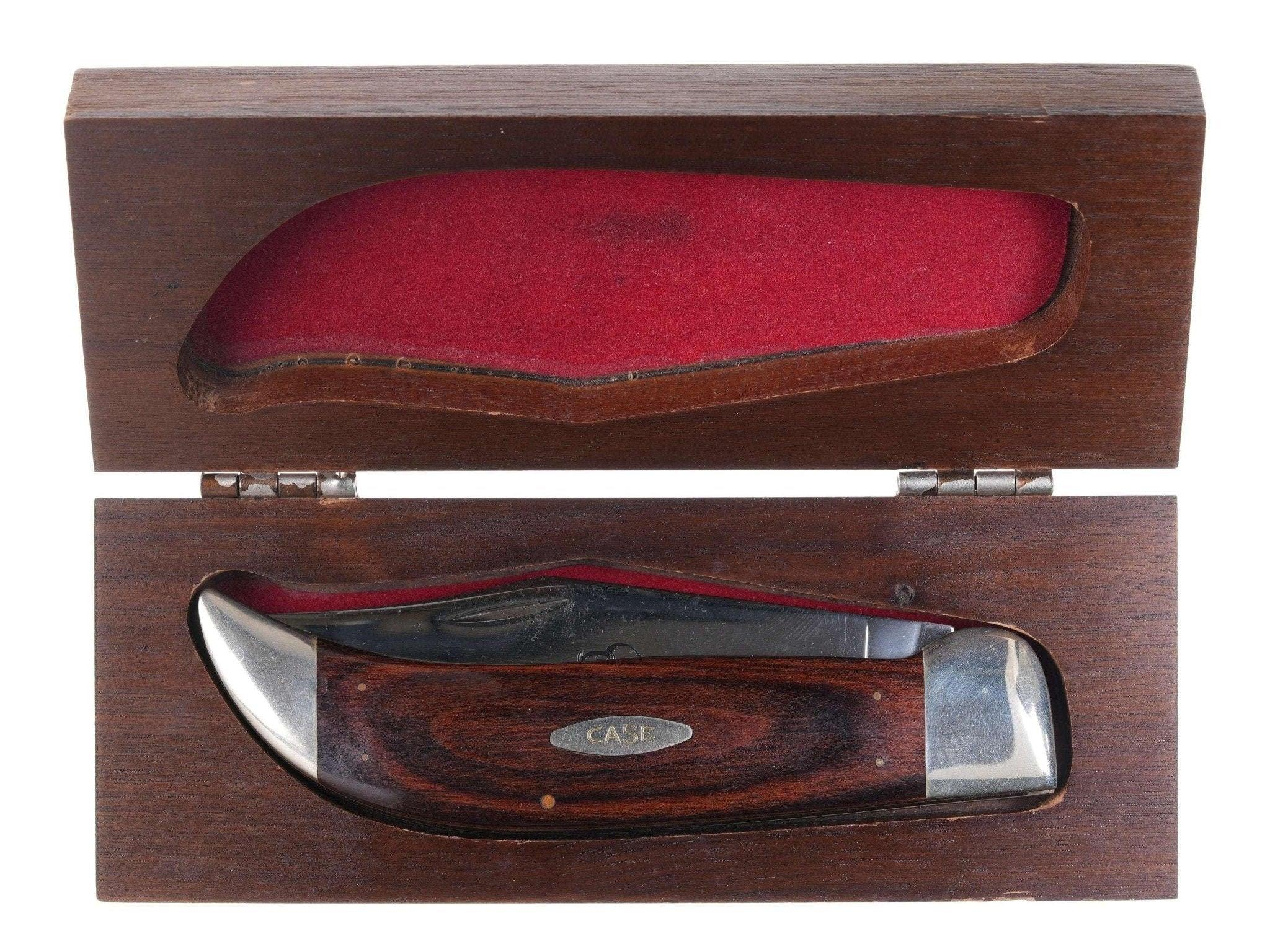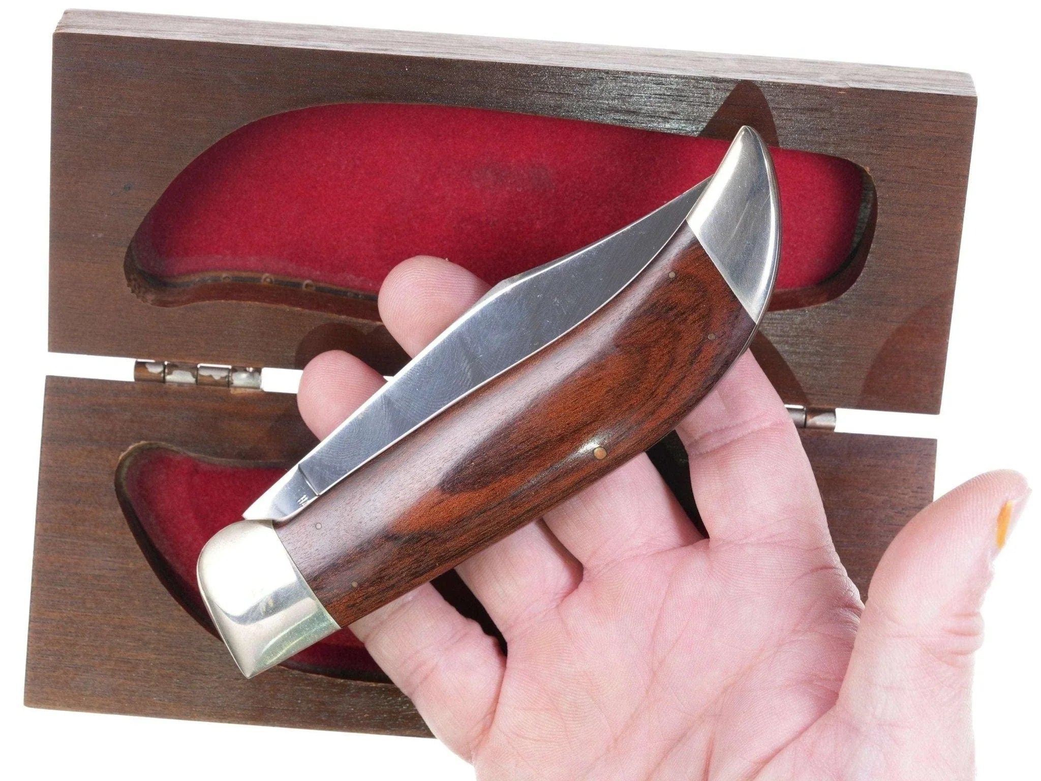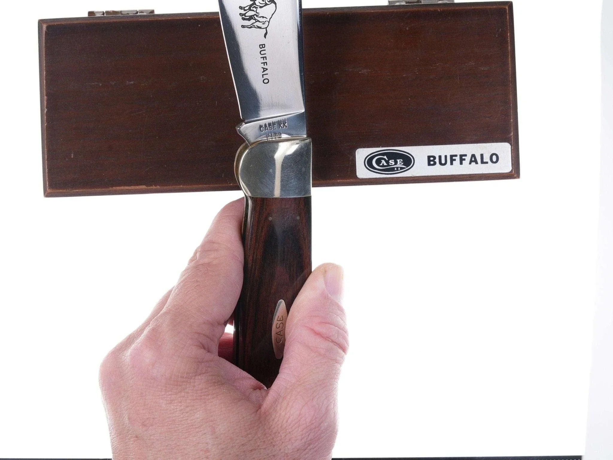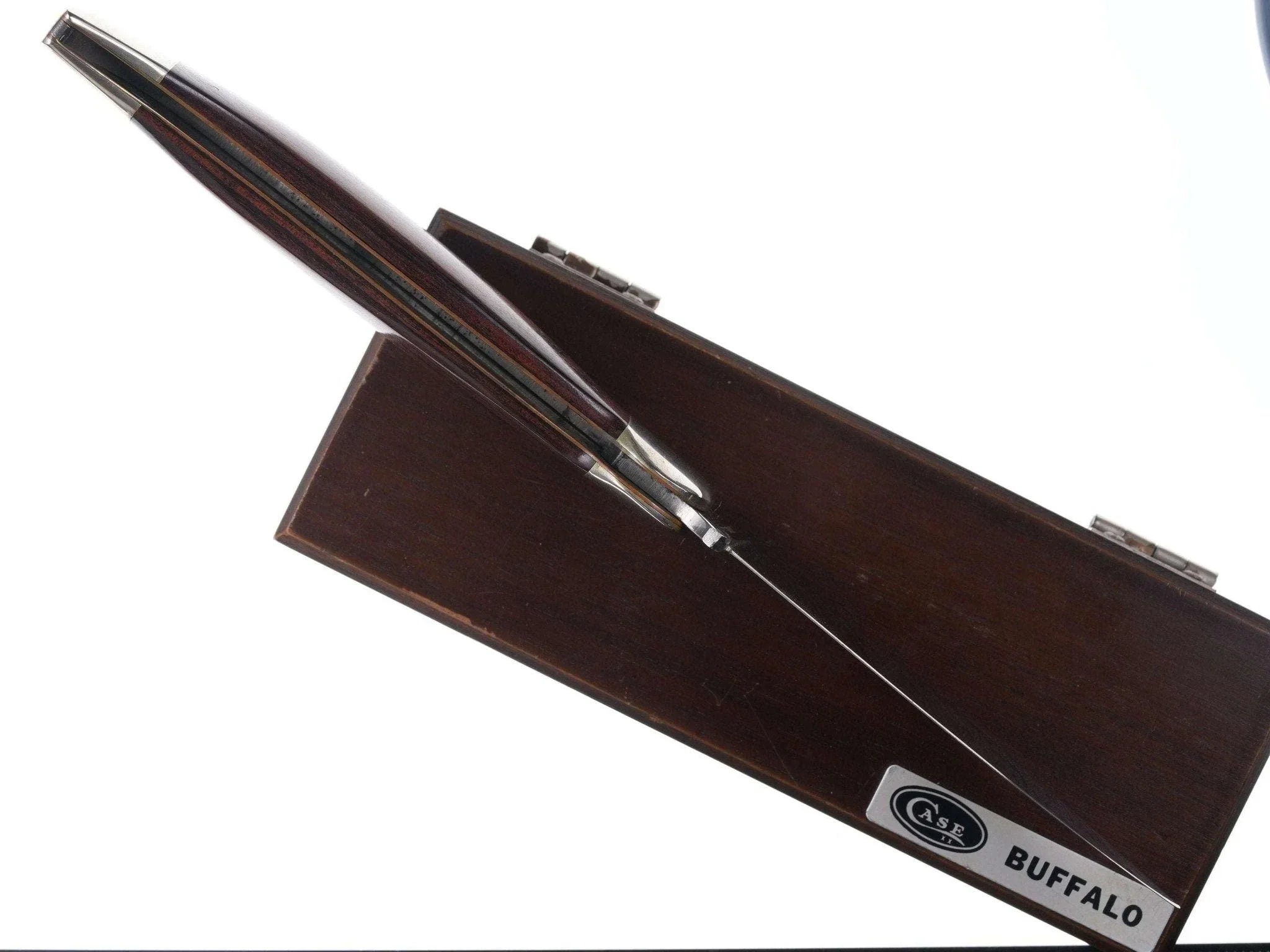 Large 1970's Case Buffalo knife in wood presentation box, appears unused and unsharpened. Sight oxidation in places but overall clean and untouched by me. 9.75" total length, 4.5" blade. trinketdrawer