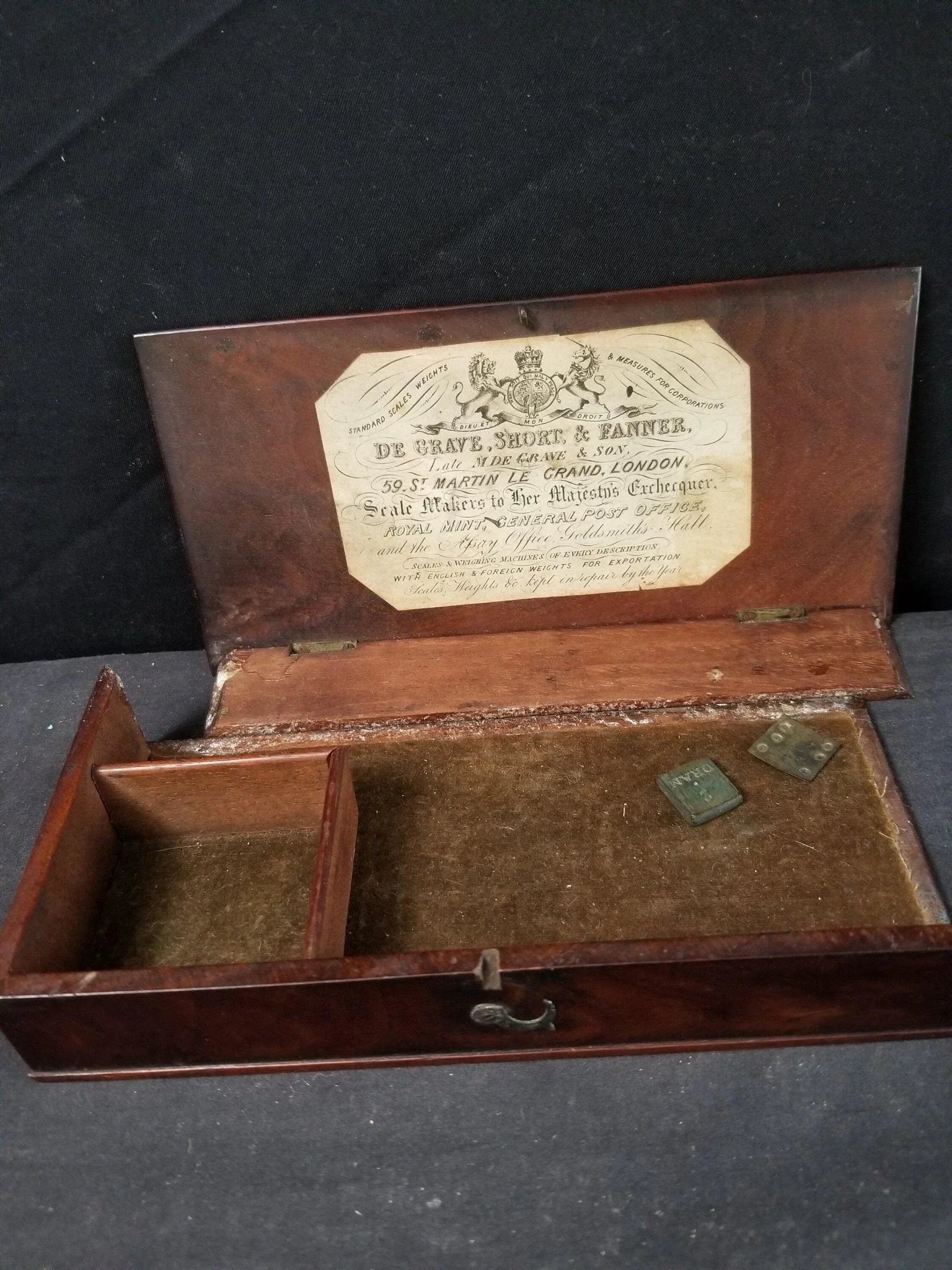 Antique De Grave, Short, & Fanner Portable Gold/Apothecary Scales c.1850. Scales have no issues, box is missing one side and could use some glue. De Grave, Short and Fanner of 59 St. Martin's-le-Grand Previously De Grave, Short and Co 1845 presumably William Fanner joined and the firm became De Grave, Short and Fanner[1] By 1851 William Fanner, scale maker, was living at 59 St Martins with his family[2] 1851 De Grave, Short and Fanner exhibited at the Great Exhibition 1857 Partnership dissolved. '...the Partnership heretofore subsisting between us the undersigned, Samuel Robinson Shortand William Fanner, lately carrying on business as Scale Makers, under the style or firm of De Grave, Short, and Fanner, at No. 59, Saint Martin's-Le-Grand, in the city of London, has this day been dissolved by mutual consent; and all debts due to or from the said late copartnership will be respectively received and paid by the said Samuel Robinson Short, by whom alone the said business will in future be carried on...'[3] 1863 Mention in bankruptcy proceedings of 'Samuel Robinson Short, of the firm of Degraves, Short, and Farmer, of St. Martin's-le-Grand, in the said city of London, Scale Manufacturers'[4] 1871 William Fanner died. From 1871 onwards the company was De Grave, Short and Co. Tw62